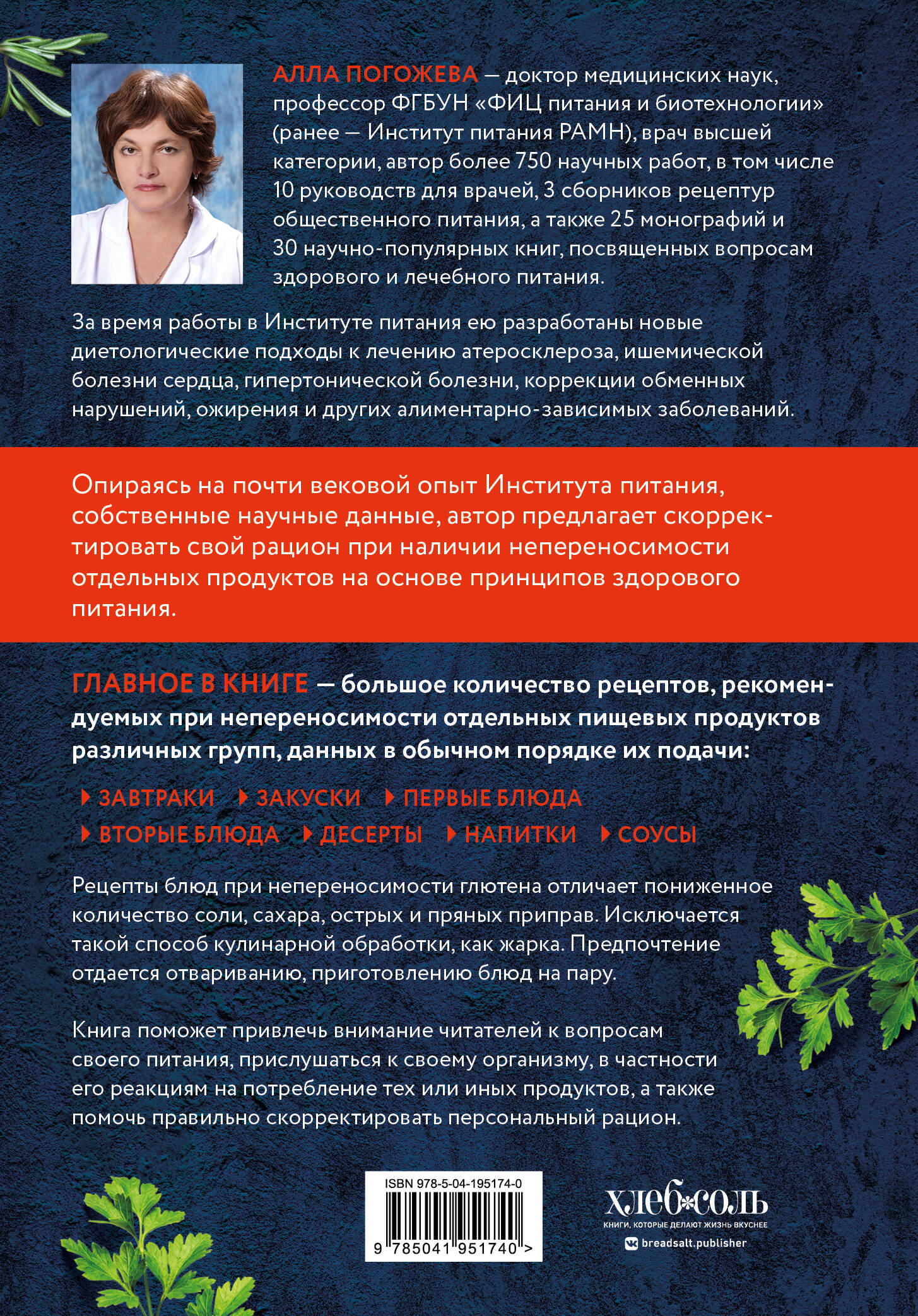 Алла Владимировна Погожева - доктор медицинских наук, профессор ФГБУН «ФИЦ питания и биотехнологии» (ранее - Институт питания РАМН), врач высшей категории, автор более 750 научных работ, в том числе 10 руководств для врачей, 3 сборников рецептур общественного питания, а также 25 монографий и 30 научно-популярных книг, посвященных вопросам здорового и лечебного питания. За время работы в Институте питания ею разработаны новые диетологические подходы к лечению атеросклероза, ишемической болезни сердца, гипертонической болезни, коррекции обменных нарушений, ожирения и других алиментарно-зависимых заболеваний. Опираясь на почти вековой опыт Института питания, собственные научные данные, автор предлагает скорректировать свой рацион при наличии непереносимости к отдельным продуктам на основе принципов здорового питания. Главное в книге - большое количество рецептов, рекомендуемых при непереносимости отдельных пищевых продуктов различных групп, данных в обычном порядке их подачи - завтраки, закуски, первые блюда, вторые блюда, десерты, напитки, соусы. Рецепты блюд при непереносимости глютена отличают пониженное количество соли, сахара, острых и пряных приправ. Исключается такой способ кулинарной обработки, как жарка. Предпочтение отдается отвариванию, приготовлению блюд на пару. Книга поможет привлечь внимание читателей к вопросам своего питания, прислушаться к своему организму, в частности его реакциям на потребление тех или иных продуктов, а также помочь правильно скорректировать персональный рацион.| Издательство | ООО "Издательство "Эксмо" |