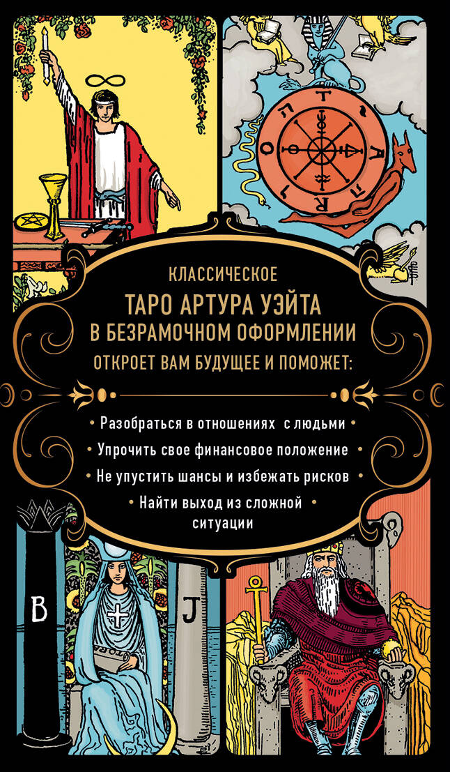 Современная безрамочная версия самой знаменитой колоды Таро, созданной в 1909 году британским мистиком Артуром Эдвардом Уэйтом и художницей Памелой Колман-Смит. Эта колода подойдет всем, кто хочет освоить искусство гадания и открыть для себя безграничный мир Таро, полный тайн и глубокого символизма. Набор для гадания «Безграничное Таро» включает в себя: • 22 карты Старших Арканов; • 56 карт младших Арканов; • 2 дополнительные пустые карты, расширяющие возможности гадания; • лаконичное руководство со значениями всех Старших и Младших арканов и схемами самых эффективных и популярных раскладов. Карты Таро помогут вам обрести уверенность в будущем и найти свое предназначение, разобраться в отношениях с людьми, упрочить свое финансовое положение, найти выход из сложной ситуации - и многое другое!| Издательство | ООО "Издательство "Эксмо" |