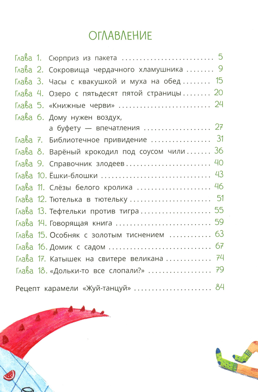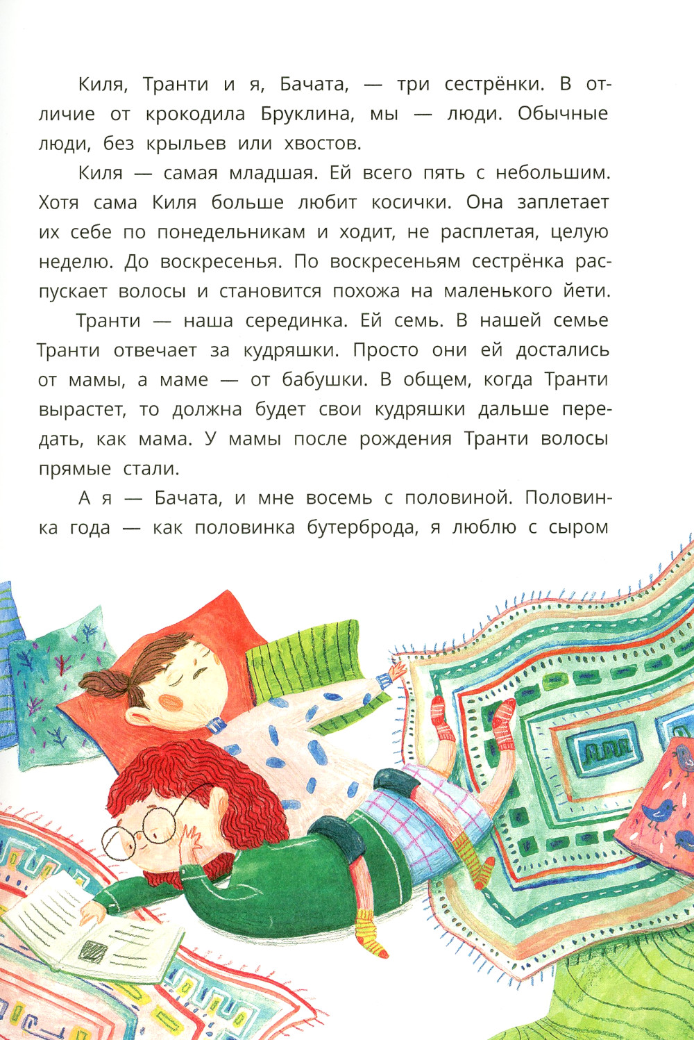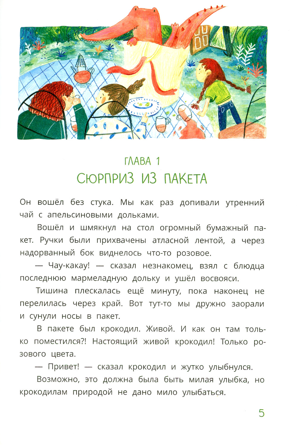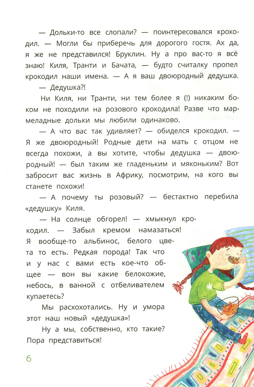 Три сестрёнки, Киля, Транти и Бачата, живут в удивительном доме. В нём стены, пол и потолок покрыты мягким зелёным мхом, буфет выдаёт обед на свой вкус, дверь в библиотеку похожа на книжный корешок, а старый сундук умеет щёлкать орехи… Но девочки и не подозревают, что их дом особенный, - привыкли! Однажды утром у них на кухне появляется розовый крокодил по имени Бруклин, а из книжек домашней библиотеки начинают бесследно исчезать самые интересные страницы. Что происходит? Где искать страницы и кому они могли понадобиться? Сестрёнки идут по следу таинственного похитителя, а заодно пытаются выяснить - где же они живут на самом деле?