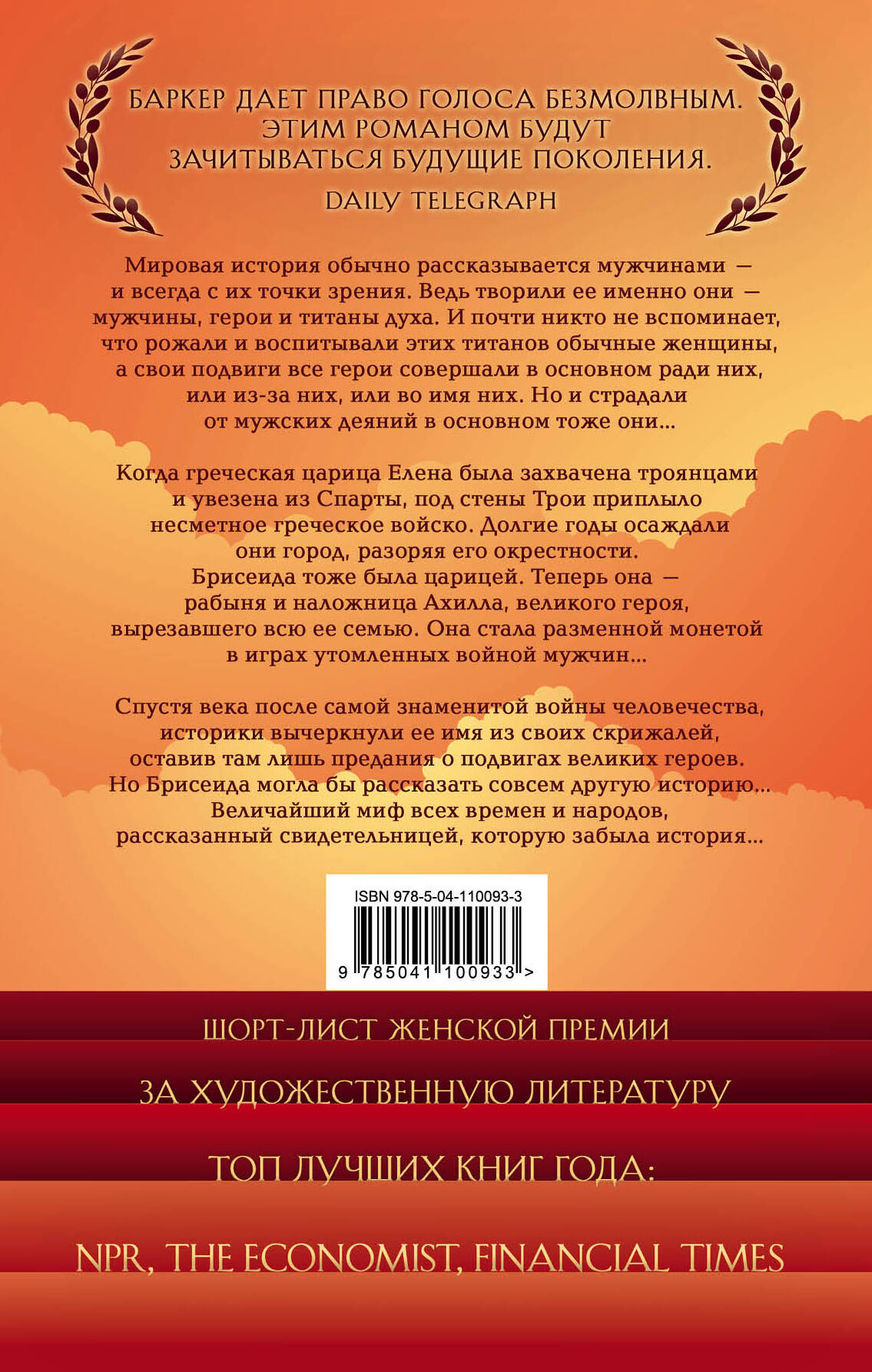 РОМАН ЛАУРЕАТА БУКЕРОВСКОЙ ПРЕМИИ. Лучшая книга XXI века по версии The Guardian. Бестселлер Amazon № 1. Шортлист Женской премии за художественную литературу. Топ лучших книг года: NPR, The Economist, Financial Times. Мировая история обычно рассказывается мужчинами - и всегда с их точки зрения. Ведь творили ее именно они - мужчины, герои и титаны духа. И почти никто не вспоминает, что рожали и воспитывали этих титанов обычные женщины, а свои подвиги все герои совершали в основном ради них, или из-за них, или во имя них. Но и страдали от мужских деяний в основном тоже они… Когда греческая царица Елена была захвачена троянцами и увезена из Спарты, под стены Трои приплыло несметное греческое войско. Долгие годы осаждали они город, разоряя его окрестности. Брисеида тоже была царицей. Теперь она - рабыня и наложница Ахилла, великого героя, вырезавшего всю ее семью. Она стала разменной монетой в играх утомленных войной мужчин… Спустя века после самой знаменитой войны человечества историки вычеркнули ее имя из своих скрижалей, оставив там лишь предания о подвигах великих героев. Но Брисеида могла бы рассказать совсем другую историю… Величайший миф всех времен и народов, рассказанный свидетельницей, которую забыла история… «Баркер дает право голоса безмолвным… Этим романом будут зачитываться будущие поколения». - Daily Telegraph «Шокирующе, мощно, смело… Обжигающий поворот сюжета «Илиады». Среди массы современных авторов, переписывающих великие античные мифы и классику, Баркер стоит особняком благодаря мощи своего замысла и неподдельному состраданию». - The Times «Это очень значительная, сильная, запоминающаяся книга, призывающая нас взглянуть иначе не только на «Илиаду», но и в целом на то, как мы рассказываем истории прошлого и настоящего, а также на то, какую роль играют в нашем обществе гнев и ненависть». - The Guardian «Баркер пишет не историю войн - а историю развития человеческой натуры». - The Independent «Волшебно… Вы в руках автора, находящегося на вершине своего таланта». - Evening Standard| Издательство | ООО "Издательство "Эксмо" |