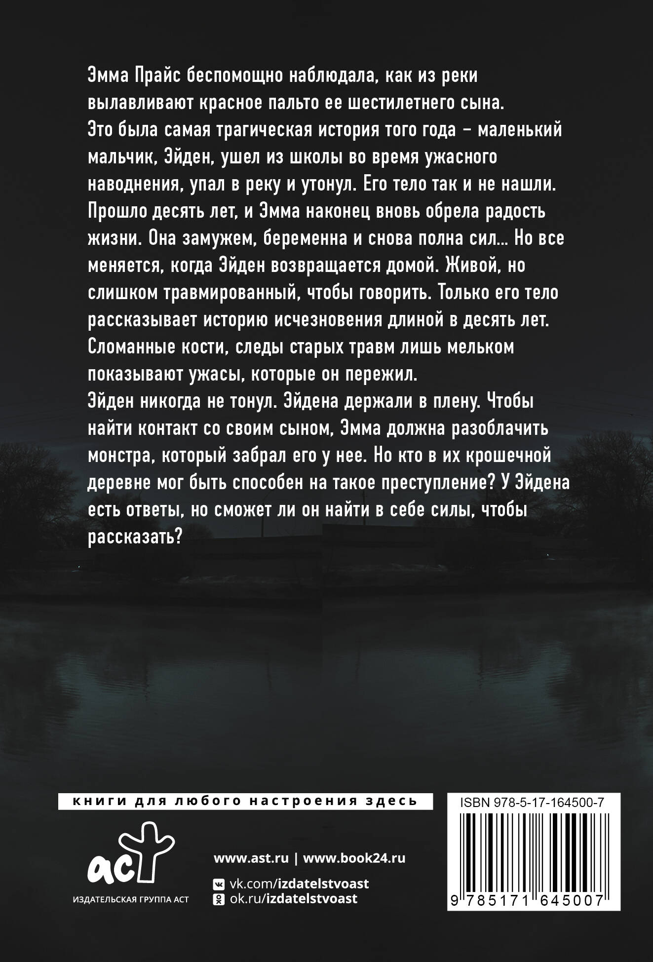 Эмма Прайс беспомощно наблюдала, как из реки вылавливают красное пальто ее шестилетнего сына. Это была самая трагическая история того года - маленький мальчик, Эйден, ушел из школы во время ужасного наводнения, упал в реку и утонул. Его тело так и не нашли. Прошло десять лет, и Эмма наконец вновь обрела радость жизни. Она замужем, беременна и снова полна сил… Но все меняется, когда Эйден возвращается домой. Живой, но слишком травмированный, чтобы говорить. Только его тело рассказывает историю исчезновения длиной в десять лет. Сломанные кости, следы старых травм лишь мельком показывают ужасы, которые он пережил. Эйден никогда не тонул. Эйдена держали в плену. Чтобы найти контакт со своим сыном, Эмма должна разоблачить монстра, который забрал его у нее. Но кто в их крошечной деревне мог быть способен на такое преступление? У Эйдена есть ответы, но сможет ли он найти в себе силы, чтобы рассказать?| Издательство | Издательство "АСТ" |