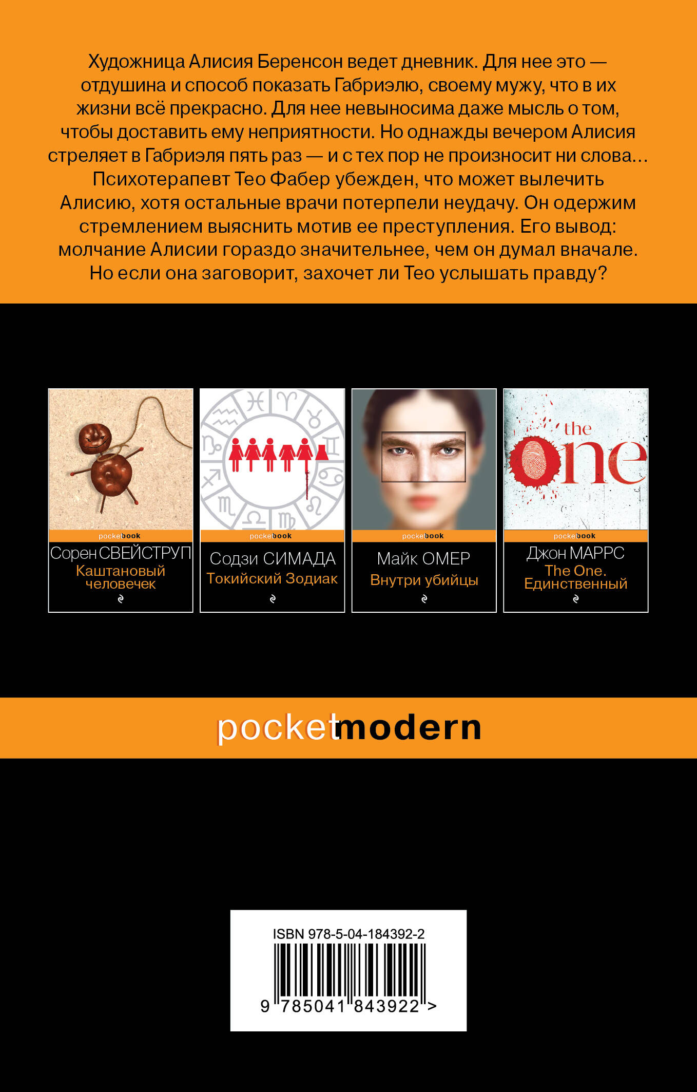 Бестселлер № 1 New York Times. Самая продаваемая книга 2019 года по версии Forbes. Лучший триллер 2019 года по версии читателей на Goodreads. Топ-3 самых продаваемых книг 2019 года на Amazon. «Безмолвный пациент» - главный триллер 2019 года. Этот дебютный роман издается в 40 странах мира. О нем восторженно отзываются Стивен Фрай, Ли Чайлд, А.Дж. Финн, Дэвид Болдаччи, Блейк Крауч и многие другие мастера жанра. Голливуд уже купил права на экранизацию за сумму с шестью нулями. Сам Алекс так рассказывал в одном из интервью о том, как у него сложился замысел романа: «В моем случае все получилось в точности как у Тео, основного рассказчика в книге: "Настоящая причина, по которой я ввязался в психотерапию, была сугубо эгоистическая. Я хотел помочь самому себе". Решая собственные проблемы, я заинтересовался психотерапией. Изучал групповые методики. Затем - индивидуальные. А позже моя сестра - сама психиатр - устроила меня на неполный рабочий день в отделение для подростков. Для меня это было невероятным событием. Я очень многое узнал. Это был формирующий, изменяющий жизнь опыт». «Я люблю его так сильно, так сильно, что это меня пугает. Иногда мне кажется… Нет. Такое я писать не стану». (Из дневника Алисии Беренсон.) «Предположительно, миссис Алисия Беренсон убила собственного мужа». (Из сводки полиции Лондона.) АЛИСИЯ Художница Алисия Беренсон ведет дневник. Для нее это - отдушина, возможность выговориться. А еще - способ показать своему любимому мужу, что в их жизни все прекрасно. Сама мысль о том, чтобы расстроить Габриэля или причинить ему боль - невыносима. Но однажды вечером Алисия пять раз стреляет ему в лицо, и с тех пор не произносит ни слова. Ее исповедью становится… картина. Автопортрет, в левом нижнем углу которого Алисия нанесла на холст одно-единственное слово, написанное по-гречески: «АЛКЕСТА»* ТЕО Эксперт-психотерапевт Тео Фабер убежден - он сможет помочь Алисии там, где все остальные врачи потерпели неудачу. Одержимый расследованием ее преступления, он понимает: молчание Алисии гораздо многозначительнее, чем кажется. Но захочет ли Тео услышать правду, если пациентка заговорит? *Алкеста - героиня древнегреческого мифа, согласившаяся пожертвовать собственной жизнью, чтобы спасти своего мужа. -------------------------------------------------- «Очень незаурядно». - Дэвид Болдаччи «Идеальный триллер». - А. Дж. Финн «Гениально». - Стивен Фрай «Самый неожиданный и потрясающий воображение финал за последнее время». - Блейк Крауч «Умное, сложное и напряженное повествование». - Ли Чайлд «Этот острый и умный роман буквально поразил меня, - а я уверяю вас, это очень непросто сделать. Благодарность автору. Особая благодарность…» - Джоанн Харрис, автор романа «Шоколад»| Издательство | ООО "Издательство "Эксмо" |
