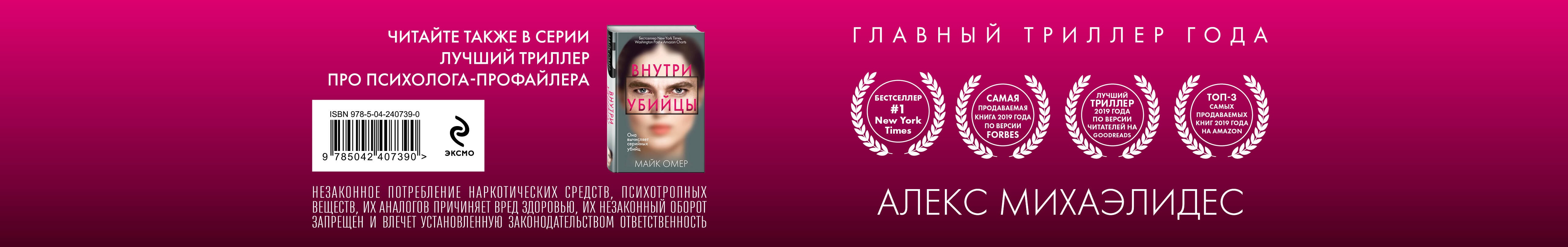 НЕЗАКОННОЕ ПОТРЕБЛЕНИЕ НАРКОТИЧЕСКИХ СРЕДСТВ, ПСИХОТРОПНЫХ ВЕЩЕСТВ, ИХ АНАЛОГОВ ПРИЧИНЯЕТ ВРЕД ЗДОРОВЬЮ, ИХ НЕЗАКОННЫЙ ОБОРОТ ЗАПРЕЩЕН И ВЛЕЧЕТ УСТАНОВЛЕННУЮ ЗАКОНОДАТЕЛЬСТВОМ ОТВЕТСТВЕННОСТЬ. Бестселлер № 1 New York Times. Самая продаваемая книга 2019 года по версии Forbes. Лучший триллер 2019 года по версии читателей на Goodreads. Топ-3 самых продаваемых книг 2019 года на Amazon. «Безмолвный пациент» - главный триллер 2019 года. Этот дебютный роман издается в 40 странах мира. О нем восторженно отзываются Стивен Фрай, Ли Чайлд, А.Дж. Финн, Дэвид Болдаччи, Блейк Крауч и многие другие мастера жанра. Голливуд уже купил права на экранизацию за сумму с шестью нулями. Сам Алекс так рассказывал в одном из интервью о том, как у него сложился замысел романа: «В моем случае все получилось в точности как у Тео, основного рассказчика в книге: "Настоящая причина, по которой я ввязался в психотерапию, была сугубо эгоистическая. Я хотел помочь самому себе". Решая собственные проблемы, я заинтересовался психотерапией. Изучал групповые методики. Затем - индивидуальные. А позже моя сестра - сама психиатр - устроила меня на неполный рабочий день в отделение для подростков. Для меня это было невероятным событием. Я очень многое узнал. Это был формирующий, изменяющий жизнь опыт». «Я люблю его так сильно, так сильно, что это меня пугает. Иногда мне кажется… Нет. Такое я писать не стану». (Из дневника Алисии Беренсон.) «Предположительно, миссис Алисия Беренсон убила собственного мужа». (Из сводки полиции Лондона.) АЛИСИЯ Художница Алисия Беренсон ведет дневник. Для нее это - отдушина, возможность выговориться. А еще - способ показать своему любимому мужу, что в их жизни все прекрасно. Сама мысль о том, чтобы расстроить Габриэля или причинить ему боль - невыносима. Но однажды вечером Алисия пять раз стреляет ему в лицо, и с тех пор не произносит ни слова. Ее исповедью становится… картина. Автопортрет, в левом нижнем углу которого Алисия нанесла на холст одно-единственное слово, написанное по-гречески: «АЛКЕСТА»*. ТЕО Эксперт-психотерапевт Тео Фабер убежден - он сможет помочь Алисии там, где все остальные врачи потерпели неудачу. Одержимый расследованием ее преступления, он понимает: молчание Алисии гораздо многозначительнее, чем кажется. Но захочет ли Тео услышать правду, если пациентка заговорит? *Алкеста - героиня древнегреческого мифа, согласившаяся пожертвовать собственной жизнью, чтобы спасти своего мужа. -------------------------------------------------- «Очень незаурядно». - Дэвид Болдаччи «Идеальный триллер». - А. Дж. Финн «Гениально». - Стивен Фрай «Самый неожиданный и потрясающий воображение финал за последнее время». - Блейк Крауч «Умное, сложное и напряженное повествование». - Ли Чайлд «Этот острый и умный роман буквально поразил меня, - а я уверяю вас, это очень непросто сделать. Благодарность автору. Особая благодарность…» - Джоанн Харрис, автор романа «Шоколад» Особенности издания: блинтовое тиснение на переплете, лак, полусупер, качественная белая офсетная бумага блока текста.| Издательство | ООО "Издательство "Эксмо" |