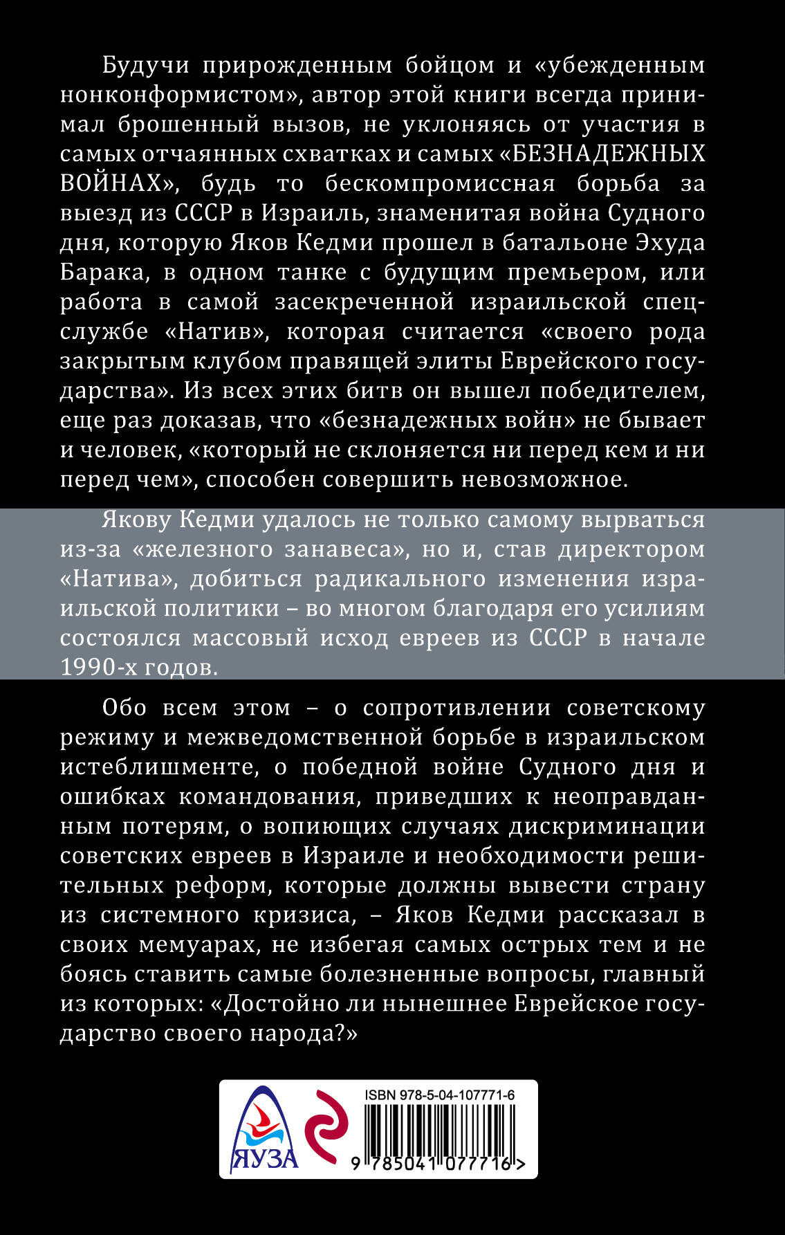 Будучи прирожденным бойцом и «убежденным нонконформистом», автор этой книги всегда принимал брошенный вызов, не уклоняясь от участия в самых отчаянных схватках и самых «БЕЗНАДЕЖНЫХ ВОЙНАХ», будь то бескомпромиссная борьба за выезд из СССР в Израиль, знаменитая война Судного дня, которую Яков Кедми прошел в батальоне Эхуда Барака, в одном танке с будущим премьером, или работа в самой засекреченной израильской спецслужбе «Натив», которая считается «своего рода закрытым клубом правящей элиты Еврейского государства». Из всех этих битв он вышел победителем, еще раз доказав, что «безнадежных войн» не бывает и человек, «который не склоняется ни перед кем и ни перед чем», способен совершить невозможное. Якову Кедми удалось не только самому вырваться из-за «железного занавеса», но и, став директором «Натива», добиться радикального изменения израильской политики - во многом благодаря его усилиям состоялся массовый исход евреев из СССР в начале 1990-х годов. Обо всем этом - о сопротивлении советскому режиму и межведомственной борьбе в израильском истеблишменте, о победной войне Судного дня и ошибках командования, приведших к неоправданным потерям, о вопиющих случаях дискриминации советских евреев в Израиле и необходимости решительных реформ, которые должны вывести страну из системного кризиса, - Яков Кедми рассказал в своих мемуарах, не избегая самых острых тем и не боясь ставить самые болезненные вопросы, главный из которых: «Достойно ли нынешнее Еврейское государство своего народа?| Издательство | ООО "Издательство "Эксмо" |