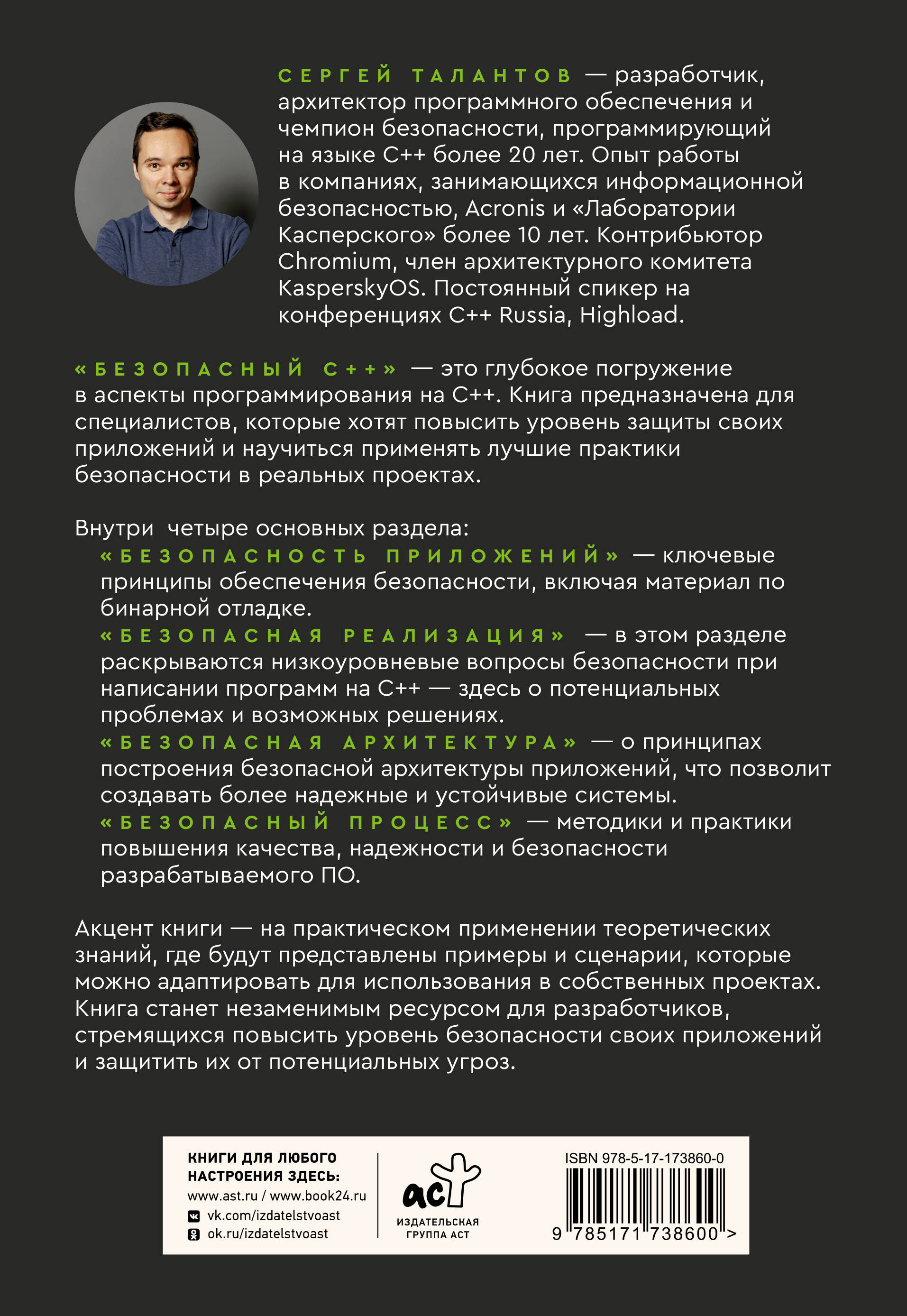 Сергей Талантов - разработчик, архитектор программного обеспечения и чемпион безопасности, программирующий на языке С++ более 20 лет. Опыт работы в компаниях, занимающихся информационной безопасностью, Acronis и "Лаборатории Касперского" более 10 лет. Контрибьютор Chromium, член архитектурного комитета KasperskyOS. Постоянный спикер на конференциях C++ Russia, Highload. "Безопасный С++" - это глубокое погружение в аспекты программирования на C++. Книга предназначена для специалистов, которые хотят повысить уровень защиты своих приложений и научиться применять лучшие практики безопасности в реальных проектах. Внутри четыре основных раздела: * "Безопасность приложений" - ключевые принципы обеспечения безопасности, включая материал по бинарной отладке. * "Безопасная реализация" - в этом разделе раскрываются низкоуровневые вопросы безопасности при написании программ на С++ - здесь о потенциальных проблемах и возможных решениях. * "Безопасная архитектура" - о принципах построения безопасной архитектуры приложений, что позволит создавать более надёжные и устойчивые системы. * "Безопасный процесс" - методики и практики повышения качества, надежности и безопасности разрабатываемого ПО. Акцент книги - на практическом применении теоретических знаний, где будут представлены примеры и сценарии, которые можно адаптировать для использования в собственных проектах. Книга станет незаменимым ресурсом для разработчиков, стремящихся повысить уровень безопасности своих приложений и защитить их от потенциальных угроз.| Издательство | Издательство "АСТ" |