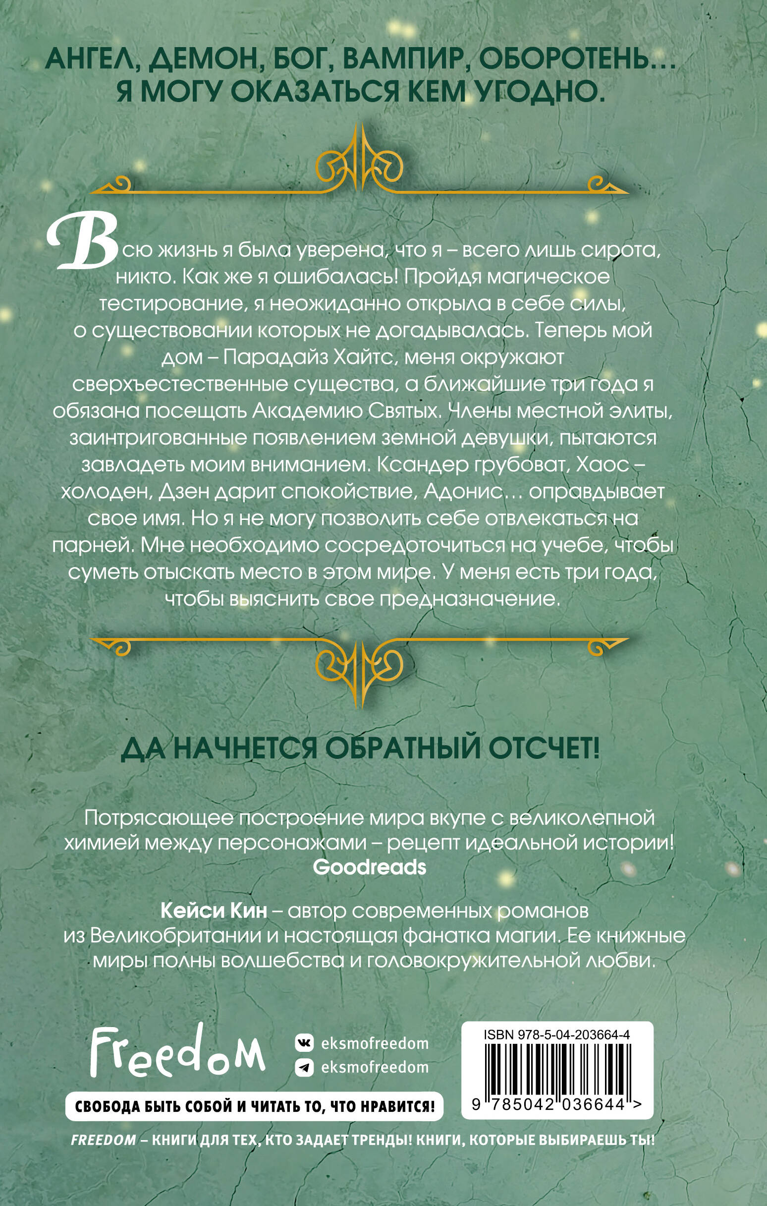Захватывающая новинка в жанре романтического фэнтези для всех фанатов тропа «обратный гарем». Окунитесь в мир оживших мифов и легенд! На страницах цикла: ангелы и демоны, вампиры и оборотни, захватывающие приключения в магической академии, темные тайны, головокружительная любовь и обжигающая страсть! Идеально для фанатов Рейвен Кеннеди, Евы Чейз и Ребекки Яррос. Всю свою жизнь я бродила по улицам родного городка, точно уверенная в том, что я - всего лишь сирота, обычная девушка, никто... Как же я ошибалась! Мой мир изменился в двадцать второй день рождения: пройдя магическое тестирование, я неожиданно открыла в себе силы, о существовании которых и не догадывалась. Теперь мой дом - Парадайз Хайтс, меня окружают сверхъестественные существа, а ближайшие три года я обязана посещать Академию Святых. Члены местной элиты, заинтригованные появлением земной девушки, пытаются завладеть моим вниманием. Ксандер грубоват, Хаос - холоден, Дзен дарит спокойствие, а Адонис… оправдывает свое имя. Но я не могу позволить себе отвлекаться на парней. Мне необходимо сосредоточиться на учебе, чтобы суметь отыскать свое место в этом мире. Ангел, демон, бог, вампир, оборотень… Я могу оказаться кем угодно, и чтобы выяснить свое предназначение, у меня есть три года. Да начнется обратный отсчет!| Издательство | ООО "Издательство "Эксмо" |