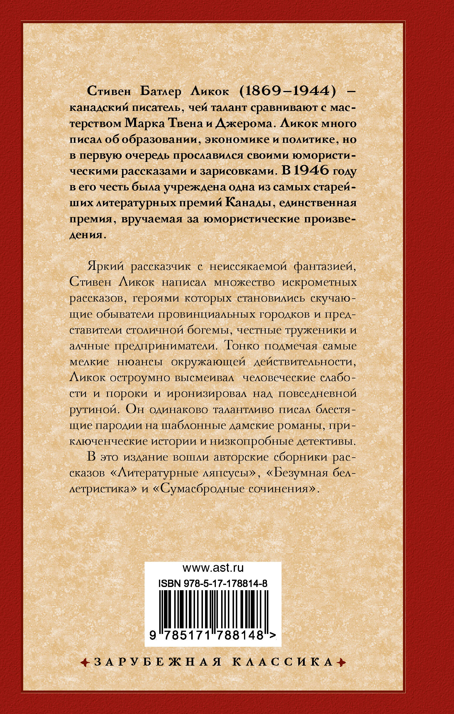 - Классика мирового юмора. Для поклонников творчества Марка Твена и Джерома К. Джерома. - На пике своей карьеры Стивен Ликок считался одним из самых популярных англоязычных писателей в мире. - Стивену Ликоку одинаково ударно удавались сатирические, иронические и пародийные рассказы. - В данное издание вошли авторские сборники «Литературные ляпсусы», «Безумная беллетристика» и «Сумасбродные сочинения». - Издание в серии «Зарубежная классика» - в узнаваемом оформлении и твердой обложке.| Издательство | Издательство "АСТ" |