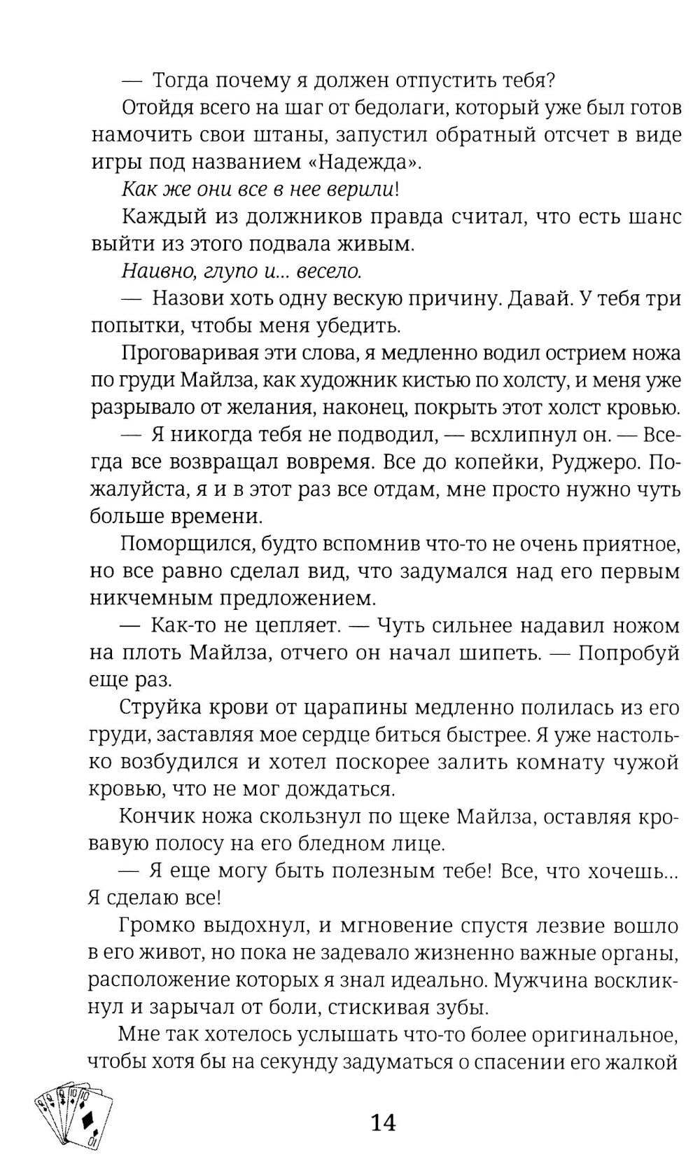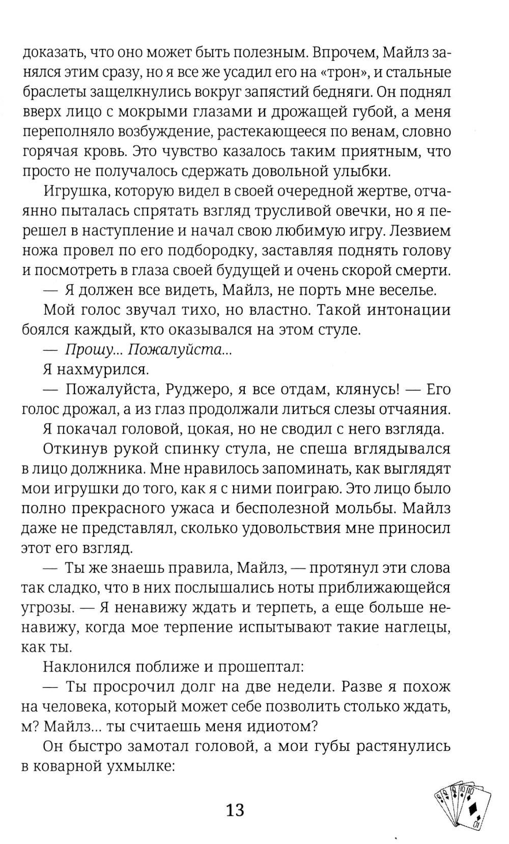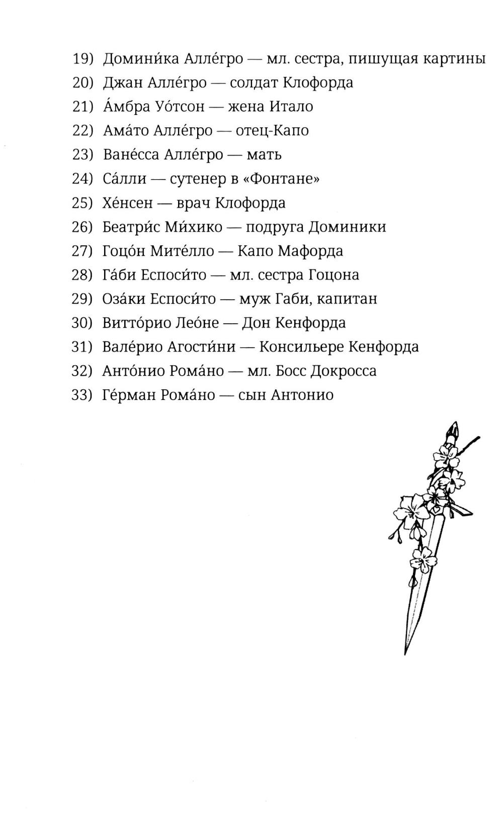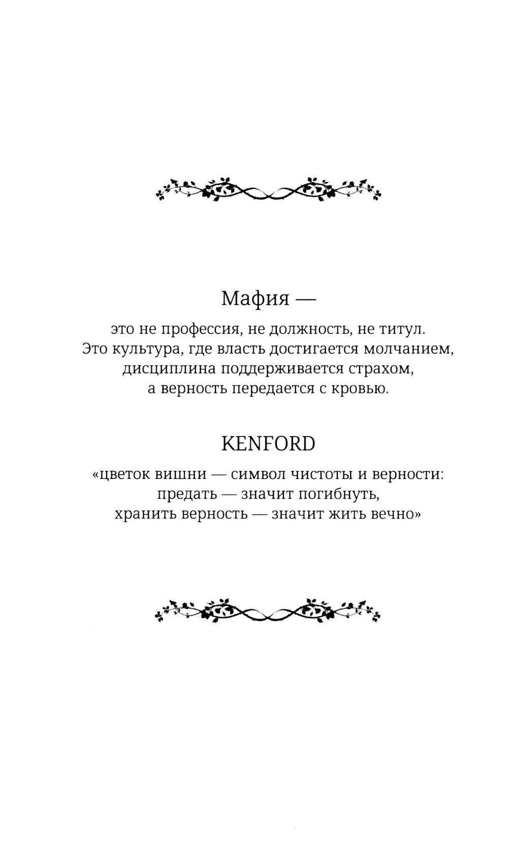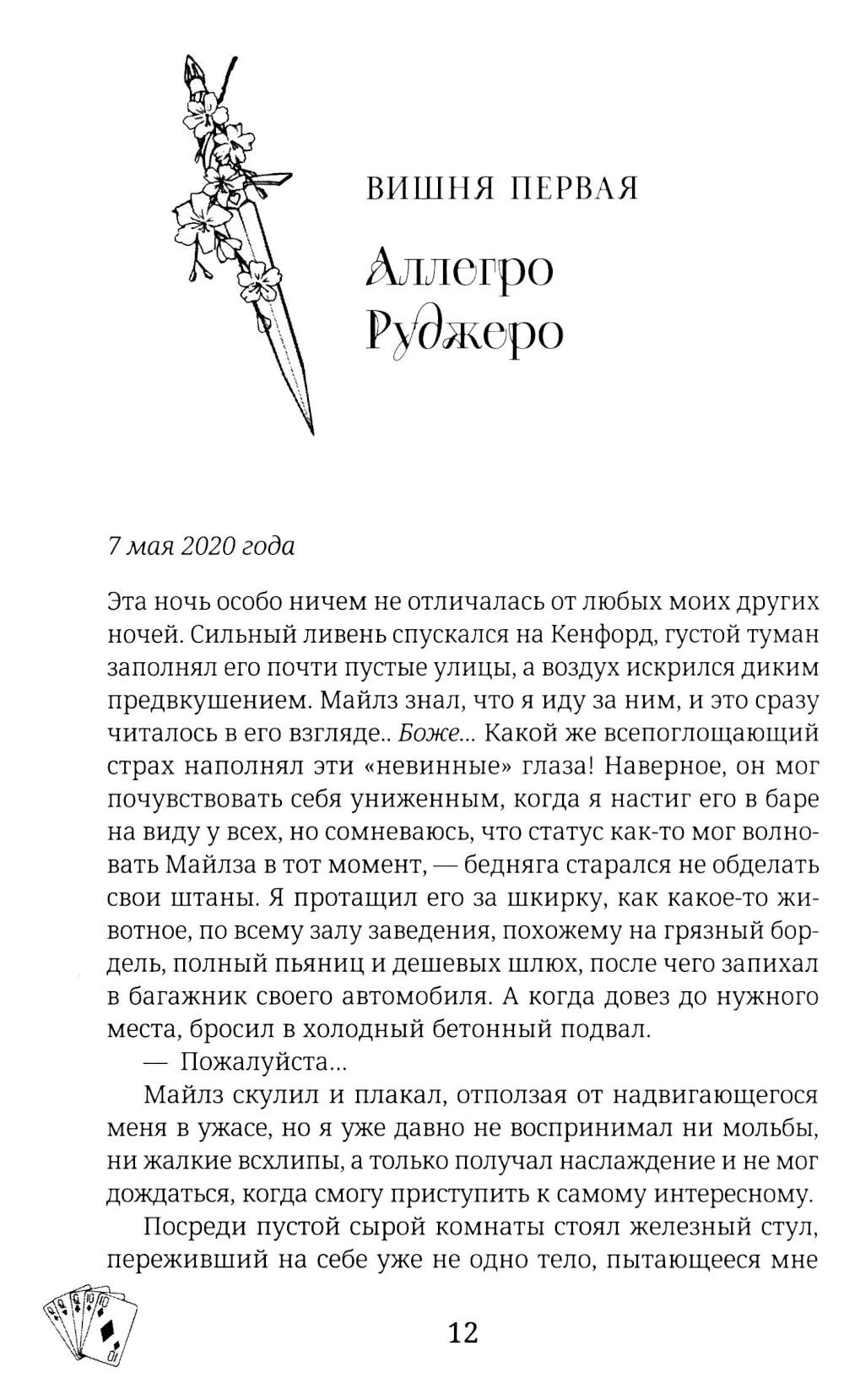 Горячий роман о мафии, кровной вражде и страсти от автора, Дарии Эдви. В тени могущественного мафиозного клана Кенфорд, разделенного на четыре района зарождается история любви, которая бросает вызов всем правилам. Руджеро Аллегро - исполнитель Клофорда, воплощение холодной жестокости, человек, которому нет равных в искусстве пыток и играх разума. Инес Карбоне - младшая сестра Капо Сант-Хилла, гордая и целеустремленная, чья страсть к моде и азартным играм затмевает все остальные интересы. Судьба сводит их вместе в казино, и искра между ними вспыхивает почти мгновенно, что стало неожиданностью для них самих. Но смогут ли они сохранить свои чувства, или их история станет еще одним напоминанием о том, что в мире мафии нет места любви? Первая книга из цикла «Кенфордская вишня».| Издательство | Яуза-каталог |