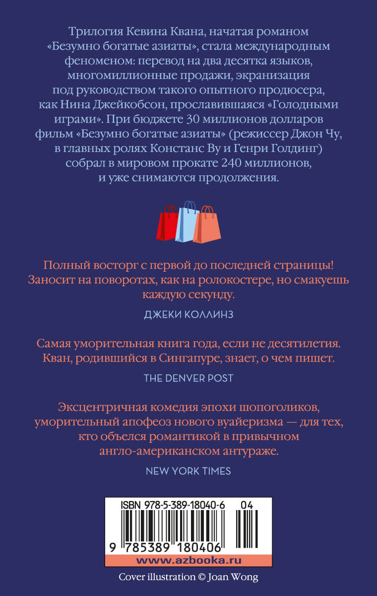 "Нигде в мире вы не найдете таких богатых людей, как китайцы", - писал средневековый арабский путешественник Ибн Баттута; эту фразу Кевин Кван использовал как эпиграф к своему международному бестселлеру. Итак, познакомьтесь с Рейчел Чу; она американка китайского происхождения, молодой профессор экономики в нью-йоркском университете и специалист по теории игр. Однажды ее бойфренд Ник, тоже университетский преподаватель, родом из Сингапура, зовет ее провести лето в Азии - составить ему компанию в поездке на свадьбу его лучшего друга Колина. Рейчел почти ничего не знает про его семью (как и его семья - про Рейчел), и только в самой поездке выясняет, что они безумно богаты, а Ник - один из самых завидных азиатских женихов… Права на экранизацию романа купила Нина Джейкобсон - продюсер "Голодных игр", и фильм "Безумно богатые азиаты" (режиссер Джон Чу, в главных ролях Констанс Ву и Генри Голдинг) стал в 2018 году одним из лидеров кинопроката.| Издательство | Азбука-Аттикус Издат.группа ООО |