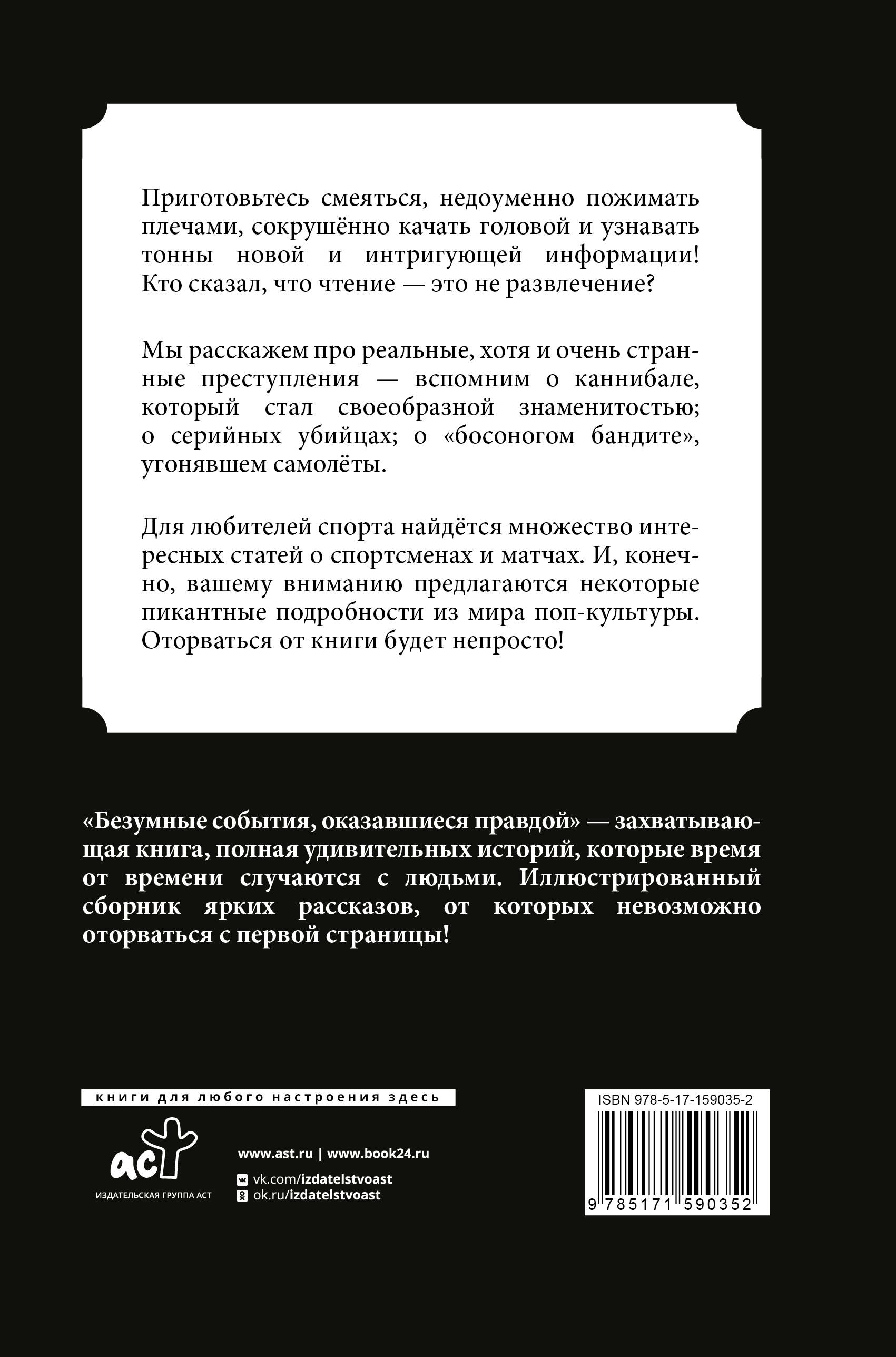 Приготовьтесь смеяться, недоуменно пожимать плечами, сокрушённо качать головой и узнавать тонны новой и интригующей информации! Кто сказал, что чтение - это не развлечение? "Безумные события, оказавшиеся правдой" - захватывающая книга, полная удивительных историй, которые время от времени случаются с людьми. Иллюстрированный сборник ярких рассказов, от которых невозможно оторваться с первой страницы! Мы расскажем про реальные, хотя и очень странные преступления - вспомним о каннибале, который стал своеобразной знаменитостью; о серийных убийцах; о "босоногом бандите", угонявшем самолёты. Для любителей спорта найдётся множество интересных статей о спортсменах и матчах. И, конечно, вашему вниманию предлагаются некоторые пикантные подробности из мира поп-культуры. Оторваться от книги будет непросто!| Издательство | Издательство "АСТ" |