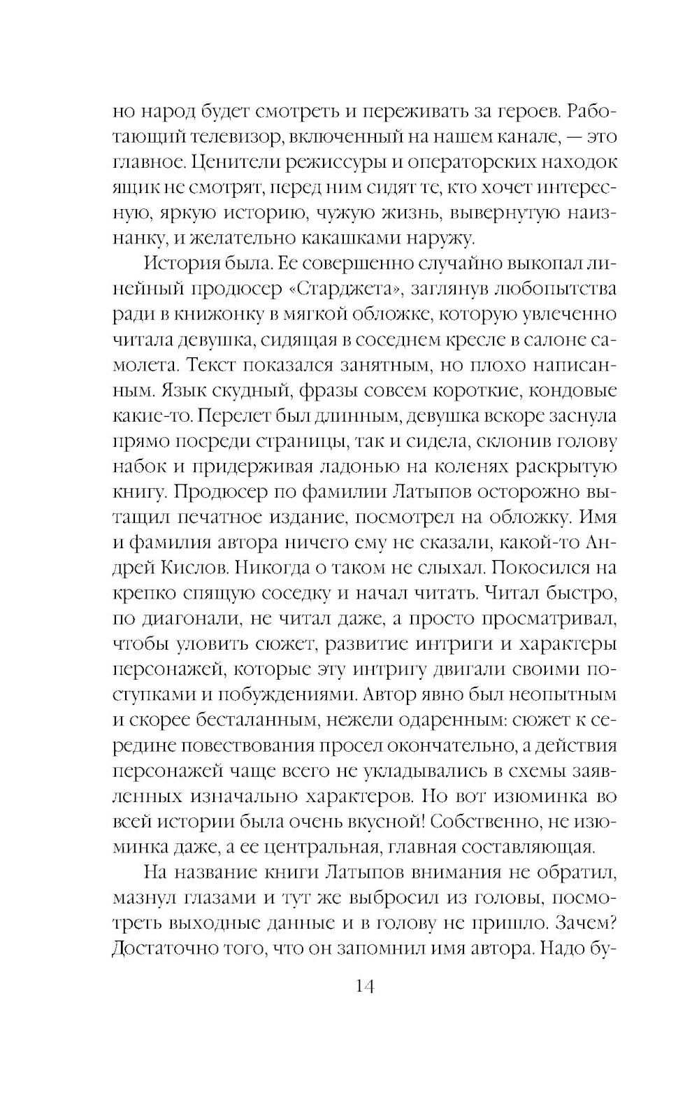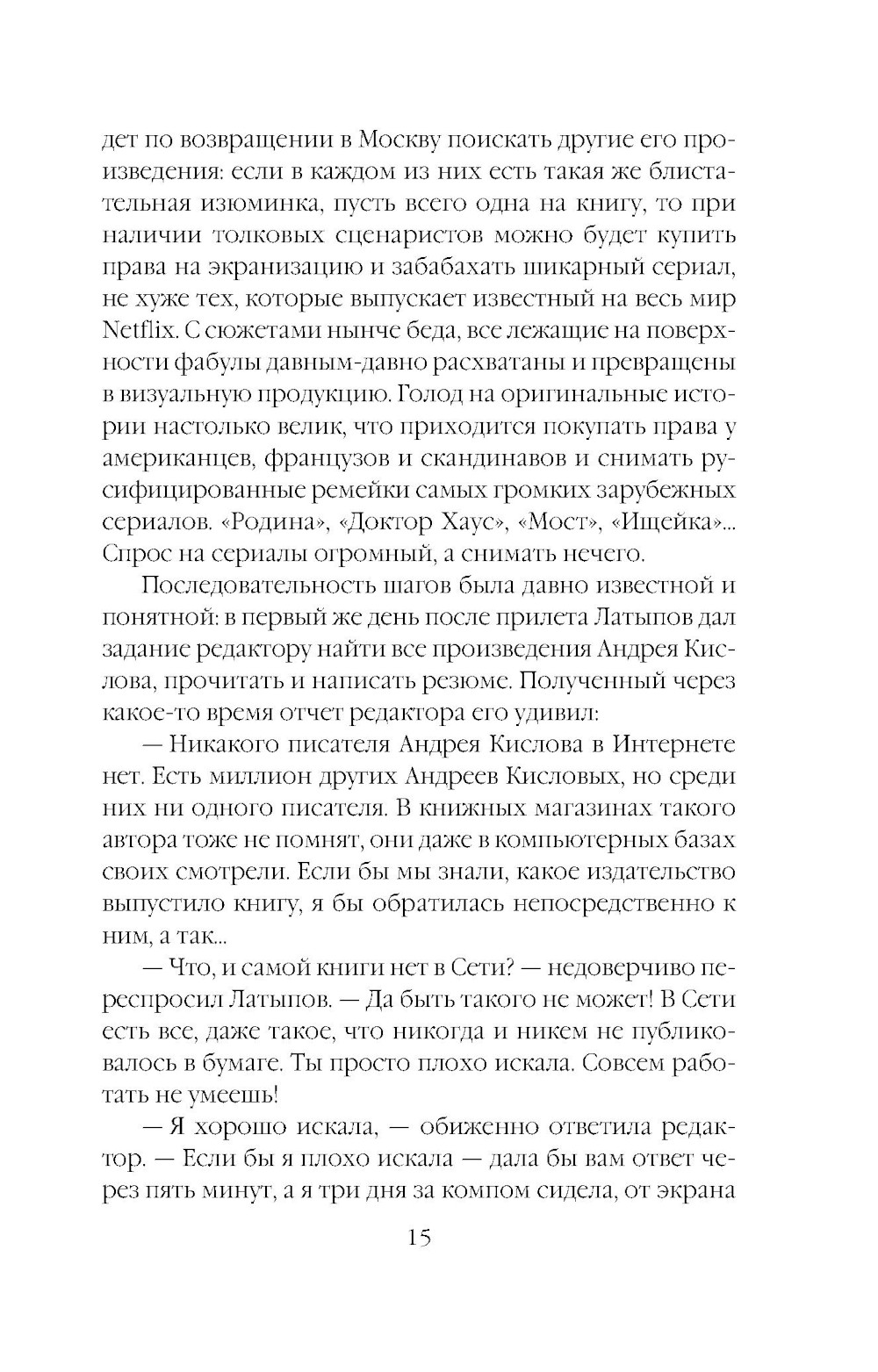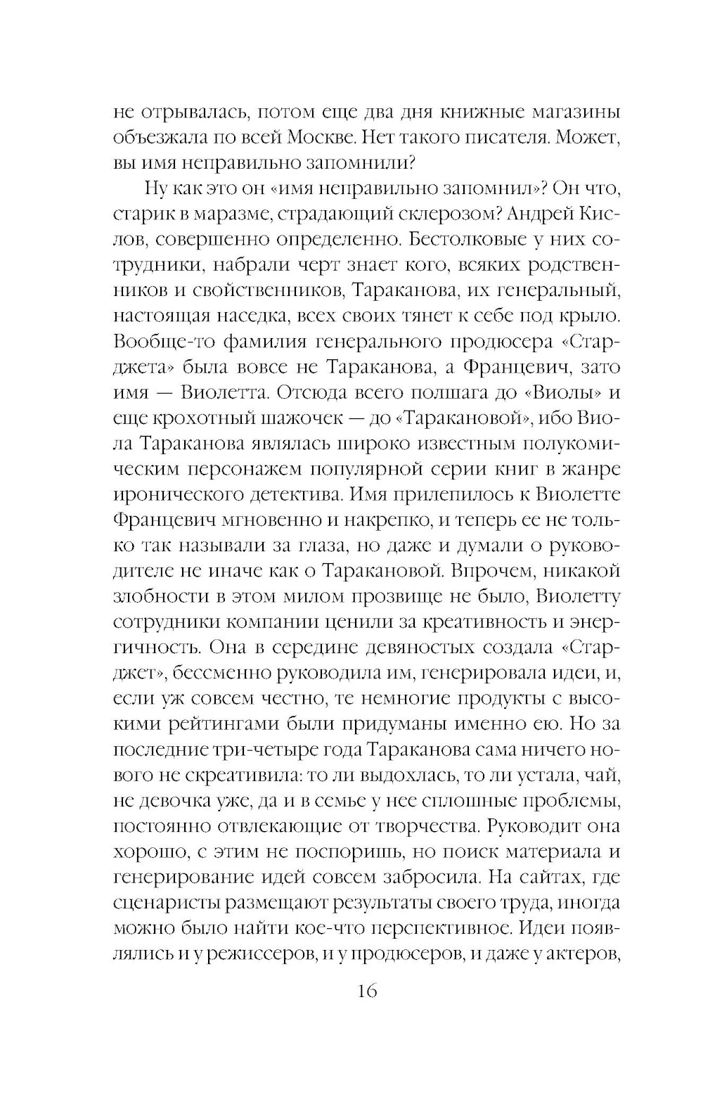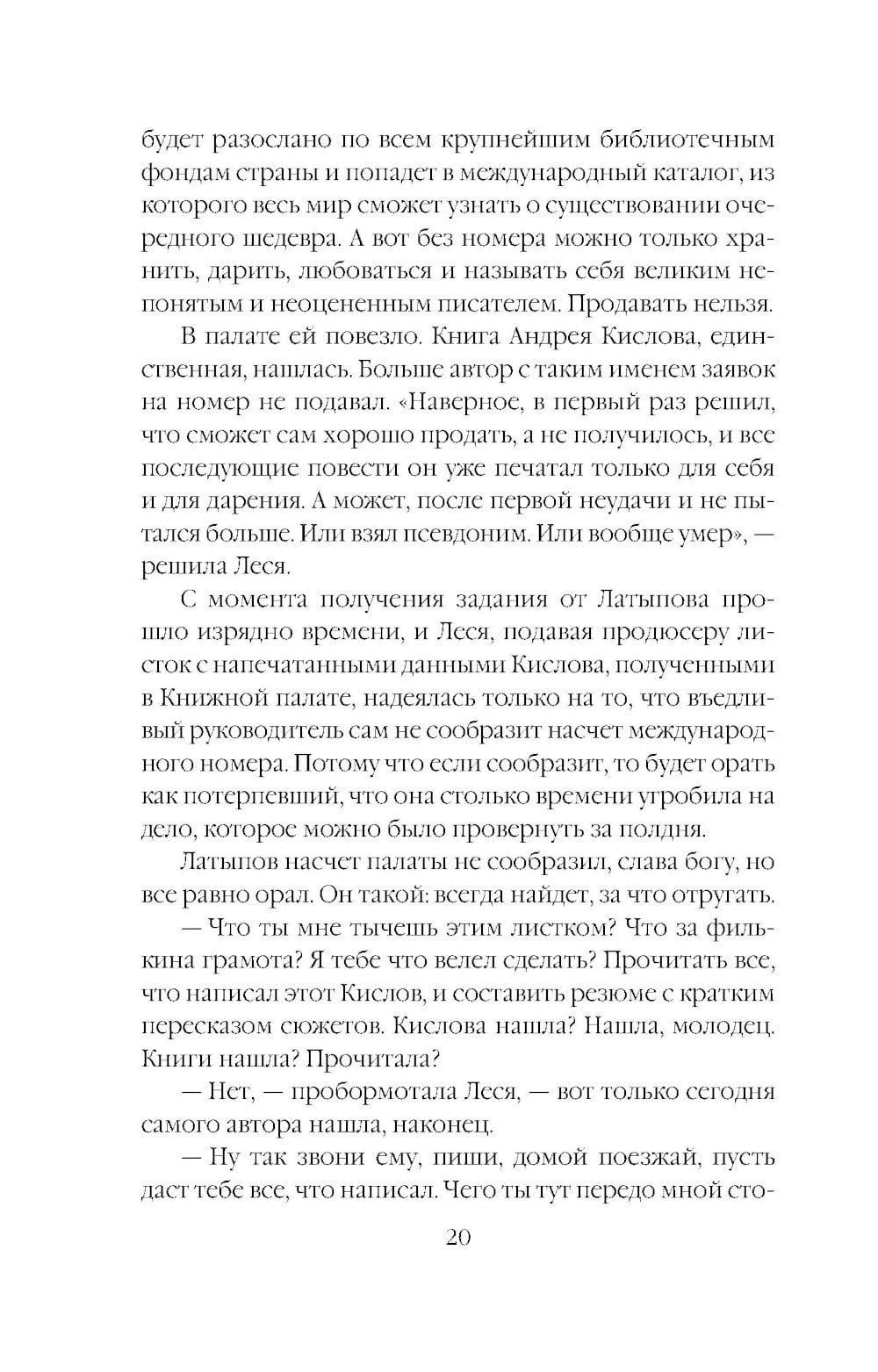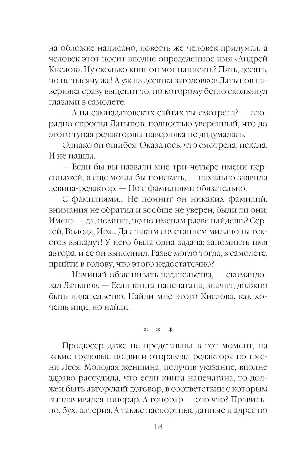 Такого странного дела в практике Анастасии Каменской не было давно. Неизвестному писателю Андрею Кислову крупно повезло. По его единственному роману, изданному за свой счет, хотят снять сериал и предлагают солидный гонорар. Разумеется, тот с радостью соглашается. А потом внезапно объявляет, что не подпишет договор ни на каких условиях. На кону большие деньги, и к выяснению причин столь загадочного отказа привлекают сотрудника частного детективного агентства - Настю Каменскую. Но вскоре та становится главным подозреваемым в деле об убийстве. Конечно, ну а кто же еще! Ведь это она, Настя, грязно домогалась потерпевшего, угрожала ему... Он сам рассказывал об этом перед смертью, да и другие свидетели имеются…
