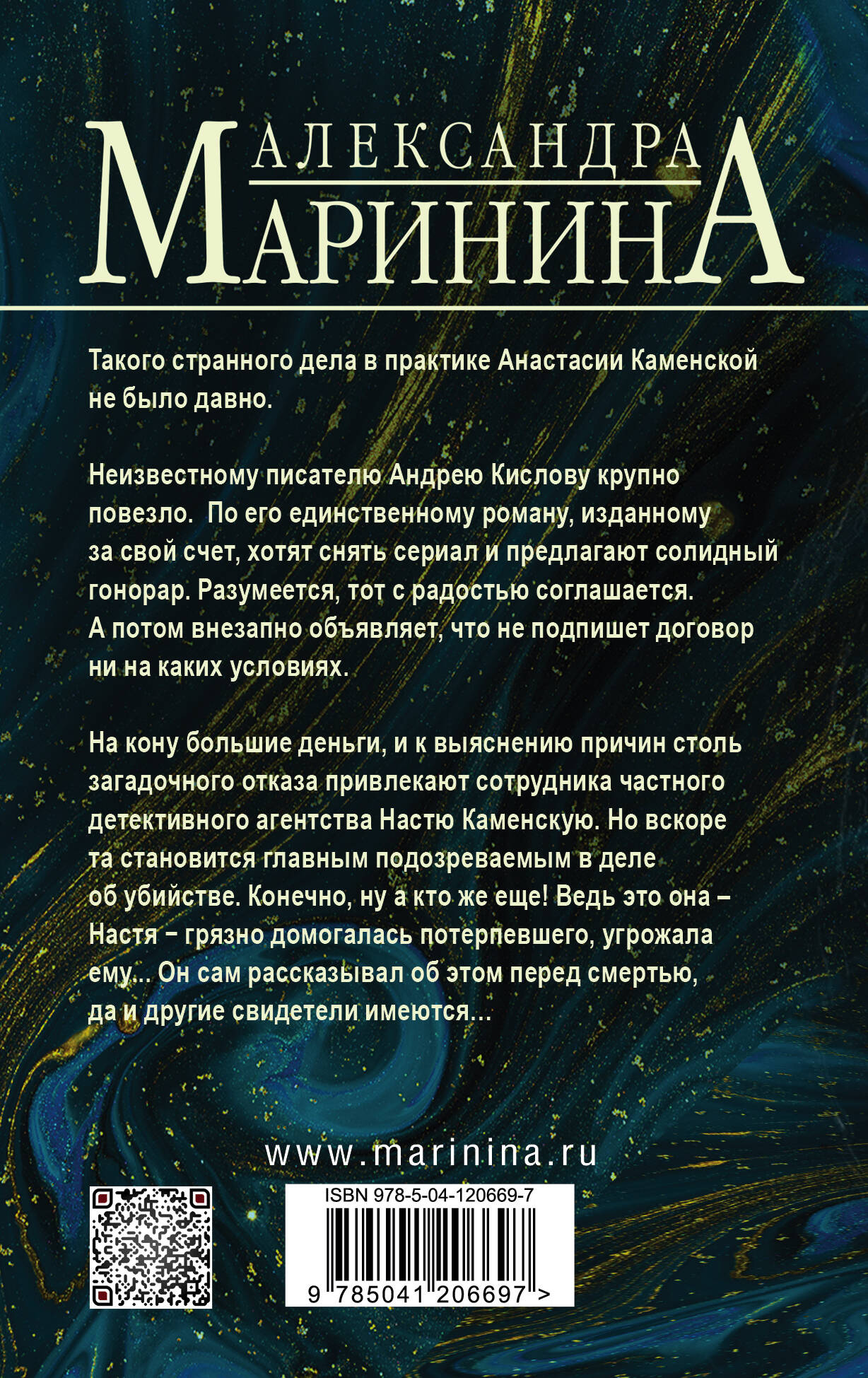 Одно из самых необычных дел Анастасии Каменской. Такого странного дела в практике Анастасии Каменской не было давно. Неизвестному писателю Андрею Кислову крупно повезло. По его единственному роману, изданному за свой счет, хотят снять сериал и предлагают солидный гонорар. Разумеется, тот с радостью соглашается. А потом внезапно объявляет, что не подпишет договор ни на каких условиях. На кону большие деньги, и к выяснению причин столь загадочного отказа привлекают сотрудника частного детективного агентства - Настю Каменскую. Но вскоре та становится главным подозреваемым в деле об убийстве. Конечно, ну а кто же еще! Ведь это она, Настя, грязно домогалась потерпевшего, угрожала ему... Он сам рассказывал об этом перед смертью, да и другие свидетели имеются… -------------------------------------------------- «Маринина не только пишет детективные романы, но и отвечает на вечные вопросы. Автор относится к своим читателям как добрый и опытный учитель к ученикам, которые нуждаются в поддержке, подсказке и направлении на верный путь. Оптимистичная и практичная в своей дидактике, Маринина ставит перед собой вопрос "как жить" и старается помочь читателю найти свой путь к лучшей жизни в сегодняшнем мире. Своими детективами Маринина пишет современный роман "воспитания чувств": основная цель автора - воспитание посредством развлечения». - Анатолий Вишевский, Гринелльский колледж, США «Многие романы Александры Марининой в России экранизированы, а в Германии переработаны в радиопьесы. Исходя из того, что цель этих обработок - захватывать зрителей и слушателей таким же образом, как захвачены читатели, то фильм и радиопьеса являются не только дополнительными художественными произведениями, но и интересными интерпретациями, которые проникли в тайну успеха Александры Марининой». - Сара Хэги, Кельнский университет, Германия «В диалогах художественной и тривиальной литературы можно обнаружить разные способы стилизации "устности", чтобы достичь впечатления спонтанного разговора. Обиходная речь в романах А. Марининой отличается необыкновенно высокой степенью оживленности, что выражается, между прочим, в разных формах обращения собеседников, в различных оттенках вежливости и в эмоциональности используемой лексики». - Вольфганг Штадлер, Университет имени Леопольда Францена, Инсбрук, Австрия| Издательство | ООО "Издательство "Эксмо" |
