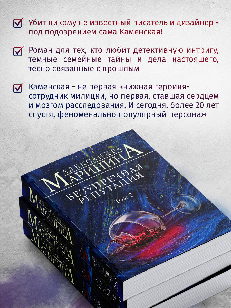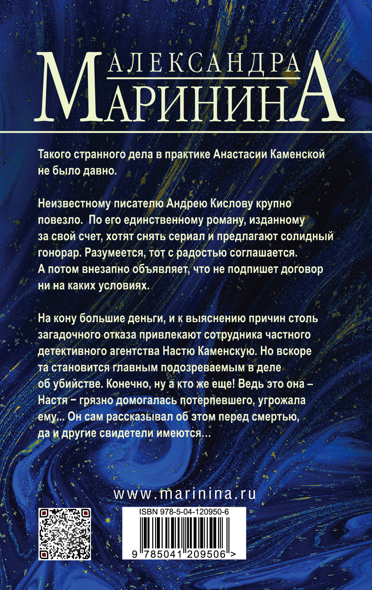 Одно из самых необычных дел Анастасии Каменской. Такого странного дела в практике Анастасии Каменской не было давно. Неизвестному писателю Андрею Кислову крупно повезло. По его единственному роману, изданному за свой счет, хотят снять сериал и предлагают солидный гонорар. Разумеется, тот с радостью соглашается. А потом внезапно объявляет, что не подпишет договор ни на каких условиях. На кону большие деньги, и к выяснению причин столь загадочного отказа привлекают сотрудника частного детективного агентства - Настю Каменскую. Но вскоре та становится главным подозреваемым в деле об убийстве. Конечно, ну а кто же еще! Ведь это она, Настя, грязно домогалась потерпевшего, угрожала ему... Он сам рассказывал об этом перед смертью, да и другие свидетели имеются… -------------------------------------------------- «Маринина не только пишет детективные романы, но и отвечает на вечные вопросы. Автор относится к своим читателям как добрый и опытный учитель к ученикам, которые нуждаются в поддержке, подсказке и направлении на верный путь. Оптимистичная и практичная в своей дидактике, Маринина ставит перед собой вопрос "как жить" и старается помочь читателю найти свой путь к лучшей жизни в сегодняшнем мире. Своими детективами Маринина пишет современный роман "воспитания чувств": основная цель автора - воспитание посредством развлечения». - Анатолий Вишевский, Гринелльский колледж, США «Многие романы Александры Марининой в России экранизированы, а в Германии переработаны в радиопьесы. Исходя из того, что цель этих обработок - захватывать зрителей и слушателей таким же образом, как захвачены читатели, то фильм и радиопьеса являются не только дополнительными художественными произведениями, но и интересными интерпретациями, которые проникли в тайну успеха Александры Марининой». - Сара Хэги, Кельнский университет, Германия «В диалогах художественной и тривиальной литературы можно обнаружить разные способы стилизации "устности", чтобы достичь впечатления спонтанного разговора. Обиходная речь в романах А. Марининой отличается необыкновенно высокой степенью оживленности, что выражается, между прочим, в разных формах обращения собеседников, в различных оттенках вежливости и в эмоциональности используемой лексики». - Вольфганг Штадлер, Университет имени Леопольда Францена, Инсбрук, Австрия| Издательство | ООО "Издательство "Эксмо" |
