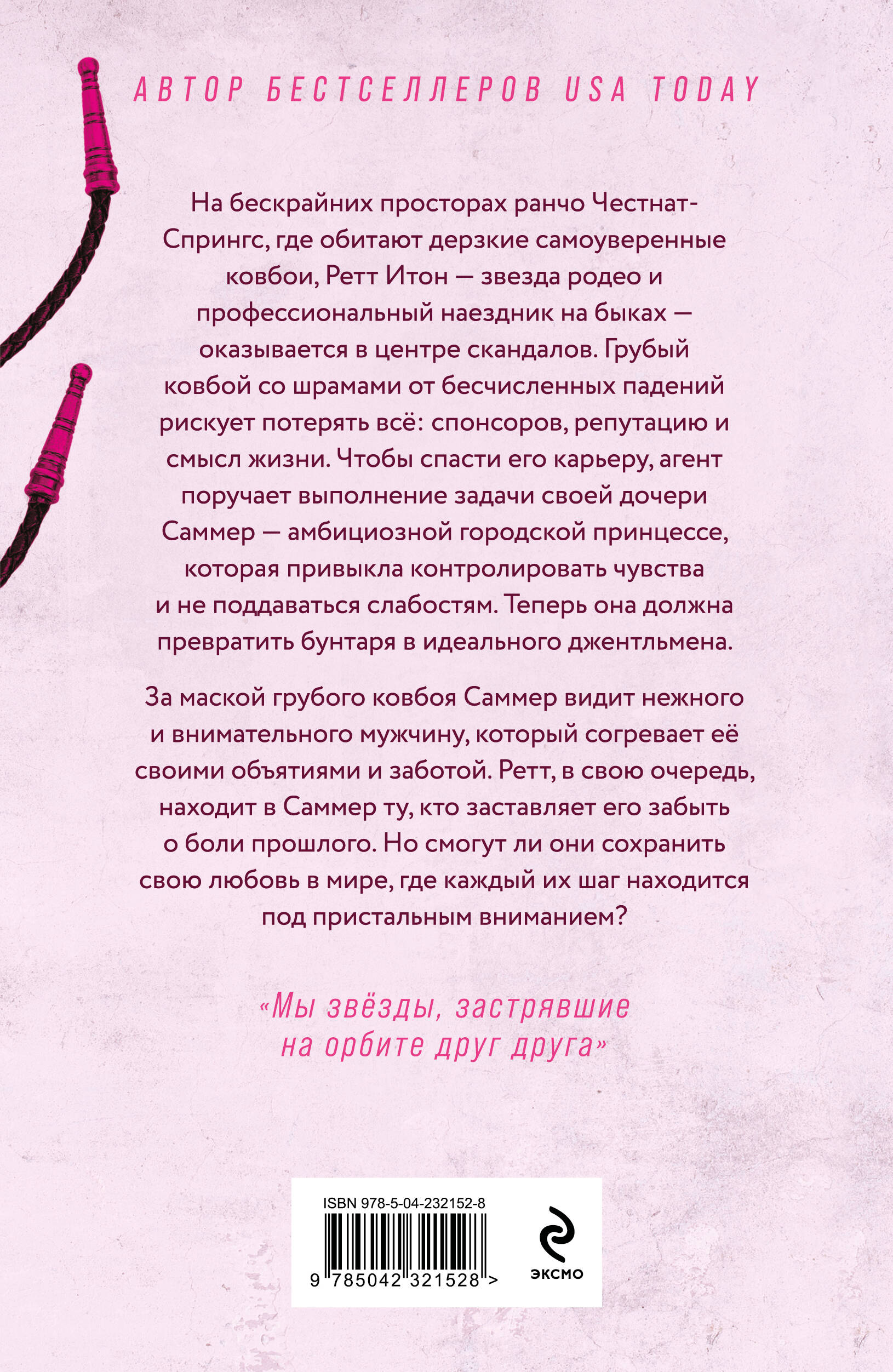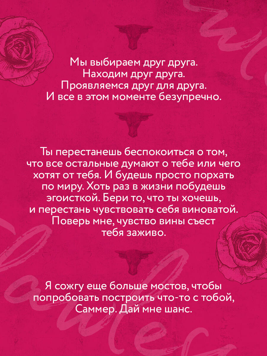 Авторская серия в новом оформлении в фирменном покете с клапанами. Абсолютный хит TikTok, от которого в животе порхают бабочки, в новом оформлении. История, в которой девушку ценят, любят, уважительно относятся и готовы ради будущего с ней отказаться от карьеры. Книга окунает в атмосферу маленького городка с трогательной историей любви настоящего мужчины («гринфлаг»), выросшего на ранчо, с самодостаточной героиней. Их любовью хочется восхищаться, в нее веришь, с трепетом следишь за ее зарождением и развитием. В книге показаны равноправные партнерские отношения, где герои учатся принимать друг друга со всеми недостатками. На бескрайних просторах ранчо Честнат-Спрингс, где обитают дерзкие самоуверенные ковбои, Ретт Итон - звезда родео и профессиональный наездник на быках - оказывается в центре скандалов. Грубый ковбой со шрамами от бесчисленных падений рискует потерять все: спонсоров, репутацию и смысл жизни. Чтобы спасти его карьеру, агент поручает задачу своей дочери Саммер - амбициозной городской принцессе, которая привыкла контролировать чувства и не поддаваться слабостям. Теперь она должна превратить бунтаря в идеального джентльмена. За маской грубого ковбоя Саммер видит нежного и внимательного мужчину, который согревает ее своими объятиями и заботой. Ретт, в свою очередь, находит в Саммер ту, кто заставляет его забыть о боли прошлого. Но смогут ли они сохранить свою любовь в мире, где каждый их шаг находится под пристальным вниманием? Стильный покет с клапанами, фольгой на обложке и кремовой бумагой.| Издательство | ООО "Издательство "Эксмо" |