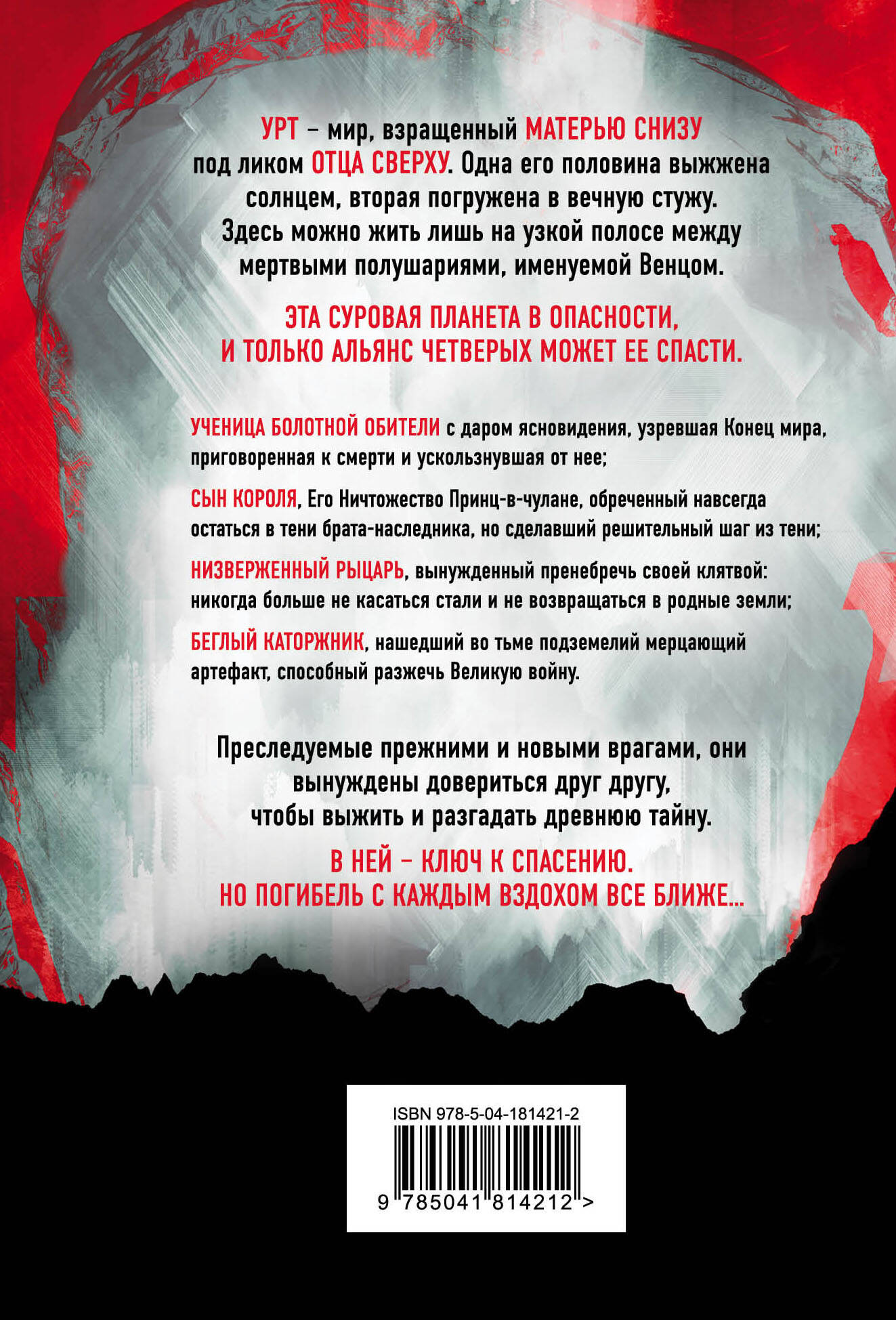 Опасное фантастическое приключение с целью спасения странного мира, где древние алхимические знания переплетены с уникальными технологиями. Новейший цикл Джеймса Роллинса - автора с мировым именем, создателя многочисленных бестселлеров New York Times №1, переведенных на 40 языков. Пророчество возгласило, что ей суждено уничтожить мир... Урт - мир, взращенный Матерью Снизу под ликом Отца Сверху. Одна его половина выжжена солнцем, вторая погружена в вечную стужу. Здесь можно жить лишь на узкой полосе между мертвыми полушариями, именуемой Венцом. Эта суровая планета в опасности, и только альянс четверых может ее спасти. Ученица болотной Обители с даром ясновидения, узревшая Конец мира, приговоренная к смерти и ускользнувшая от нее; сын короля, Его Ничтожество Принц-в-чулане, обреченный навсегда остаться в тени брата-наследника, но сделавший решительный шаг из тени; низверженный рыцарь, вынужденный пренебречь своей клятвой: никогда больше не касаться стали и не возвращаться в родные земли; беглый каторжник, нашедший во тьме подземелий мерцающий артефакт, способный разжечь Великую войну. Преследуемые прежними и новыми врагами, они вынуждены довериться друг другу, чтобы выжить и разгадать древнюю тайну. В ней - ключ к спасению. Но погибель с каждым вздохом все ближе… ------------------------------------------------------------------------------------------------------------ «Талантливый рассказчик, который легко дрейфует от триллера к фэнтези и обратно. Потрясающее повествование». - Терри Брукс «Мощное, блистательное эпическое фэнтези от выдающегося романиста». - Джонатан Мэйберри «Будучи виртуозным мастером скрещивания жанров, здесь Джеймс просто на пике формы». - Роберт Сальваторе «Роллинс - это то, что получается, если поместить Дэна Брауна и Майкла Крайтона в адронный коллайдер». - New York Times| Издательство | ООО "Издательство "Эксмо" |