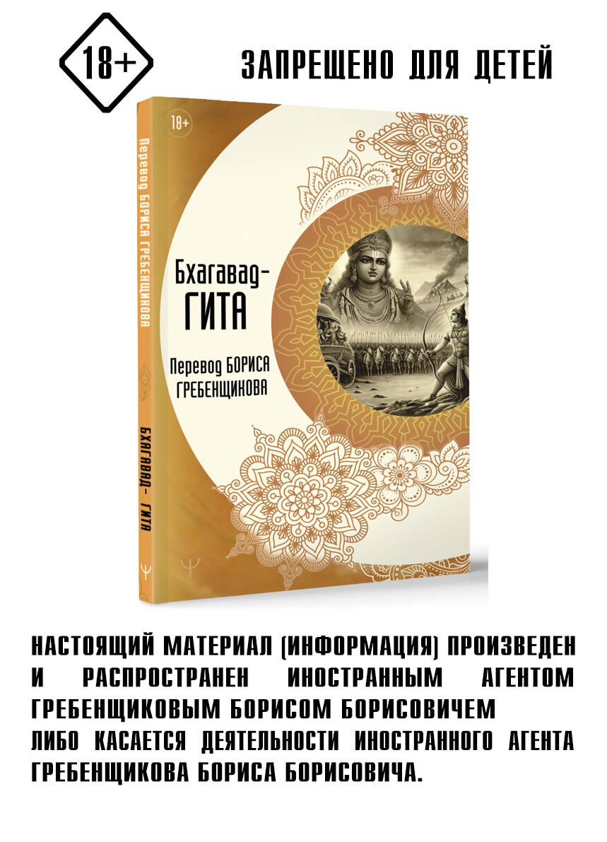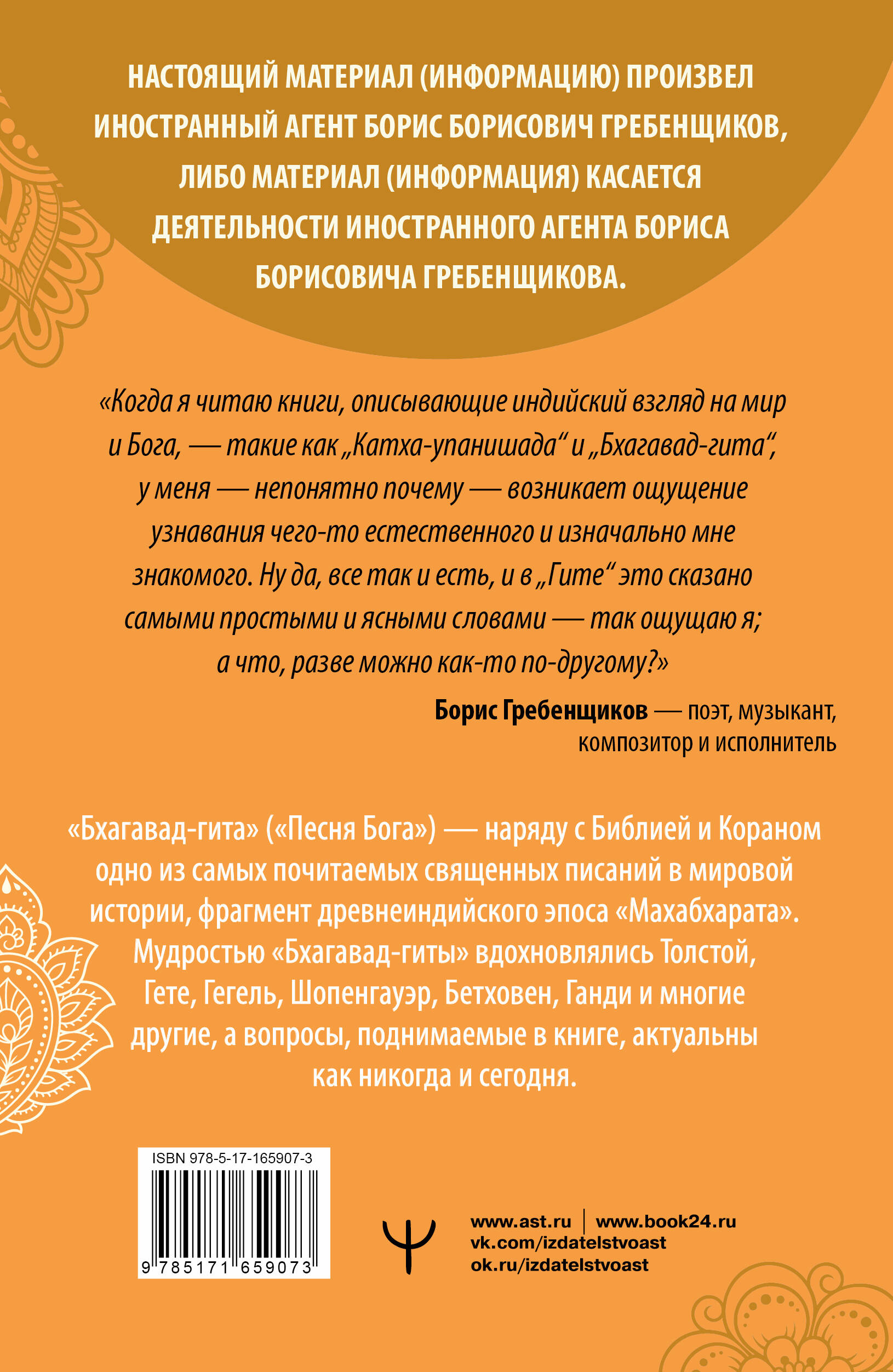 НАСТОЯЩИЙ МАТЕРИАЛ (ИНФОРМАЦИЯ) ПРОИЗВЕДЕН И РАСПРОСТРАНЕН ИНОСТРАННЫМ АГЕНТОМ ГРЕБЕНЩИКОВЫМ БОРИСОМ БОРИСОВИЧЕМ ЛИБО КАСАЕТСЯ ДЕЯТЕЛЬНОСТИ ИНОСТРАННОГО АГЕНТА ГРЕБЕНЩИКОВА БОРИСА БОРИСОВИЧА. Новое издание отличается удобной мягкой обложкой и качественной белой офсетной бумагой. "Бхагавад-гита" ("Песня Бога") - наряду с Библией и Кораном одно из самых почитаемых священных писаний в мировой истории, фрагмент древнеиндийского эпоса "Махабхарата". На пороге братоубийственной битвы великий воин Арджуна, терзаемый сомнениями и не желающий сражаться против своих родственников, друзей и учителей, обращается за советом к своему возничему и другу Кришне. В беседе они поднимают вечные темы долга, добра и зла, смысла жизни, обсуждают различные системы индийской философии и практики йоги. Мудростью "Бхагавад-гиты" вдохновлялись Толстой, Гете, Гегель, Шопенгауэр, Бетховен, Ганди и многие другие, а вопросы, поднимаемые в книге, актуальны как никогда и сегодня. Перевод выполнен Борисом Гребенщиковым - поэтом, музыкантом, композитором и исполнителем.