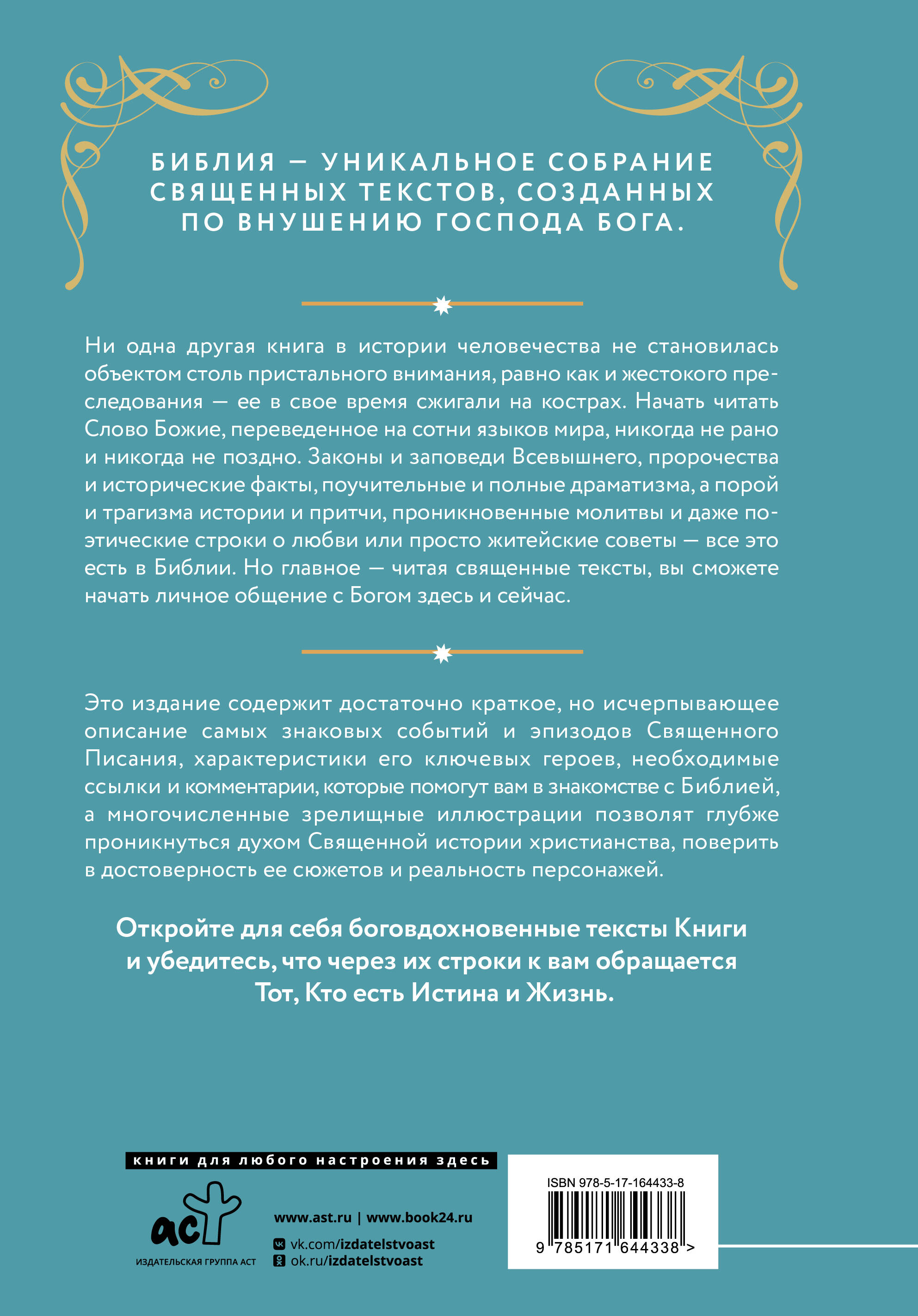 Библия - священная книга христианства. Начать знакомство с ней никогда не рано и никогда не поздно. Хотя бы ради того, чтобы понять, на чем основывается непрестанный интерес к этой Книге книг у многих поколений читателей самого разного возраста, уровня образования, общественного положения и мировоззрения. Путь разума в поисках истины чаще всего приводит человека к Богу, и Господь говорит с ним через строки Священного Писания. Это издание, содержащее краткое, но исчерпывающее описание важнейших событий и эпизодов Библии, лаконичные и вместе с тем образные характеристики ключевых героев Ветхого и Нового Завета, их деяний и взаимоотношений с Богом, станет проводником для каждого, кто решил открыть для себя святую книгу христианства и прикоснуться к сокровищам ее духовной мудрости. Зрелищные иллюстрации, сопровождающие повествование о тех или иных этапах Священной истории, сделают знакомство с содержанием Священного Писания не только более понятным, но и по-настоящему увлекательным для тех, кто только ступил на путь познания сакрального мира христианской веры, основанного на ее боговдохновенных текстах. Начните изучать Библию, ведь это, как утверждают великие учители христианства, ваш шанс на личное общение с Богом здесь и сейчас.| Издательство | Издательство "АСТ" |