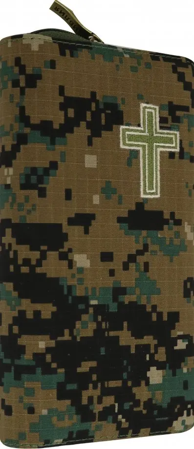 Формат 83х175 мм, "камуфляжный" переплет на молнии, закладка, индексы для поиска библейских книг.
