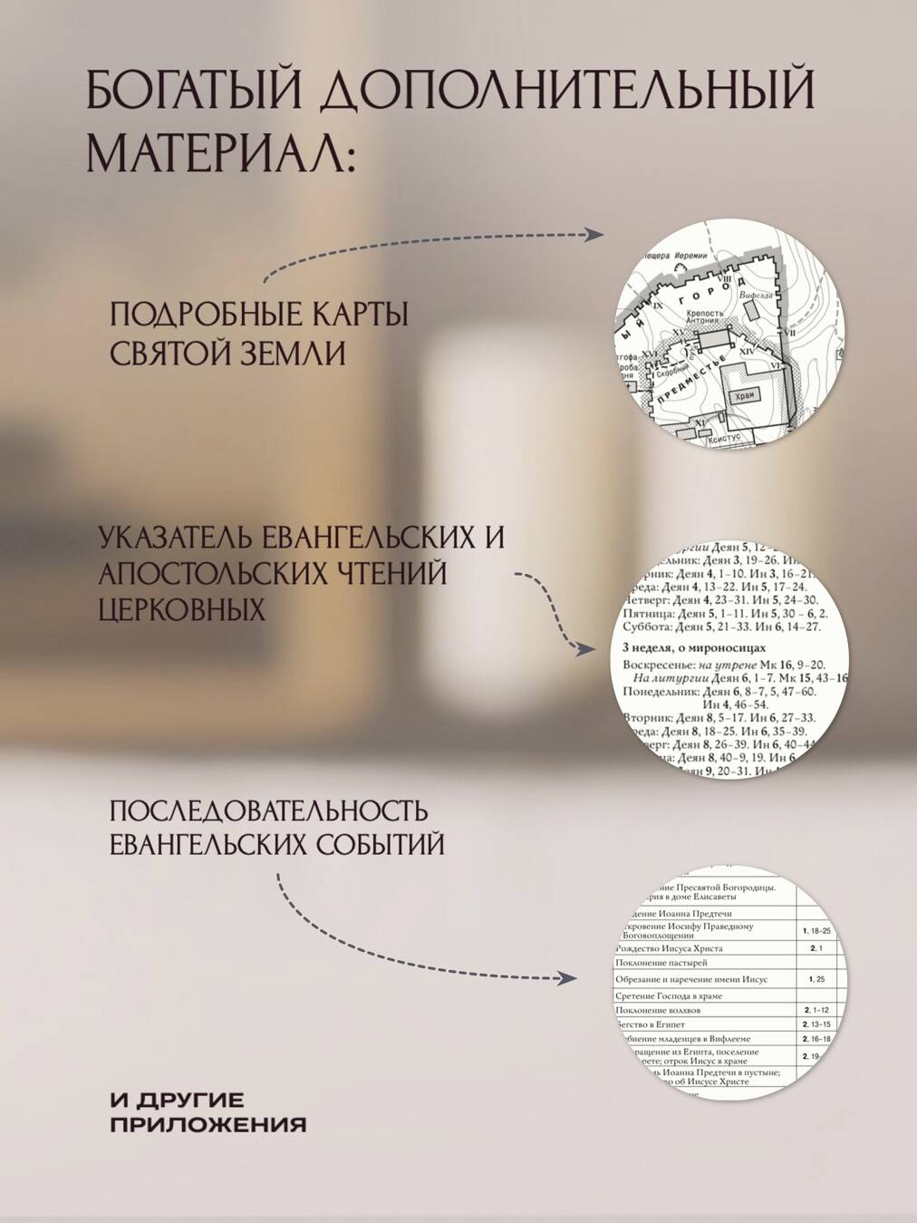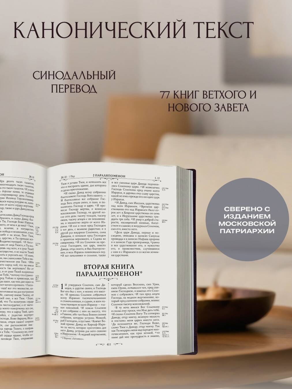 Полная Библия в русском Синодальном переводе, совершенном в XIX веке Российским Святейшим Синодом для домашнего чтения. Содержит все книги церковнославянской Елизаветинской Библии: 50 книг Ветхого Завета и 27 книг Нового Завета. С параллельными местами, указателем евангельских и апостольских церковных чтений, последовательностью евангельских событий по четырем евангелистам, последовательностью событий по книге Деяний святых апостолов, картами и другими приложениями. Перевод имеет высокий авторитет и широко используется в православной Церкви и других христианских конфессиях, сверен по изданию Московской Патриархии 2011 года. Большой формат, крупный шрифт.| Издательство | ООО "Издательство "Эксмо" |