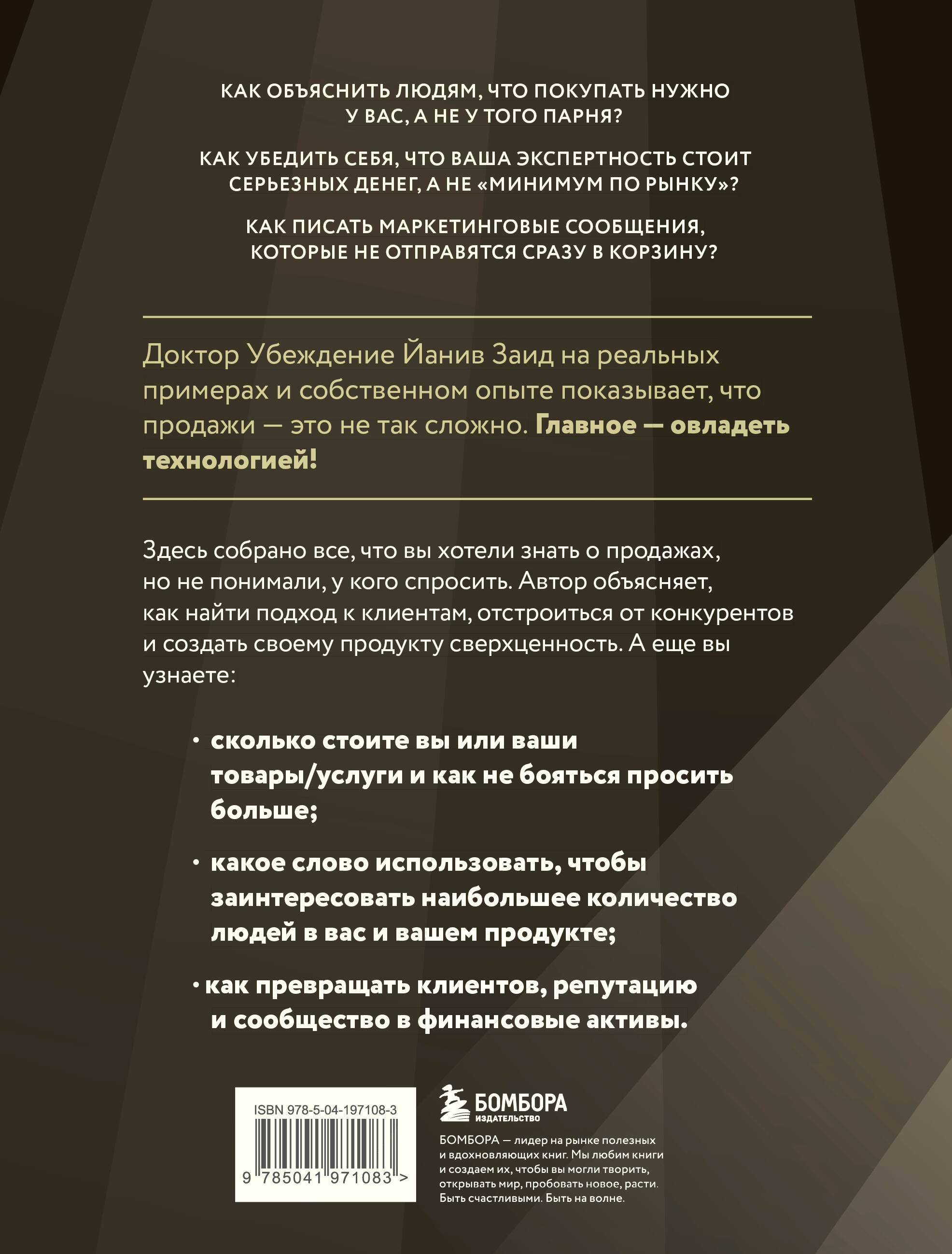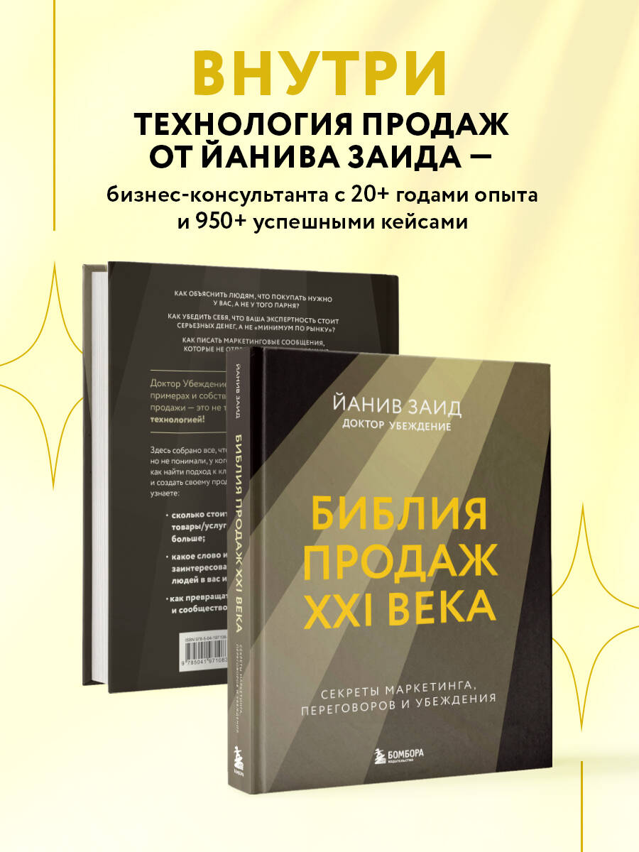 Как объяснить людям, что покупать нужно у вас, а не у того парня? Как убедить себя, что ваша экспертность стоит серьезных денег, а не «минимум по рынку»? Как писать маркетинговые сообщения, которые не отправятся сразу в корзину? «Доктор Убеждение» Йанив Заид на реальных примерах и собственном опыте показывает, что продажи - это не так сложно. Главное - овладеть технологией! Здесь собрано все, что вы хотели знать о продажах, но не понимали, у кого спросить. Автор объясняет, как найти подход к клиентам, отстроиться от конкурентов и создать своему продукту сверхценность. А еще вы узнаете: - сколько стоите вы или ваши товары/услуги и как не бояться просить больше; - какое слово использовать, чтобы заинтересовать наибольшее количество людей в вас и вашем продукте; - как превращать клиентов, репутацию и сообщество в финансовые активы.| Издательство | ООО "Издательство "Эксмо" |