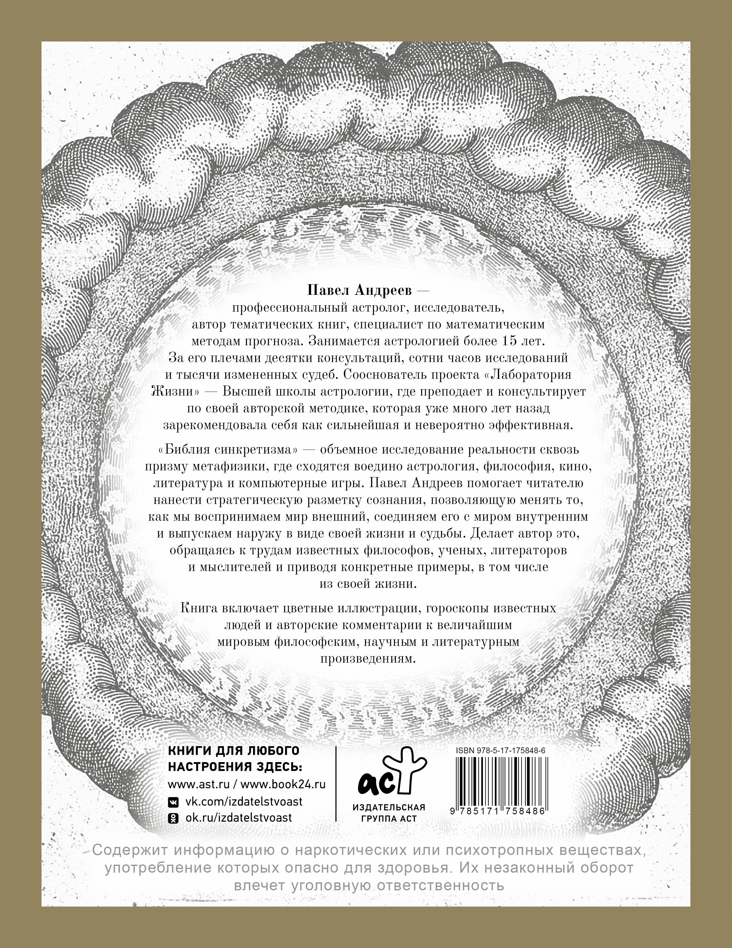 Павел Андреев - профессиональный астролог, исследователь, автор тематических книг, специалист по математическим методам прогноза. Занимается астрологией более 15 лет. За его плечами десятки консультаций, сотни часов исследований и тысячи измененных судеб. Сооснователь проекта "Лаборатория Жизни" - Высшей школы астрологии, где преподает и консультирует по своей авторской методике, которая уже много лет назад зарекомендовала себя как сильнейшая и невероятно эффективная. "Библия синкретизма" - объемное исследование реальности сквозь призму метафизики, где сходятся воедино астрология, философия, кино, литература и компьютерные игры. Павел Андреев помогает читателю нанести стратегическую разметку сознания, позволяющую менять то, как мы воспринимаем мир внешний, соединяем его с миром внутренним и выпускаем наружу в виде своей жизни и судьбы. Делает автор это, обращаясь к трудам известных философов, ученых, литераторов и мыслителей и приводя конкретные примеры, в том числе из своей жизни. Книга включает цветные иллюстрации, гороскопы известных людей и авторские комментарии к величайшим мировым философским, научным и литературным произведениям.| Издательство | Издательство "АСТ" |