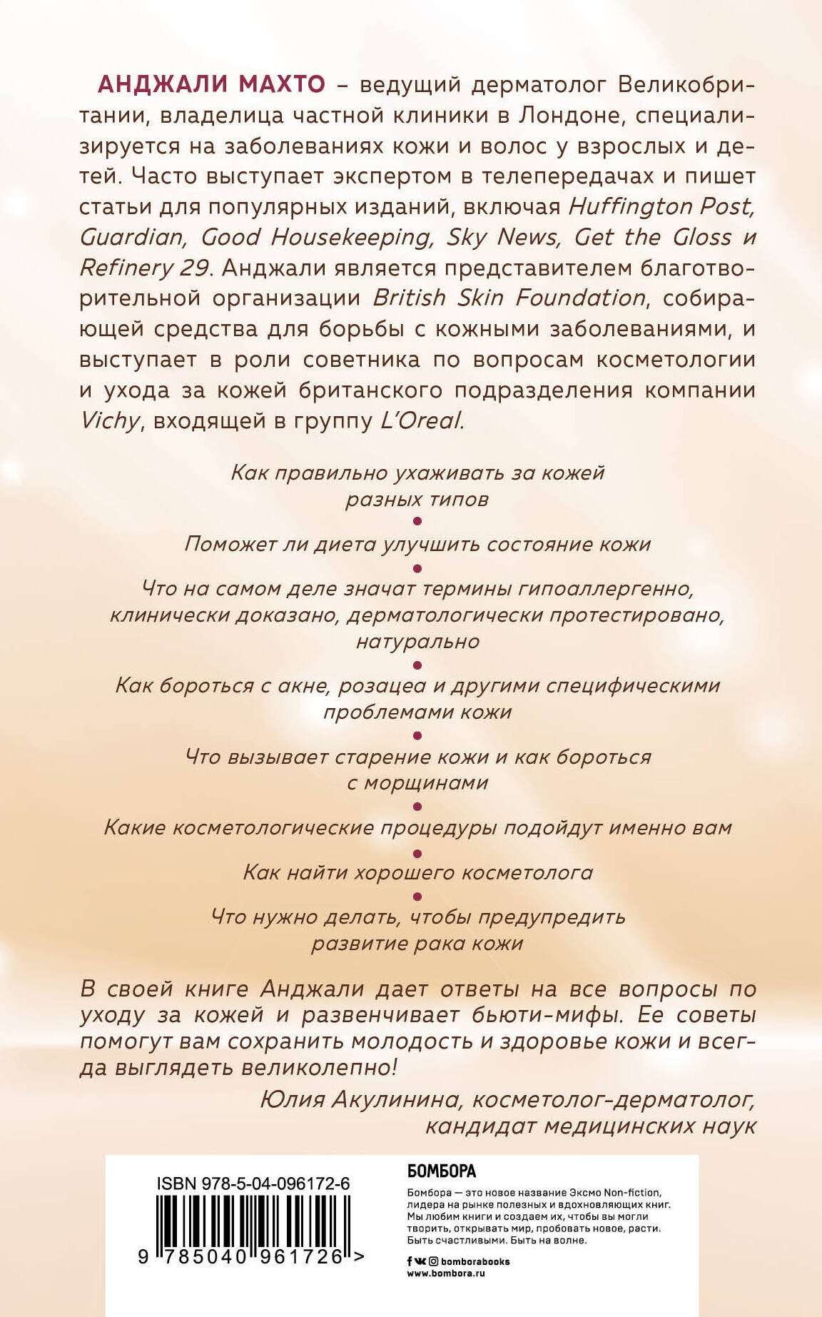 Каждая женщина понимает, насколько важно следить за своей внешностью. Но как не утонуть в непрерывном водовороте терминов, рекламных обещаний, бабушкиных рецептов и советов бьюти-блогеров? Эта книга профессионально и понятно рассказывает о том, что представляет собой кожа, какие процессы происходят в различных ее слоях и что необходимо делать, если на коже появились раздражение, зуд, пигментные пятна или признаки прежде­временного старения. В своей книге доктор Махто развенчивает все мифы о том, что лечение в домашних условиях поможет оздоровить кожу, сделать ее красивой и молодой, а также избавит от реальных кожных заболеваний. Благодаря профессиональным советам автора вы узнаете, как сделать кожу чистой и сохранить ее здоровье и молодость на всю жизнь.