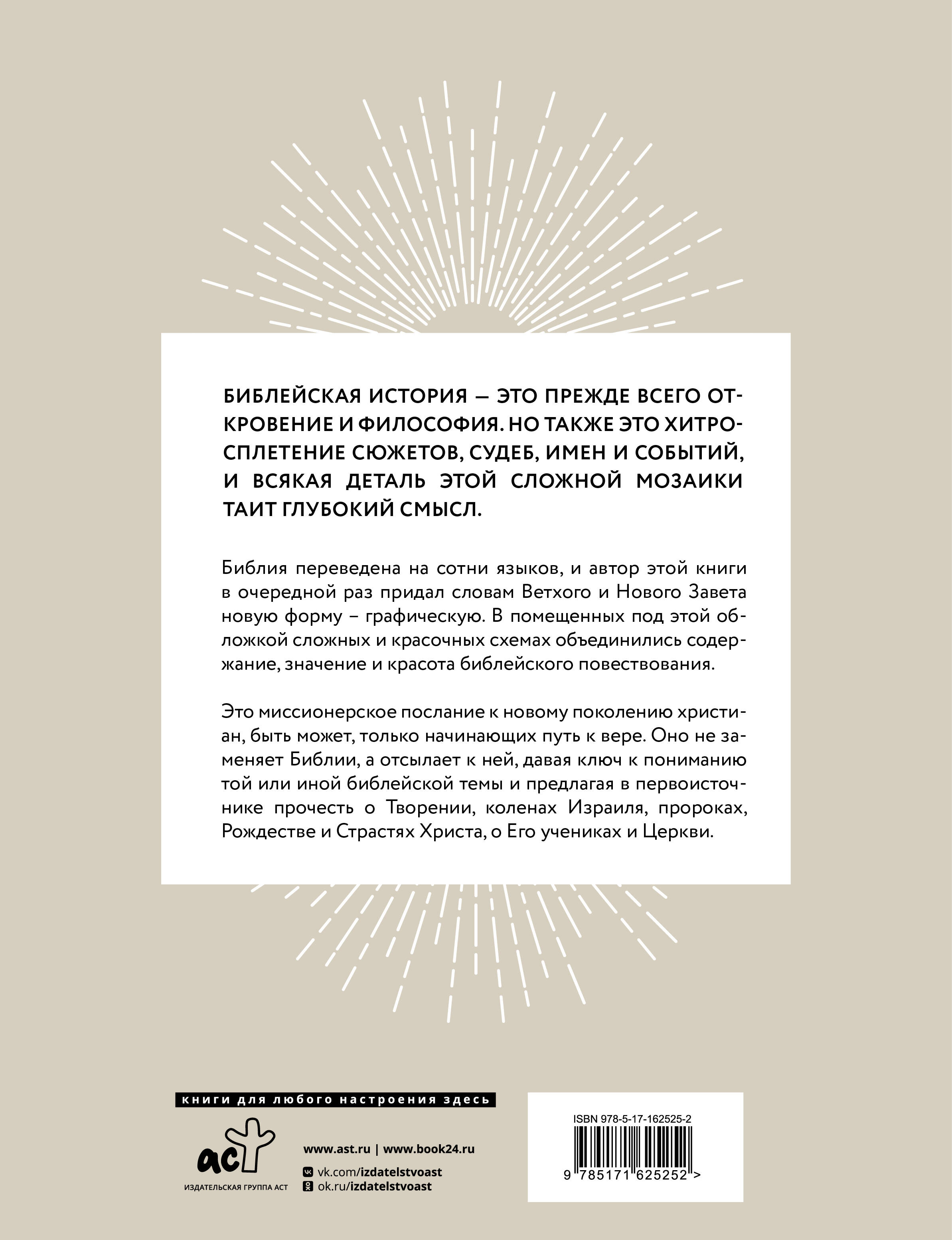 Библейская история - это, прежде всего, откровение и философия. Но также это хитросплетение сюжетов, судеб, имен и событий, и всякая деталь этой сложной мозаики таит глубокий смысл. Библия переведена на сотни языков, и авторы этой книги в очередной раз придали словам Ветхого и Нового Заветов новую форму - графическую. В помещенных под этой обложкой сложных и красочных схемах объединились содержание, значение и красота библейского повествования. Это миссионерское послание к новому поколению христиан, быть может, только начинающих путь к вере. Оно не заменяет Библии, а отсылает к ней, давая ключ к пониманию той или иной библейской темы и предлагая в первоисточнике прочесть о Творении, коленах Израиля, пророках, Рождестве и Страстях Христа, о Его учениках и Церкви.| Издательство | Издательство "АСТ" |