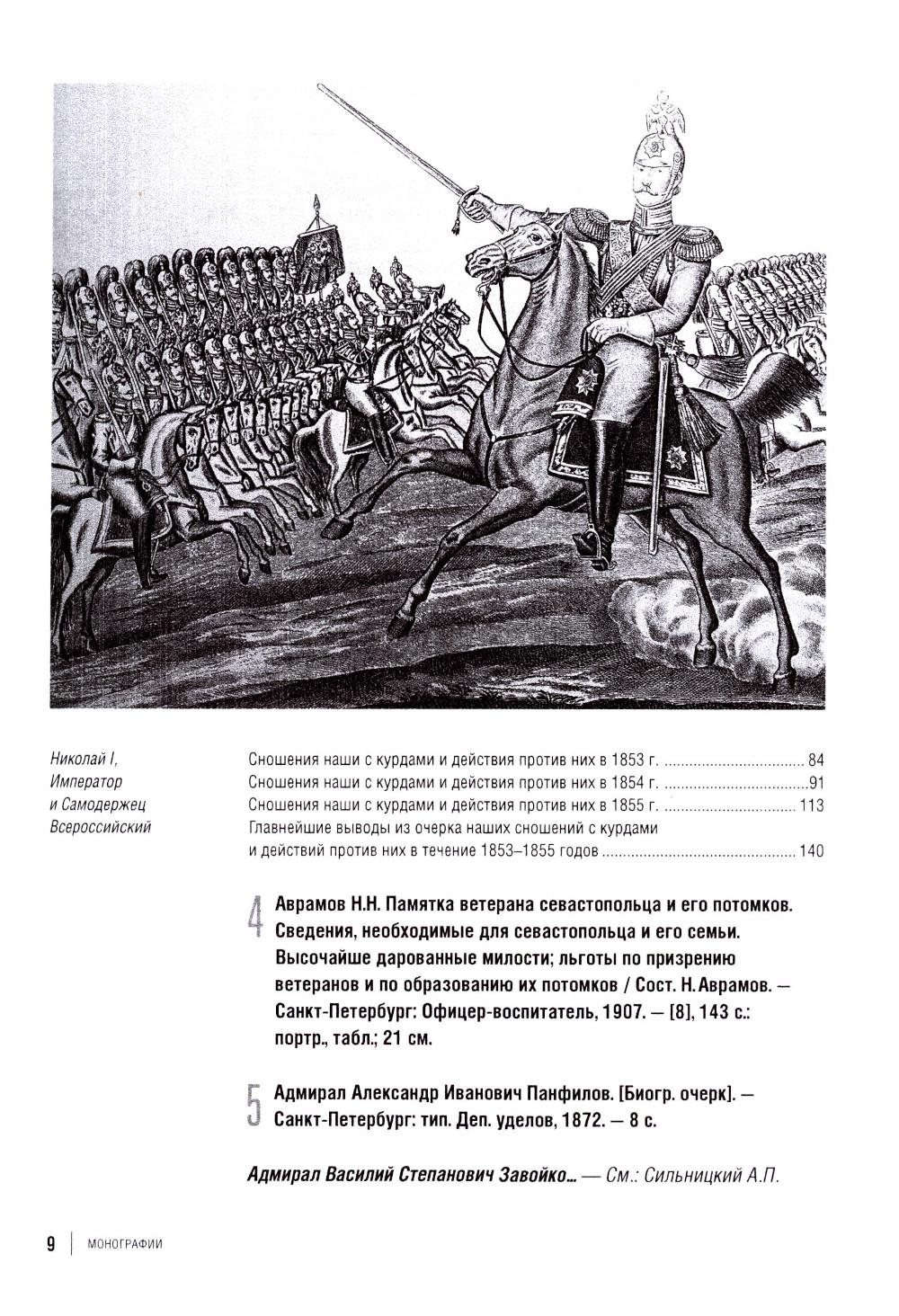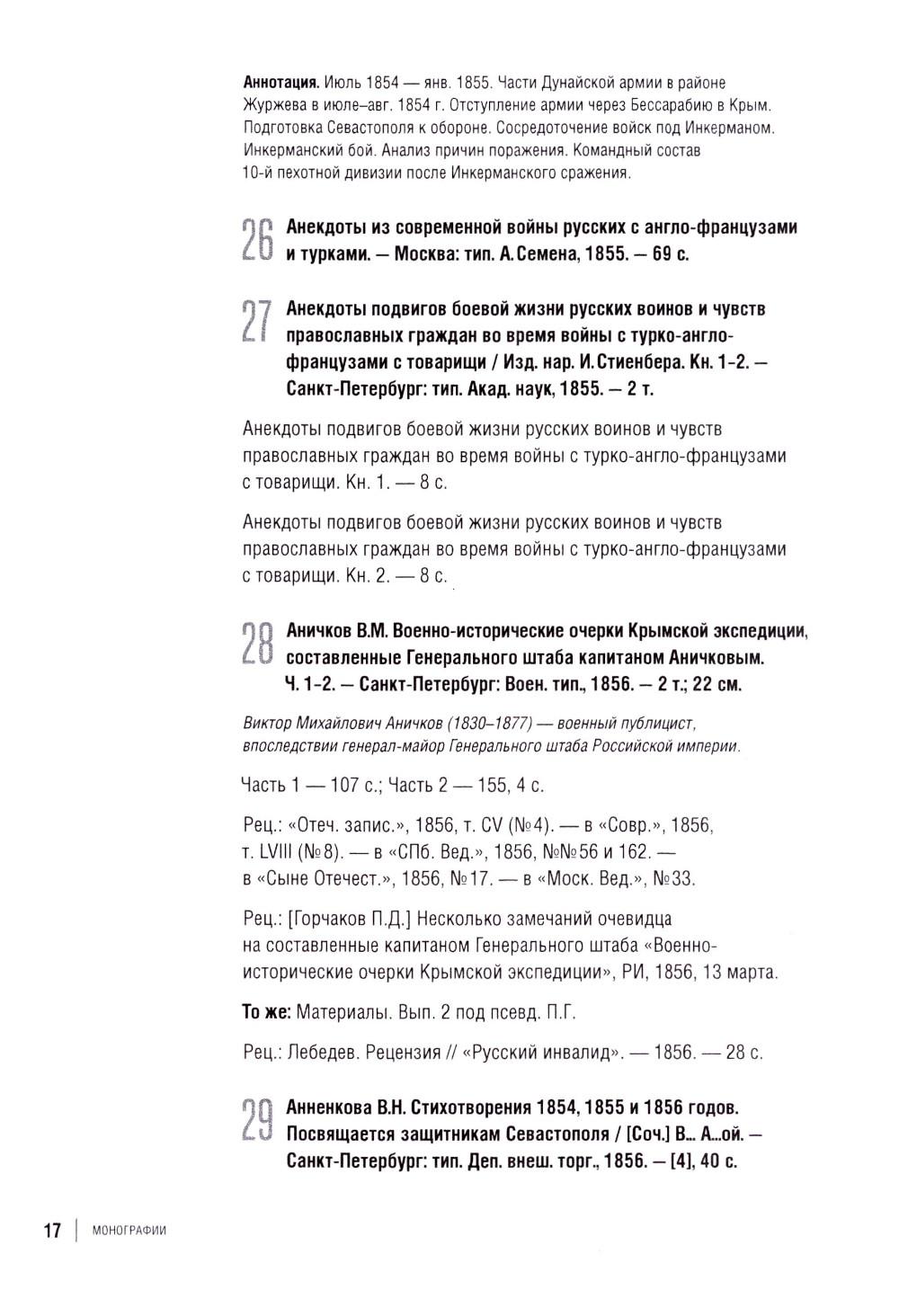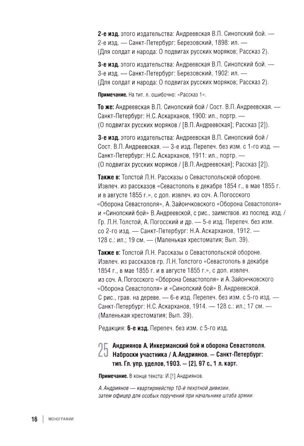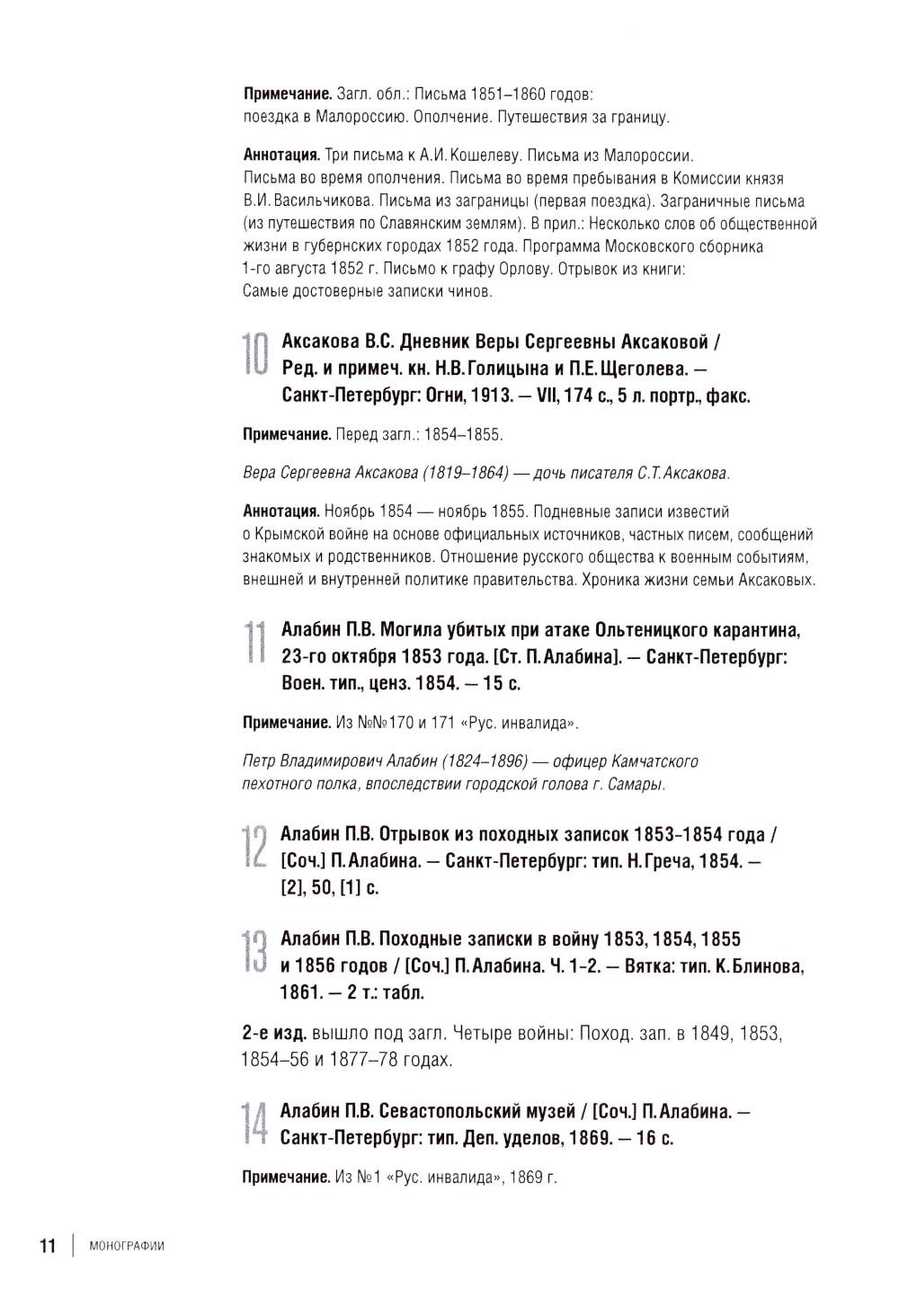 В первый том иллюстрированной «Библиографии Крымской войны» включено более 1000 изданий, описывающих указанное событие и/или содержащих важную (по мнению автора библиографии) информацию о нем и/или информацию, имеющую непосредственное отношение к выбранной теме. Таким образом, в основную часть библиографии вошли не только мемуары и непосредственно описания событий на всех театрах боевых действий, но и публикации о внешнеполитической, дипломатической деятельности, общественных настроениях, художественные произведения, летучие издания и краеведческая литература. В приложения к основной части включены полковые истории, картографические материалы, литографии и лубки. Предполагаются к изданию следующие тома Библиографии: «Периодические издания на русском языке до 1917 года», «Монографии и периодические издания на русском языке после 1917 года», а также «Монографии на иностранных языках».| Издательство | Принципиум |