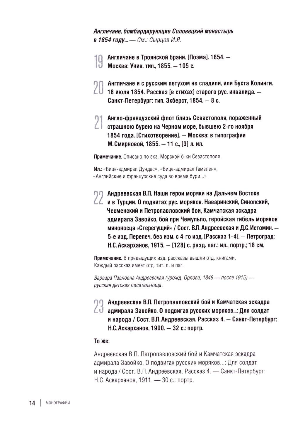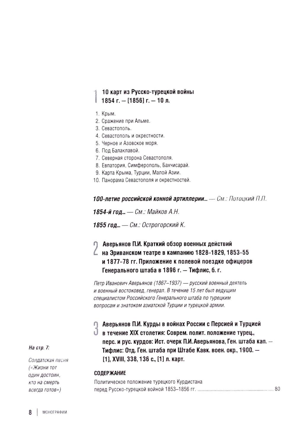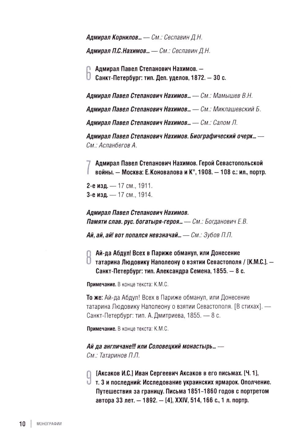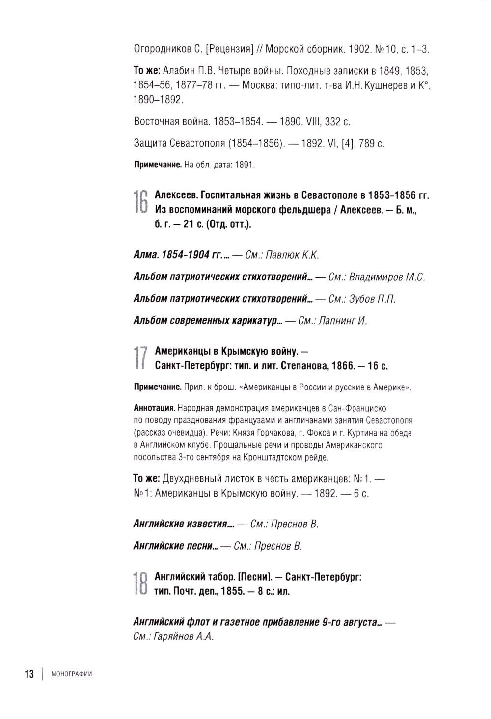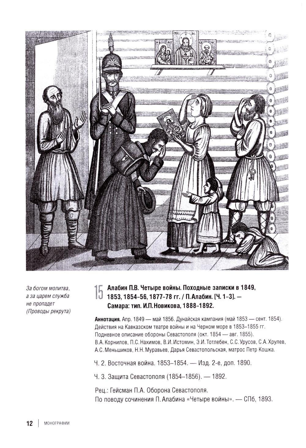 В первый том иллюстрированной «Библиографии Крымской войны» включено более 1000 изданий, описывающих указанное событие и/или содержащих важную (по мнению автора библиографии) информацию о нем и/или информацию, имеющую непосредственное отношение к выбранной теме. Таким образом, в основную часть библиографии вошли не только мемуары и непосредственно описания событий на всех театрах боевых действий, но и публикации о внешнеполитической, дипломатической деятельности, общественных настроениях, художественные произведения, летучие издания и краеведческая литература. В приложения к основной части включены полковые истории, картографические материалы, литографии и лубки. Предполагаются к изданию следующие тома Библиографии: «Периодические издания на русском языке до 1917 года», «Монографии и периодические издания на русском языке после 1917 года», а также «Монографии на иностранных языках».| Издательство | Принципиум |