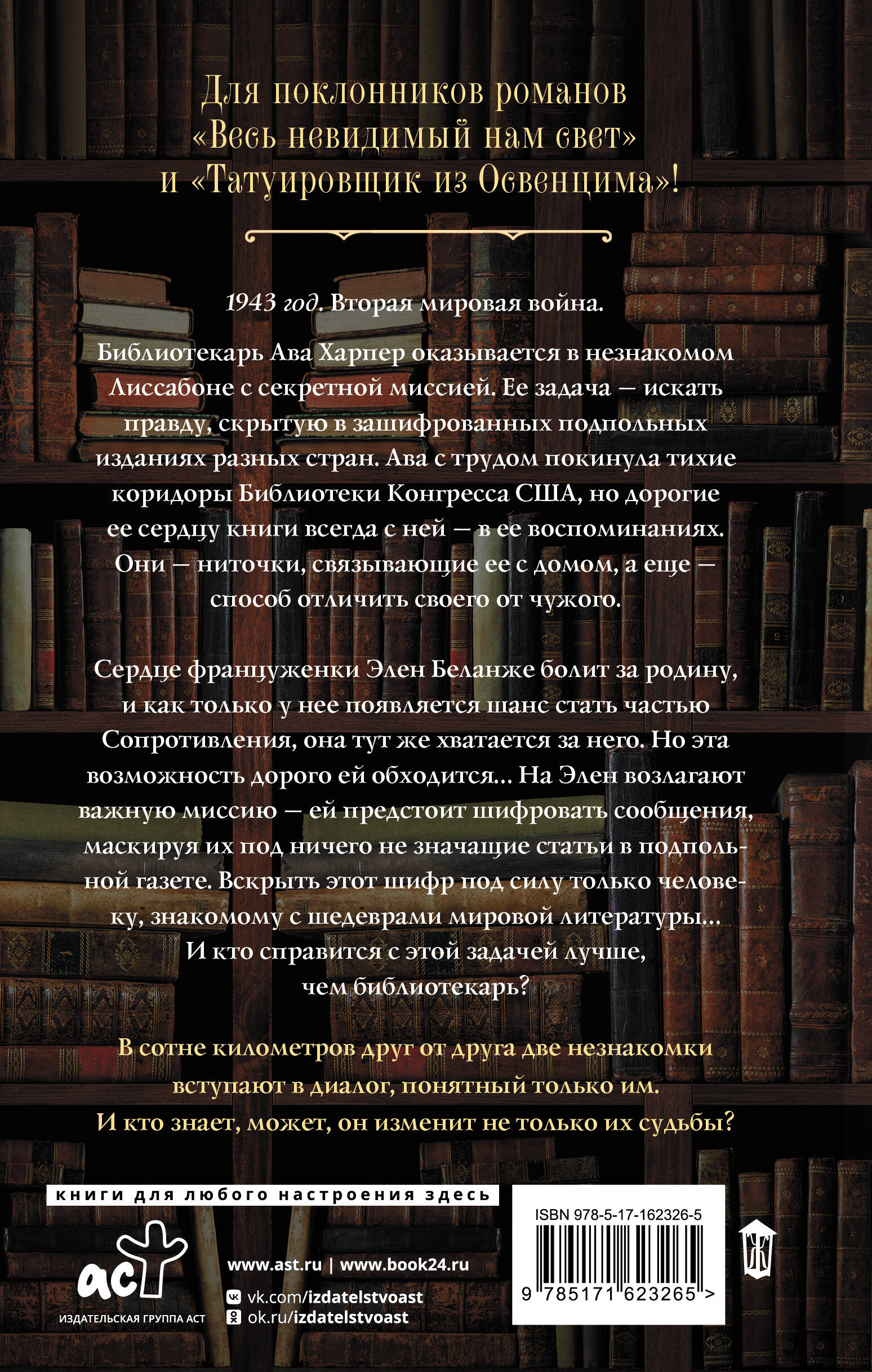 Книга, основанная на реальных историях библиотечного шпионажа времен Второй мировой! Национальный бестселлер в США. От автора романа «Последняя книжная лавка в Лондоне» и других бестселлеров The New York Times и USA Today. Переведена на 27 языков, 66000 добавлений в список для чтения и 22500 оценок на Goodreads. Понравится фанатам романов «Книжный вор» и «Татуировщик из Освенцима». Серия «Книги о книгах» - лучшие современные романы о литературных произведениях, повлиявших на ход истории. Читайте книгу, покорившую любителей исторических романов по всему миру! Захватывающий рассказ о двух девушках, вступивших в смертельно опасную переписку, разворачивающийся на улицах Лиссабона и Парижа военного времени. Удастся ли двум женщинам направить ход Второй мировой войны в иное русло?| Издательство | Издательство "АСТ" |