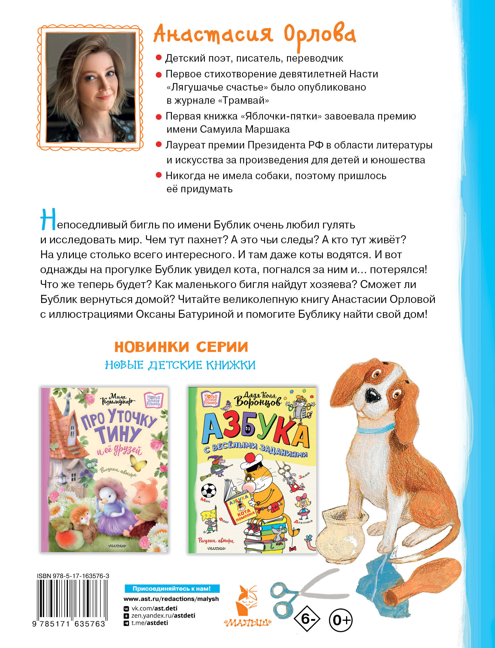 Анастасия Орлова - детский поэт, писатель, переводчик. Первое стихотворение девятилетней Насти «Лягушачье счастье» было опубликовано в журнале «Трамвай». Первая книжка «Яблочки-пятки» завоевала премию имени Самуила Маршака. Лауреат премии Президента РФ в области литературы и искусства за произведения для детей и юношества. Никогда не имела собаки, поэтому пришлось её придумать. Непоседливый бигль по имени Бублик очень любил гулять и исследовать мир. Чем тут пахнет? А это чьи следы? А кто тут живёт? На улице столько всего интересного. И там даже коты водятся. И вот однажды на прогулке Бублик увидел кота, погнался за ним и… потерялся! Что же теперь будет? Как маленького бигля найдут хозяева? Сможет ли Бублик вернуться домой? Читайте великолепную книгу Анастасии Орловой с иллюстрациями Оксаны Батуриной и помогите Бублику найти свой дом!| Издательство | Издательство "АСТ" |
