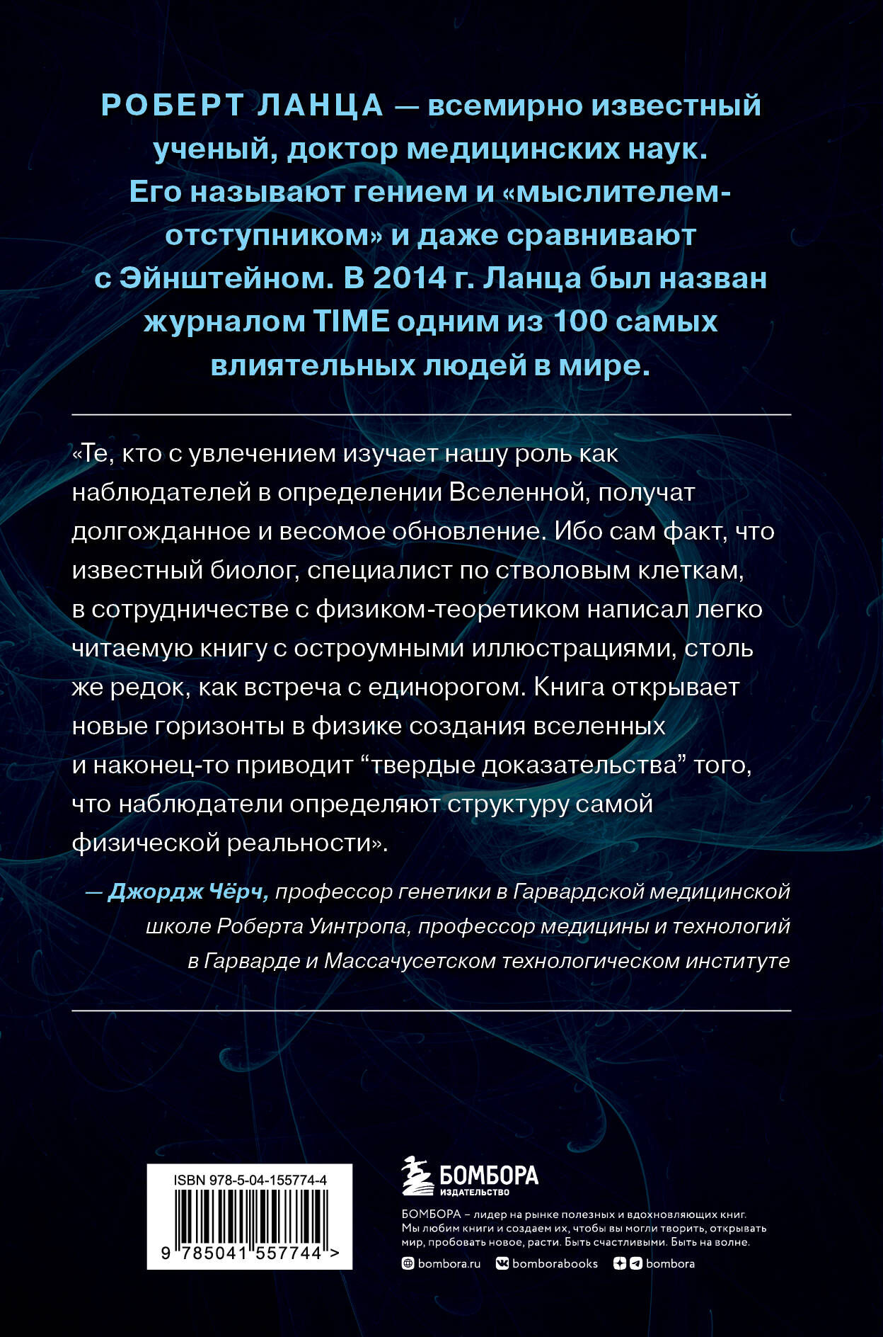 «Те, кто с увлечением изучают нашу роль как наблюдателей в определении Вселенной, получат долгожданное и весомое обновление. Ибо сам факт, что известный биолог, специалист по стволовым клеткам, в сотрудничестве с физиком-теоретиком написал связную, свежую и легко читаемую книгу с остроумными иллюстрациями, - столь же редок, как встреча с единорогом. "Биоцентризм. Великий дизайн" открывает новые горизонты в физике создания вселенных и наконец-то приводит "твердые доказательства" того, что наблюдатели определяют структуру самой физической реальности». - Джордж Черч, профессор генетики в Гарвардской медицинской школе Роберта Уинтропа, профессор медицины и технологий в Гарварде и Массачусетском технологическом институте «"Биоцентризм. Великий дизайн" с блеском обращает наше внимание на наиболее важную особенность всей нашей Вселенной - а именно на человеческий разум. Роберт Ланца с большим знанием и красноречиво анализирует ту степень проникновения, которую человеческий разум постиг в понимании математического аппарата, лежащего в основе этой Вселенной, раскрывая его глубинный и чисто ментальный характер. По сути, именно микроскопическое исследование этого внешнего мира физиками наиболее ярко раскрывает "великий дизайн" Вселенной. Новая книга повествует о реальной природе Вселенной: все мы ради полного постижения должны докопаться до самой сути».| Издательство | ООО "Издательство "Эксмо" |