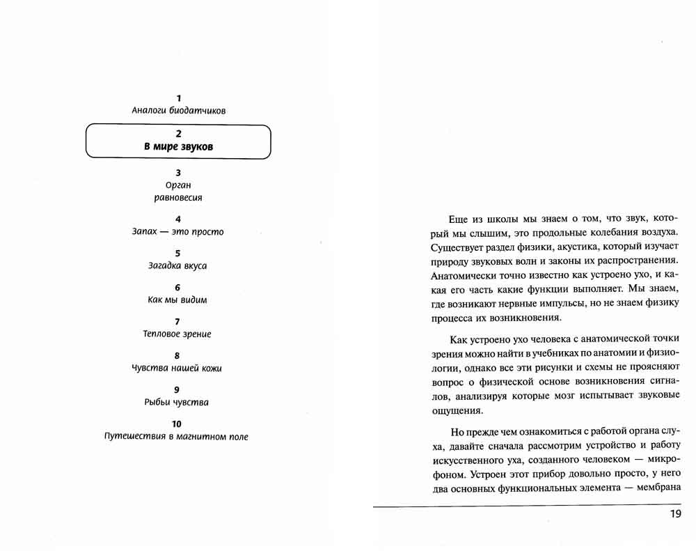 В книге изложены биофизические основы и механизмы функционирования органов чувств не только человека, но и животных. В ней проводятся параллели между функционированием разных органов чувств, приводятся доказательства. того, что все органы чувств построены на основе одного и того же рецептора. Прочитав книгу, вы узнаете: - что все наши органы чувств созданы природой на основе одного чувствительного элемента; - какой параметр молекулы определяет ее запах; - как возникают электрические импульсы в наших органах чувств; - почему наши органы чувств снабжены логарифмической шкалой; - как работает вестибулярный аппарат; - как работают живые термолокаторы; - как работает птичий компас; - что такое рыбьи чувства. Книга рассчитана на школьников старших классов, студентов и всех интересующихся популярной физиологией.