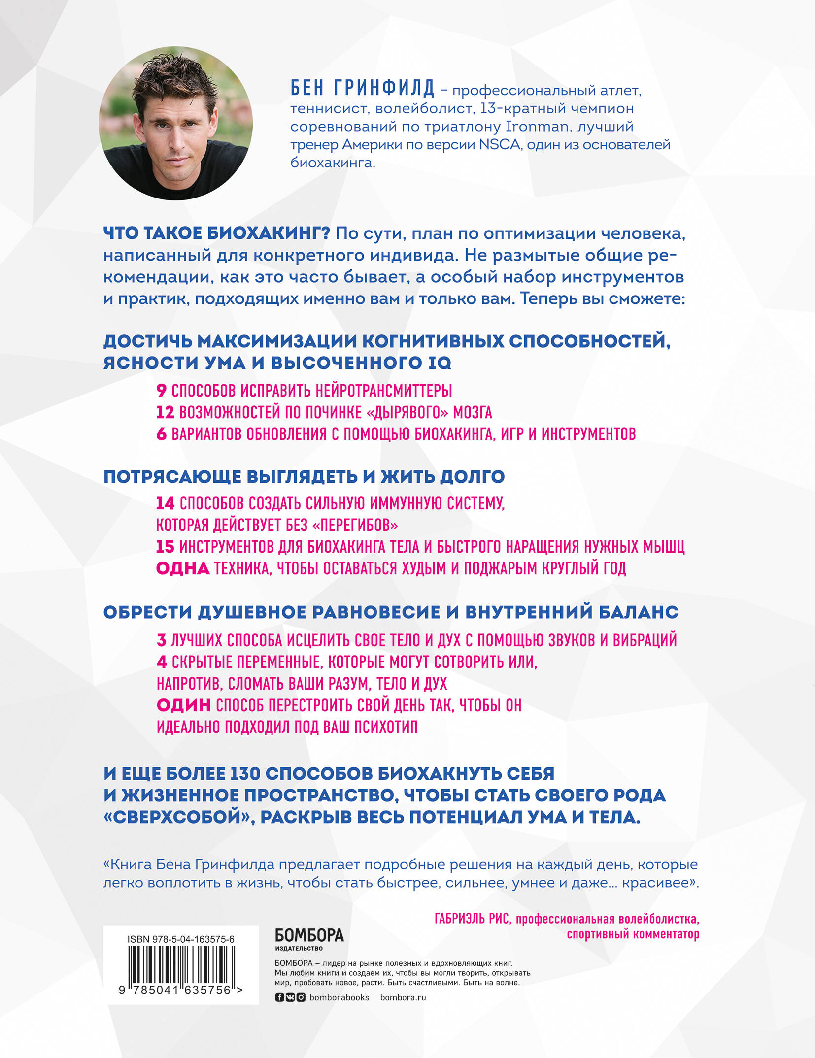 Самый известный в мире биохакер Бен Гринфилд создал уникальную систему по формированию максимально производительного ума, идеального тела и удовлетворенного жизнью духа. Для оптимизации мыслительной деятельности он предлагает: - 9 способов исправить нейротрансмиттеры; - 12 способов вылечить «дырявый» мозг; - 8 проверенных способов избавиться от стресса и попрощаться с высоким уровнем кортизола; - 15 способов безопасно использовать ноотропы и умные лекарства, а также 8 лучших добавок, стимулирующих работу мозга. Для формирования идеального молодого тела вы получите: - 6 способов получить быстрые, мощные мышцы; - лучшую программу тренировок для максимального увеличения мышечной массы и одновременной потери жира; - одну простую тактику для того, чтобы оставаться худым и стройным круглый год с минимальными усилиями. И, чтобы помочь вам жить полноценной и счастливой жизнью, автор приготовил: - 12 техник исцеления тела с помощью вашей собственной внутренней аптеки; - 4 лучших способа исцелить свое тело и дух с помощью звуков и вибраций; - 6 способов биохакнуть спальню для лучшего секса и более продолжительных оргазмов.| Издательство | Эксмо |