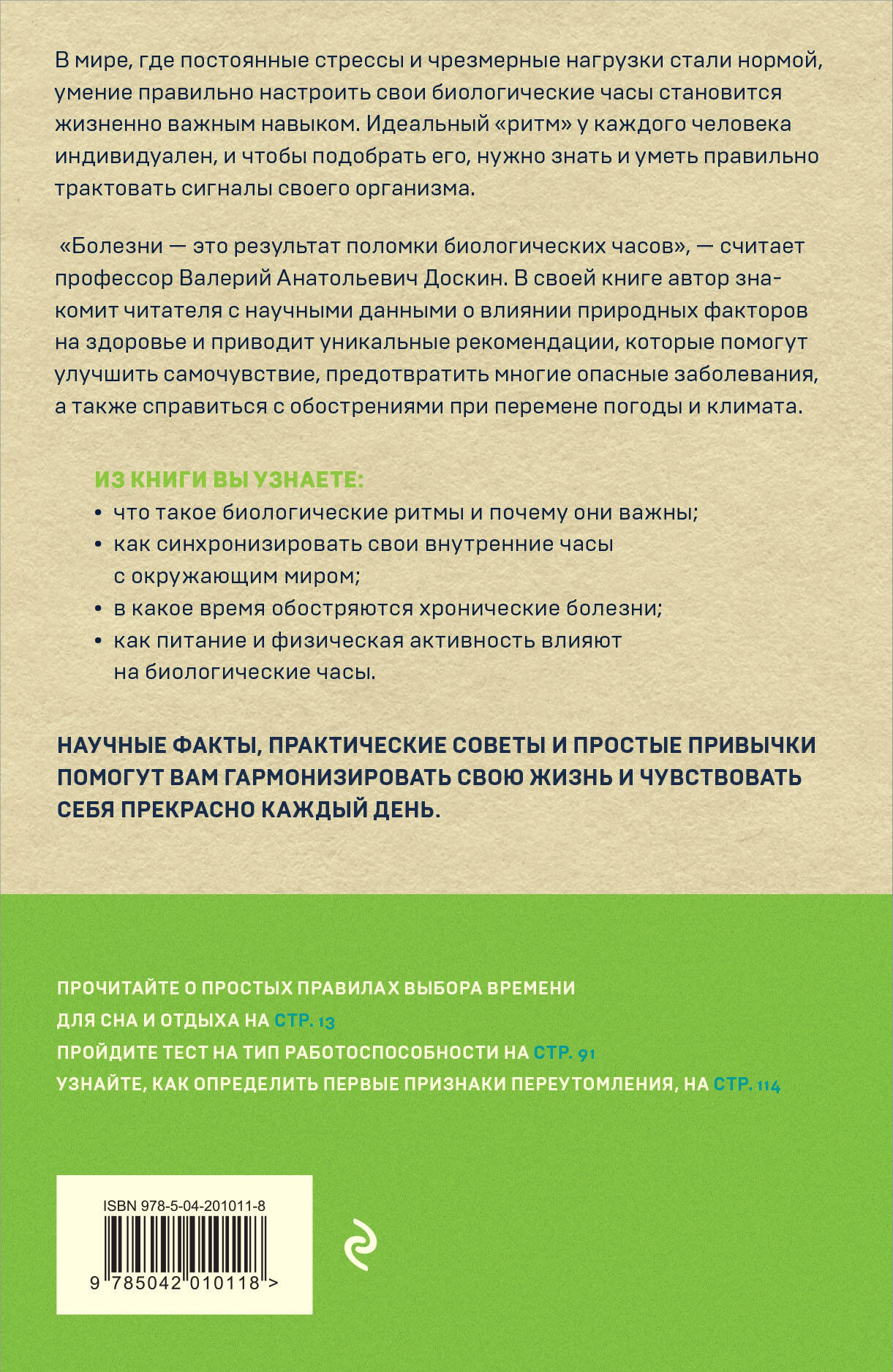 Постоянная усталость, стресс, моральное истощение, нарушения питания и режима сна - причиной всего этого может служить сбой в работе внутреннего часового механизма или биоритмов. Автор книги, Доскин Валерий Анатольевич, доктор медицинских наук, профессор, заслуженный деятель науки РФ, автор более 500 научных публикаций, делится практическими рекомендациями, которые легко внедрить в повседневную жизнь. Вы научитесь: - Определять свои уникальные биоритмы. - Находить идеальное время для сна, питания и физических упражнений. - Избегать стрессов и улучшать общее самочувствие. Новое оформление книги «Биоритмы для здоровья. Как улучшить свое состояние по биологическим часам».| Издательство | ООО "Издательство "Эксмо" |