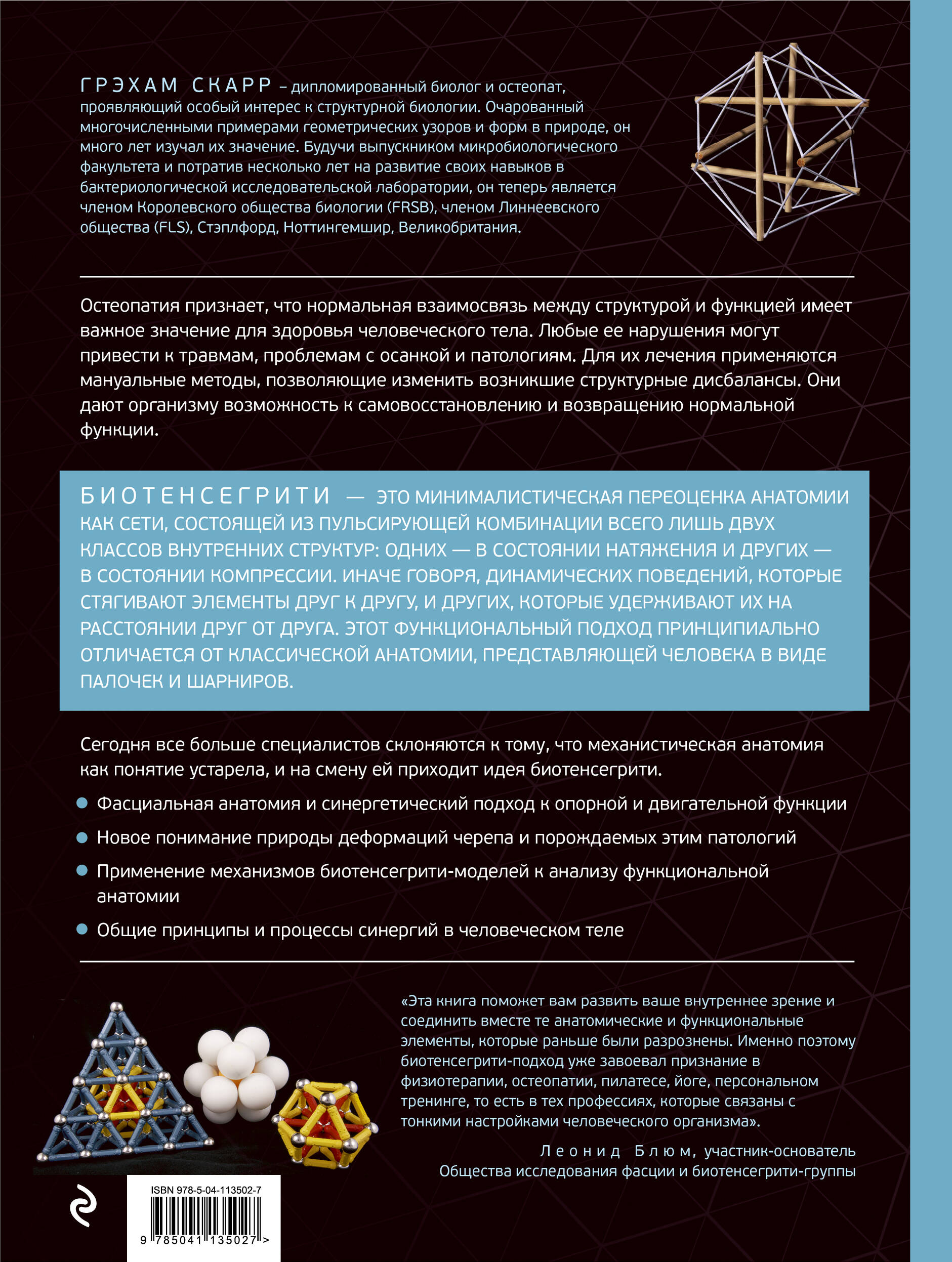 Вот уже 20 лет книга Т. Майерса «Анатомические поезда» открывает перед практиками физиотерапии, реабилитации и фитнеса совершенно новое понимание анатомических и функциональных связей, преодолевая раздробленность и фрагментарность традиционного преподавания анатомии, как списка отдельных мышц, связок, костей и т.д. Но что представляют собой прославившие Т. Майерса миофасциальные меридианы «анатомических поездов» в более широком смысле? Это - частные примеры синергий в сетях динамического натяжения в организме человека. В своей книге Т. Майерс, конечно же, упоминает и объясняет понятие тенсегрити, ссылаясь на Р.Б. Фуллера, но делает это очень кратко и без дальнейшего развития. Книга Г. Скарра - это следующая ступень для тех, кто убедился на практике в применимости и пользе тех конкретных частных синергий, о которых говорит Т. Майерс, и теперь мотивирован к тому, чтобы пойти дальше и начать понимать не только частные примеры, но и самые общие принципы и процессы синергий в нашем теле.| Издательство | Эксмо |