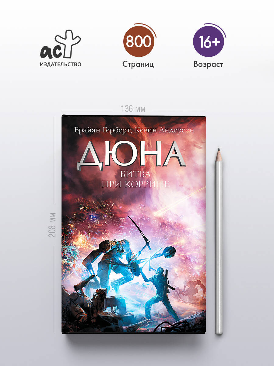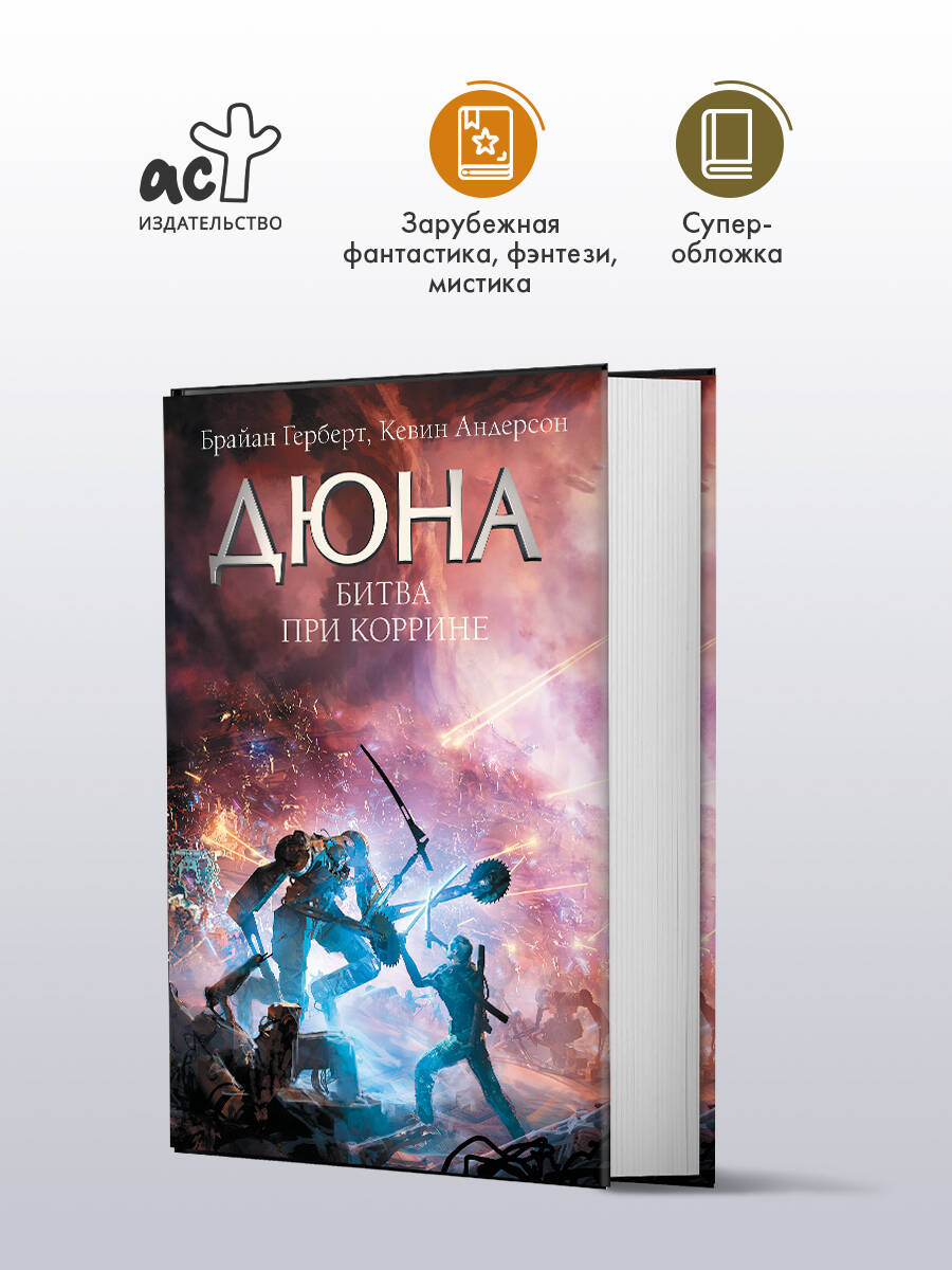С момента событий, описанных в "Крестовом походе машин", прошло пятьдесят шесть тяжелых лет. После смерти Серены Батлер наступают самые кровавые десятилетия джихада. Планеты Синхронизированных Миров освобождаются одна за другой, и у людей появляется надежда, что конец чудовищного гнета жестоких машин уже близок. Тем временем всемирный компьютерный разум Омниус готовит новую ловушку для человечества. По Вселенной стремительно распространяется смертоносная эпидемия, способная убить все живое. Грядет ужасная Битва при Коррине, в которой у Армии джихада больше не будет права на ошибку. В этой решающей битве человек и машина схлестнутся в последний раз… А на пустынной планете Арракис собираются с силами легендарные фримены, которым через много лет суждено обрести своего Мессию.| Издательство | Издательство "АСТ" |