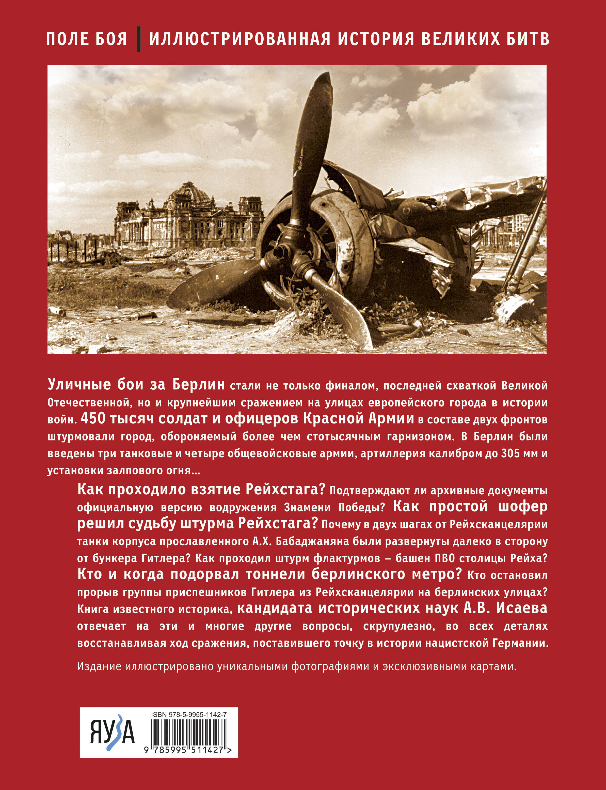 Уличные бои за Берлин стали не только финалом, последней схваткой Великой Отечественной, но и крупнейшим сражением на улицах европейского города в истории войн. 450 тысяч солдат и офицеров Красной Армии в составе двух фронтов штурмовали город, обороняемый более чем стотысячным гарнизоном. В Берлин были введены три танковые и четыре общевойсковые армии, артиллерия калибром до 305 мм и установки залпового огня… Как проходило взятие Рейхстага? Подтверждают ли архивные документы официальную версию водружения Знамени Победы? Как простой шофер решил судьбу штурма Рейхстага? Почему в двух шагах от Рейхсканцелярии танки корпуса прославленного А.Х. Бабаджаняна были развернуты далеко в сторону от бункера Гитлера? Как проходил штурм флактурмов - башен ПВО столицы Рейха? Кто и когда подорвал тоннели берлинского метро? Кто остановил прорыв группы приспешников Гитлера из Рейхсканцелярии на берлинских улицах? Известный историк, кандидат исторических наук А.В. Исаева во всех деталях восстанавливает ход грандиозного сражения, поставившего точку в истории нацистской Германии. Издание иллюстрировано уникальными фотографиями и эксклюзивными картами.| Издательство | Яуза-пресс ООО |