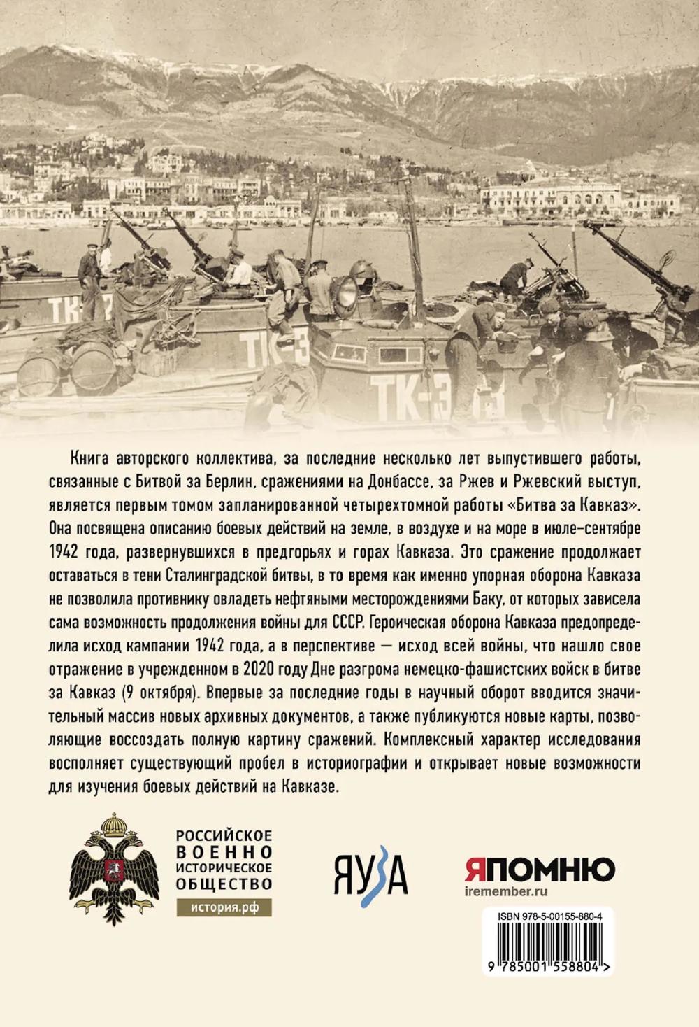 Книга авторского коллектива, за последние несколько лет выпустившего работы, связанные с Битвой за Берлин, сражениями на Донбассе, за Ржев и Ржевский выступ, является первым томом запланированной четырехтомной работы «Битва за Кавказ». Она посвящена описанию боевых действий на земле, в воздухе и на море в июле-сентябре 1942 года, развернувшихся в предгорьях и горах Кавказа. Это сражение продолжает оставаться в тени Сталинградской битвы, в то время как именно упорная оборона Кавказа не позволила противнику овладеть нефтяными месторождениями Баку, от которых зависела сама возможность продолжения войны для СССР. Героическая оборона Кавказа предопределила исход кампании 1942 года, а в перспективе - исход всей войны, что нашло свое отражение в учрежденном в 2020 году Дне разгрома немецко-фашистских войск в битве за Кавказ (9 октября). Впервые за последние годы в научный оборот вводится значительный массив новых архивных документов, а также публикуются новые карты, позволяющие воссоздать полную картину сражений. Комплексный характер исследования восполняет существующий пробел в историографии и открывает новые возможности для изучения боевых действий на Кавказе.| Издательство | Яуза-каталог |