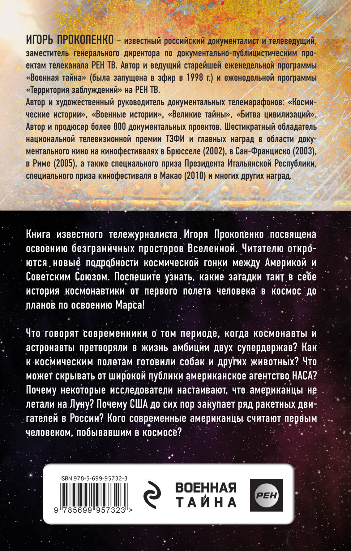 Книга известного тележурналиста Игоря Прокопенко посвящена освоению безграничных просторов Вселенной. Читателю откроются новые подробности космической гонки между Америкой и Советским Союзом. Поспешите узнать, какие загадки таит в себе история космонавтики от первого полета человека в космос до планов по освоению Марса! Что говорят современники о том периоде, когда космонавты и астронавты претворяли в жизнь амбиции двух супердержав? Как к космическим полетам готовили собак и других животных? Что может скрывать от широкой публики американское агентство НАСА? Почему некоторые исследователи настаивают, что американцы не летали на Луну? Почему США до сих пор закупают ряд ракетных двигателей в России? Кого современные американцы считают первым человеком, побывавшим в космосе?