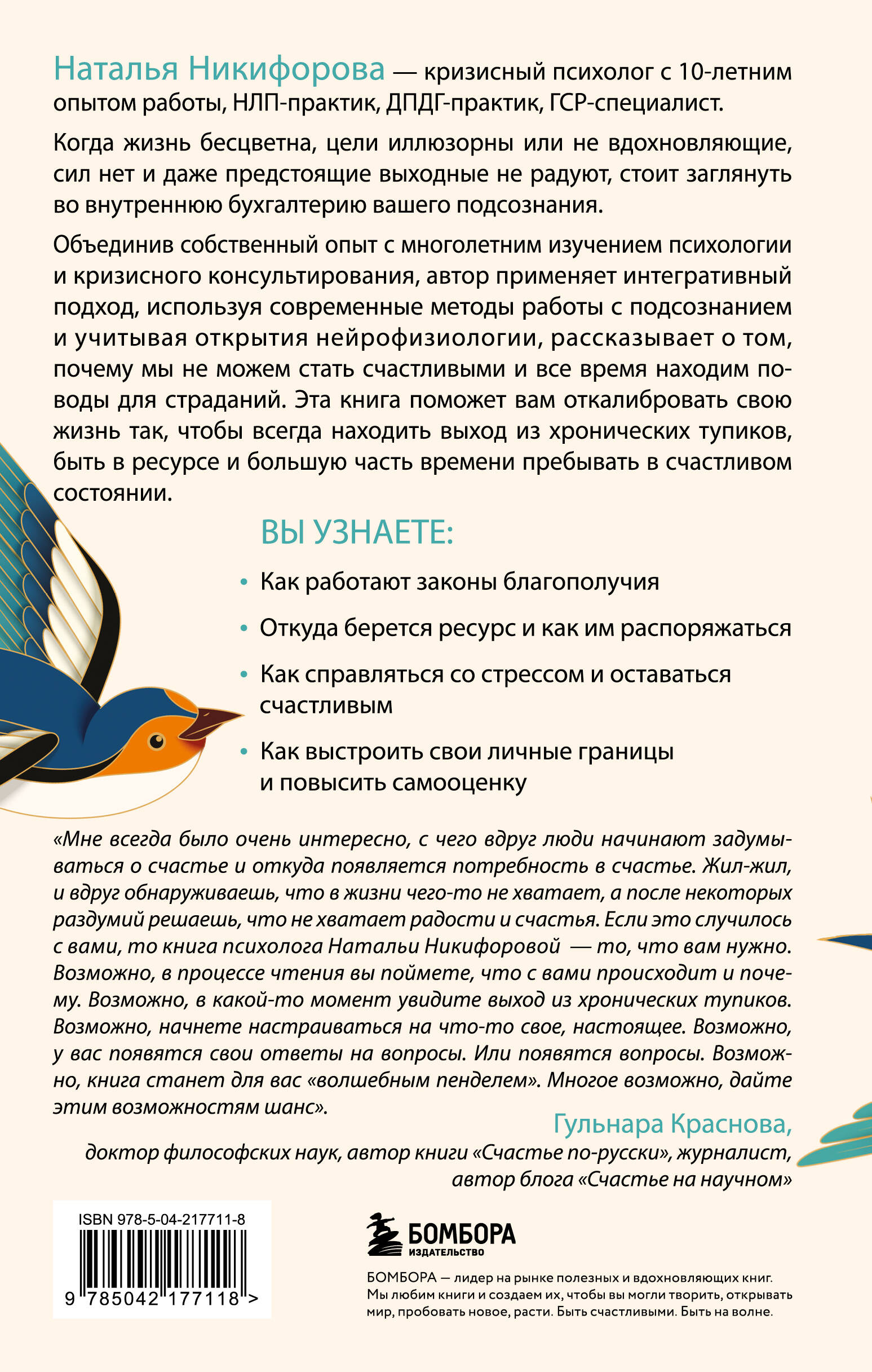 Когда жизнь бесцветна, цели иллюзорные или не вдохновляющие, сил нет и даже предстоящие выходные не радуют, стоит заглянуть во внутреннюю бухгалтерию вашего подсознания. Автор этой книги Наталья Никифорова, кризисный психолог с 10-летним опытом работы, НЛП-практик, ДПДГ-практик, ГСР-специалист, применяет интегративный подход на практике, используя современные методы работы с подсознанием и учитывая открытия нейрофизиологи, и рассказывает о том, почему мы не можем стать счастливыми и все время «находим» поводы для страданий. Эта книга поможет вам откалибровать свою жизнь так, чтобы всегда находить выход из хронических тупиков, быть в ресурсе и большую часть времени пребывать в счастливом состоянии. ВЫ УЗНАЕТЕ: • Как работают законы благополучия. • Откуда берется ресурс и как им распоряжаться. • Как справляться со стрессом и оставаться счастливым. • Как выстроить свои личные границы и повысить самооценку. «Мне всегда было очень интересно, с чего вдруг люди начинают задумываться о счастье и откуда появляется потребность в счастье. Жила-жила и вдруг обнаруживаешь, что в жизни чего-то не хватает, а после некоторых раздумий решаешь, что не хватает радости и счастья. Если это случилось с вами, то книга психолога Натальи Никифоровой - то, что вам нужно. Возможно, в процессе чтения вы поймёте, что с вами происходит и почему. Возможно, в какой-то момент увидите выход из хронических тупиков. Возможно, начнёте настраиваться на что-то своё, настоящее. Возможно, у вас появятся свои ответы на вопросы. Или появятся вопросы. Возможно, книга станет для вас "волшебным пенделем". Многое возможно, дайте этим возможностям шанс». - Гульнара Краснова, доктор философских наук, автор книги «Счастье по-русски», журналист, автор блога «Счастье на научном».| Издательство | ООО "Издательство "Эксмо" |