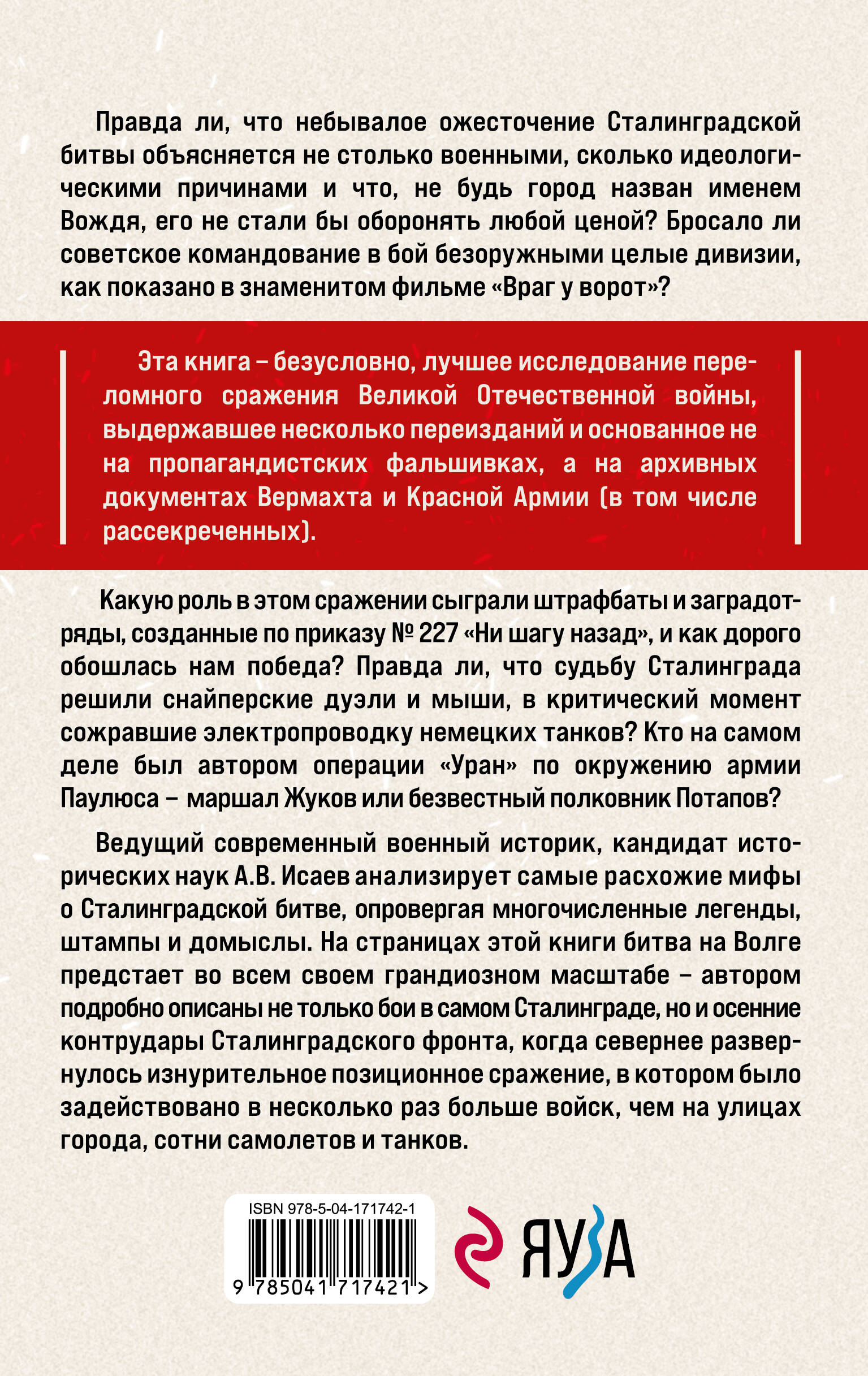 Эта книга - безусловно лучшее исследование переломного сражения Великой Отечественной войны, выдержавшее несколько переизданий и основанное не на пропагандистских фальшивках, а на архивных документах Вермахта и Красной Армии (в том числе, рассекреченных). Правда ли, что небывалое ожесточение Сталинградской битвы объясняется не столько военными, сколько идеологическими причинами, и что, не будь город назван именем вождя, его не стали бы оборонять любой ценой? Бросало ли советское командование в бой безоружными целые дивизии, как показано в знаменитом фильме «Враг у ворот»? Какую роль в этом сражении сыграли штрафбаты и заградотряды, созданные по приказу № 227 «Ни шагу назад», и как дорого обошлась нам победа? Правда ли, что судьбу Сталинграда решили снайперские дуэли и мыши, в критический момент сожравшие электропроводку немецких танков? Кто на самом деле был автором операции «Уран» по окружению армии Паулюса - маршал Жуков или безвестный полковник Потапов? Ведущий современный военный историк, кандидат исторических наук А.В. Исаев анализирует самые расхожие мифы о Сталинградской битве, опровергая многочисленные легенды, штампы и домыслы. На страницах этой книги битва на Волге предстает во всем своем грандиозном масштабе - автором подробно описаны не только бои в самом Сталинграде, но и осенние контрудары Сталинградского фронта, когда севернее развернулось изнурительное позиционное сражение, в котором было задействовано в несколько раз больше войск, чем на улицах города, сотни самолетов и танков.| Издательство | ООО "Издательство "Эксмо" |