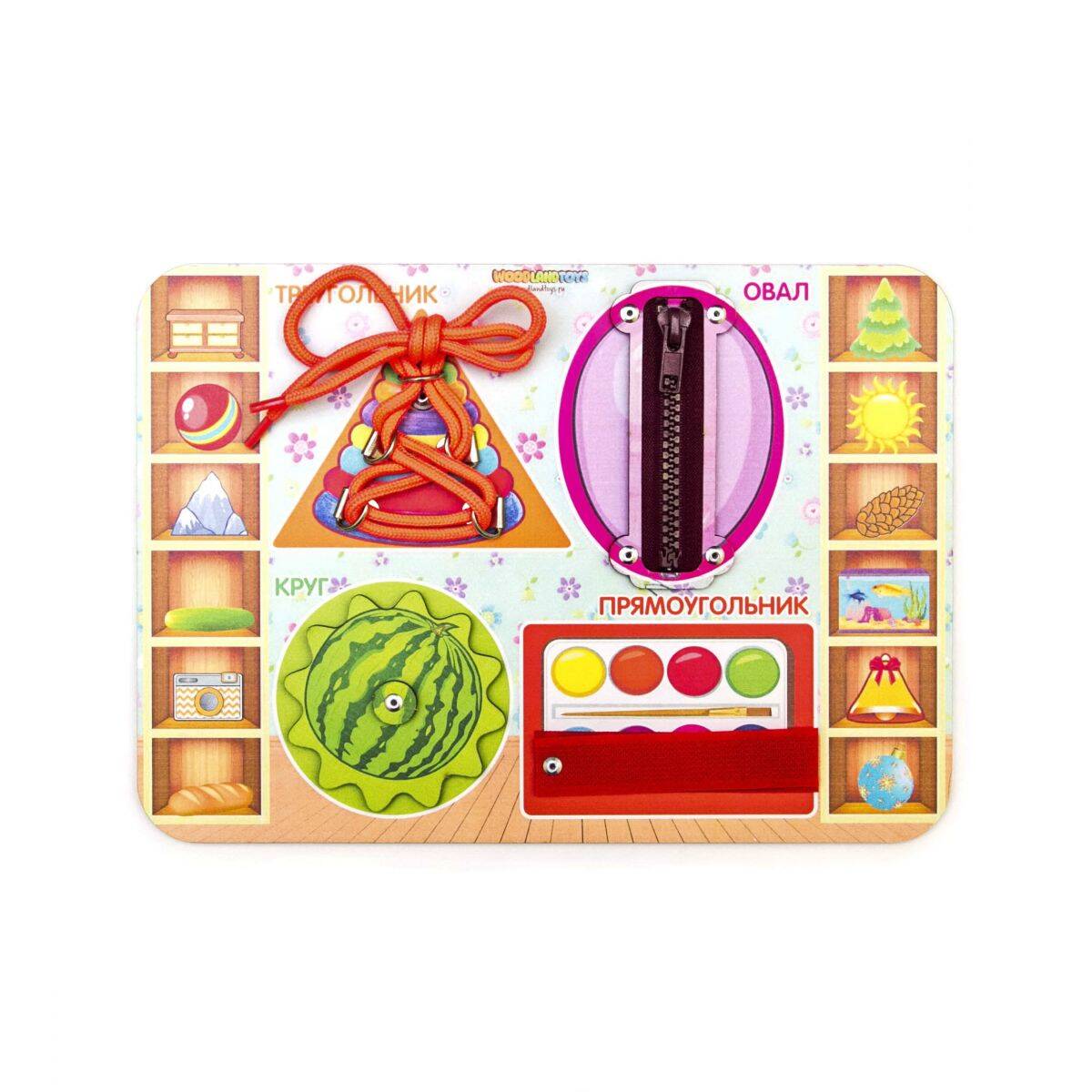 Бизиборд - это популярная многофункциональная развивающая игрушка. Бизиборд "Геометрические формы" представляет собой деревянный планшет с тематическим изображением, на котором расположены замочек с бегунком, липучки разных цветов, шнуровка и подвижная шестеренка. Игра с Бизибордом "Геометрические формы" познакомит ребенка с основными геометрическими фигурами и рассказывает, где какая фигура встречается в жизни. Игры и занятия с Бизибордом развивают мышление, память, воображение, стимулируют мелкую моторику и координацию движения. В процессе игры у ребенка формируются причинно-следственные связи, развивается самостоятельность и познавательная активность. Бизиборд "Геометрические формы" займет ребенка на продолжительное время и принесет массу положительных эмоций.| Издательство | Ковальский Артем Андреевич ИП |