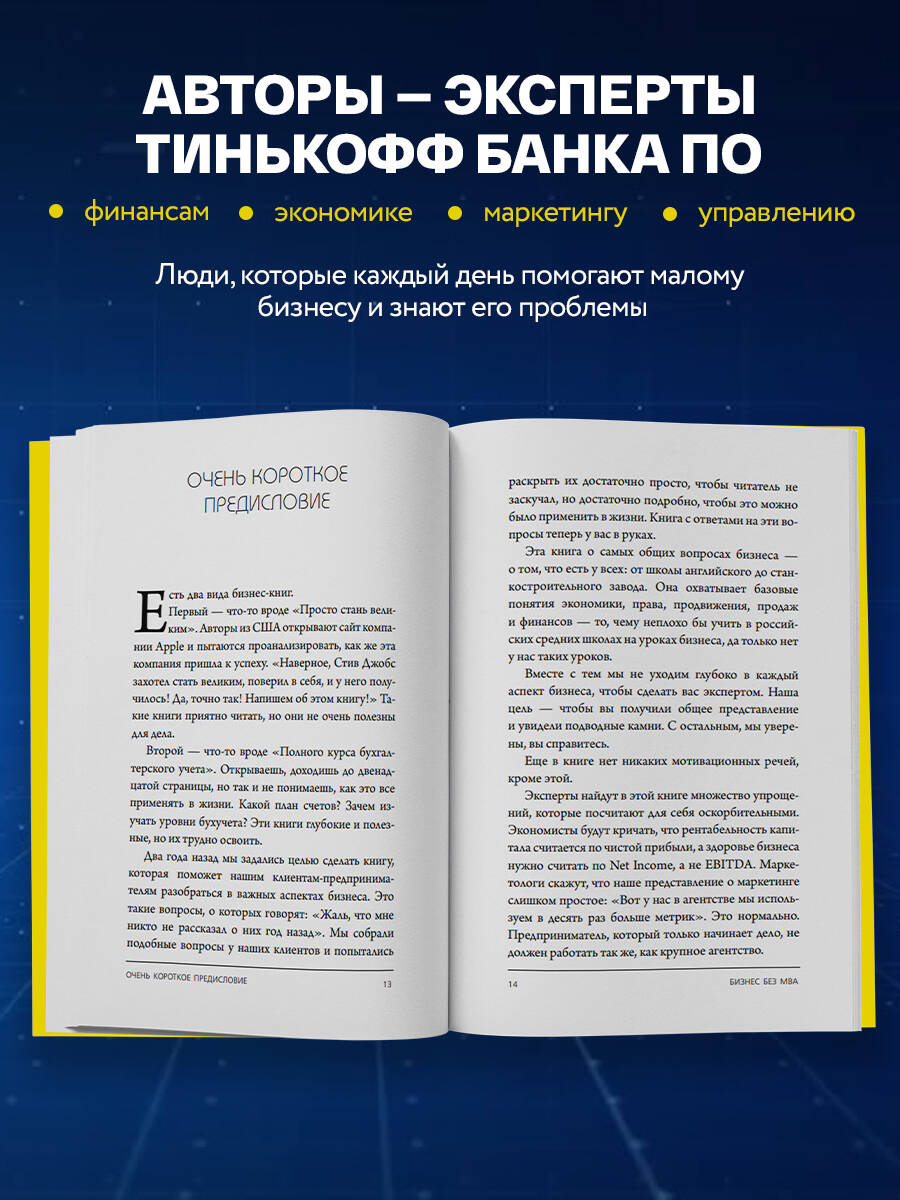 «Бизнес без MBA» - первая в России книга, которая закрывает разрыв между сухой теорией и голым вдохновением. Здесь собраны практические советы для тех, кто только начинает или уже начал своё дело - торговлю, разработку или услуги, в сегменте B2B или B2C. Здесь описаны самые важные вещи, которые помогут предпринимателю на старте: финансы, маркетинг, переговоры, клиентский сервис, отношения с партнерами и банками. Все советы и ситуации взяты из российской практики, на примере российского малого бизнеса. Здесь нет не связанной с жизнью теории и пустых слов вдохновения: только те знания, которые помогут защитить и развивать бизнес в суровых российских условиях. Авторы - эксперты Тинькофф Банка по финансам, экономике, маркетингу и управлению. Это люди, которые каждый день помогают малому бизнесу и знают его проблемы. Редактор - Максим Ильяхов, соавтор бестселлеров «Пиши, сокращай» и «Новые правила деловой переписки». Книга будет полезна всем, кто хочет вложить деньги в бизнес и получить прибыль, несмотря на сложные законы, непростые отношения с партнерами и жесткую конкуренцию.| Издательство | ООО "Издательство "Эксмо" |