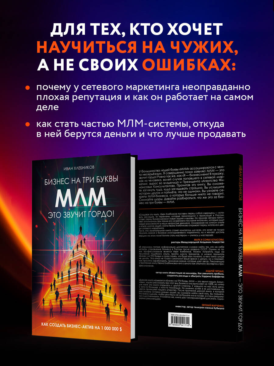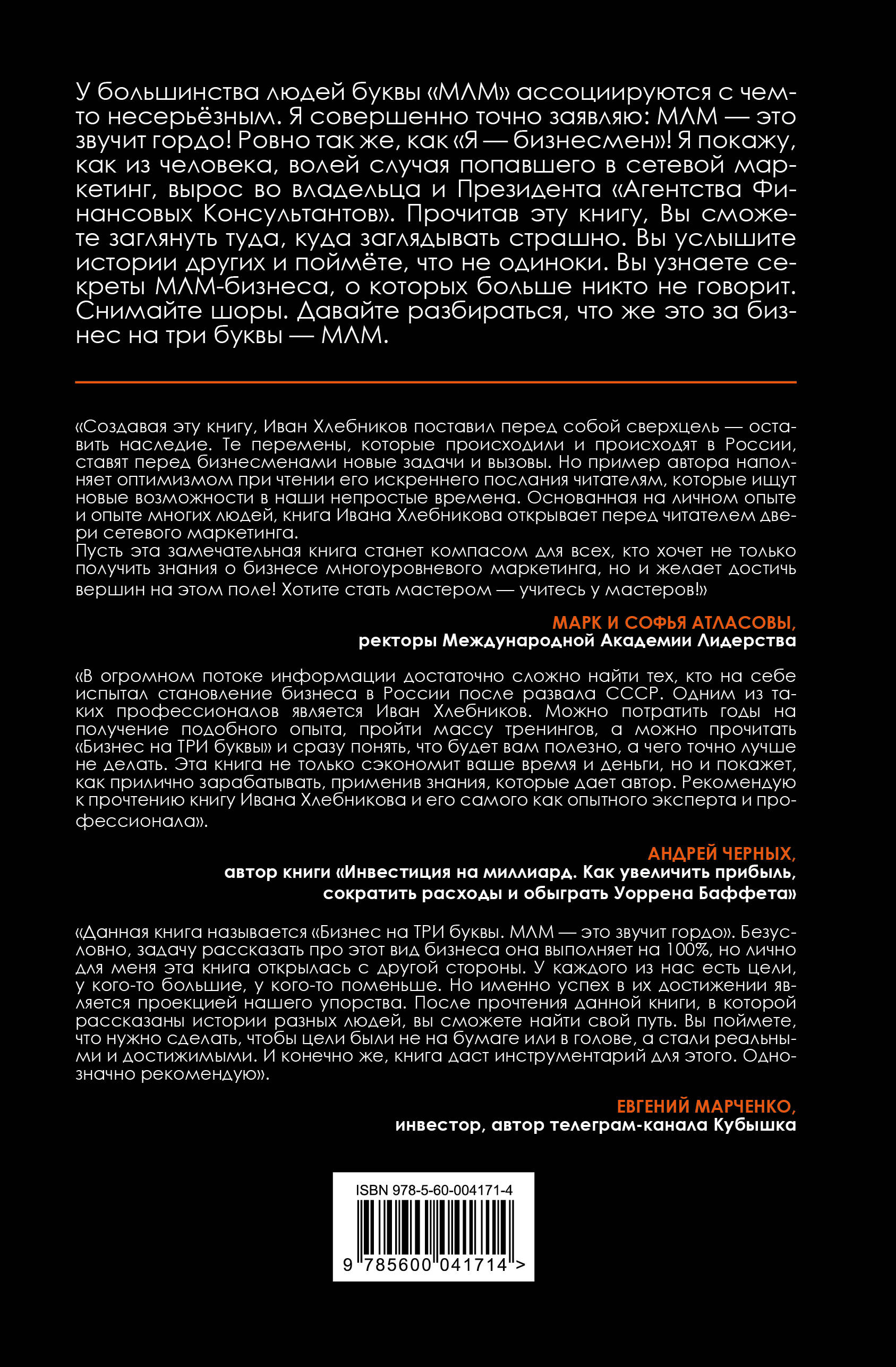 У большинства людей буквы «МЛМ» ассоциируются с чем-то несерьёзным. Я совершенно точно заявляю: МЛМ - это звучит гордо! Ровно так же, как «Я - бизнесмен!». Я покажу, как из человека, волей случая попавшего в сетевой маркетинг, вырос во владельца и Президента «Агентства Финансовых Консультантов». Прочитав эту книгу, вы сможете заглянуть туда, куда заглядывать страшно. Вы услышите истории других и поймёте, что не одиноки. Вы узнаете секреты МЛМ-бизнеса, о которых больше никто не говорит. Снимайте шоры. Давайте разбираться, что же это за бизнес на три буквы - МЛМ. «Создавая эту книгу, Иван Хлебников поставил перед собой сверхцель - оставить наследие. Те перемены, которые происходили и происходят в России, ставят перед бизнесменами новые задачи и вызовы. Но пример автора наполняет оптимизмом при чтении его искреннего послания читателям, которые ищут новые возможности в наши непростые времена. Основанная на личном опыте и опыте многих людей, книга Ивана Хлебникова открывает перед читателем двери Сетевого Маркетинга. Пусть эта замечательная книга станет компасом для всех, кто хочет не только получить знания о бизнесе многоуровневого маркетинга, но и желает достичь вершин на этом поле! Хотите стать мастером, учитесь у мастеров!» - Марк и Софья Атласовы, ректоры Международной Академии Лидерства «В огромном потоке информации достаточно сложно найти тех, кто на себе испытал становление бизнеса в России после развала СССР. Одним из таких профессионалов является Иван Хлебников. Можно потратить годы на получение подобного опыта, пройти массу тренингов, а можно прочитать "Бизнес на ТРИ буквы" и сразу понять, что будет вам полезно, а чего точно лучше не делать. Эта книга не только сэкономит ваше время и деньги, но и покажет, как прилично зарабатывать, применив знания, которые дает автор. Рекомендую к прочтению книгу Ивана Хлебникова и его самого как опытного эксперта и профессионала». - Андрей Черных, автор книги «Инвестиция на миллиард. Как увеличить прибыль, сократить расходы и обыграть Уоррена Баффета» «Данная книга называется "Бизнес на ТРИ буквы. МЛМ - это звучит гордо". Безусловно, задачу рассказать про этот вид бизнеса она выполняет на 100%, но лично для меня эта книга открылась с другой стороны. У каждого из нас есть цели, у кого-то большие, у кого-то поменьше. Но именно успех в их достижении является проекцией нашего упорства. После прочтения данной книги, в которой рассказаны истории разных людей, вы сможете найти свой путь. Вы поймете, что нужно сделать, чтобы цели были не на бумаге или в голове, а стали реальными и достижимыми. И, конечно же, книга даст инструментарий для этого. Однозначно рекомендую». - Евгений Марченко, инвестор, автор телеграм-канала «Кубышка»| Издательство | ООО "Издательство "Эксмо" |