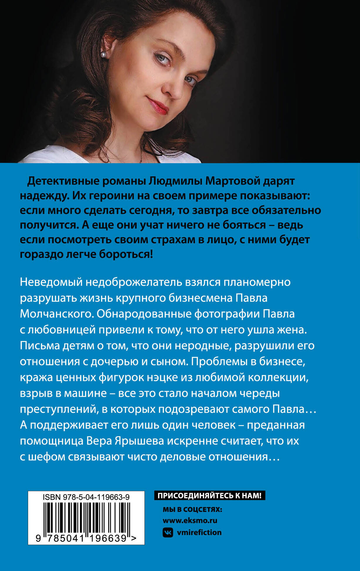 Неведомый недоброжелатель взялся планомерно разрушать жизнь крупного бизнесмена Павла Молчанского. Обнародованные фотографии Павла с любовницей привели к тому, что от него ушла жена. Письма детям о том, что они неродные, разрушили его отношения с дочерью и сыном. Проблемы в бизнесе, кража ценных фигурок нэцкэ из любимой коллекции, взрыв в машине - все это стало началом череды преступлений, в которых подозревают самого Павла… А поддерживает его лишь один человек - преданная помощница Вера Ярышева искренне считает, что их с шефом связывают чисто деловые отношения… Людмила Мартова - мастер увлекательной детективной мелодрамы, автор захватывающих остросюжетных историй. Их отличает закрученная детективная интрига, лихой финал с неожиданной развязкой и, конечно же, яркая любовная линия. Героини романов Людмилы Мартовой - современные молодые женщины, которые точно знают, чего хотят от жизни.| Издательство | ООО "Издательство "Эксмо" |