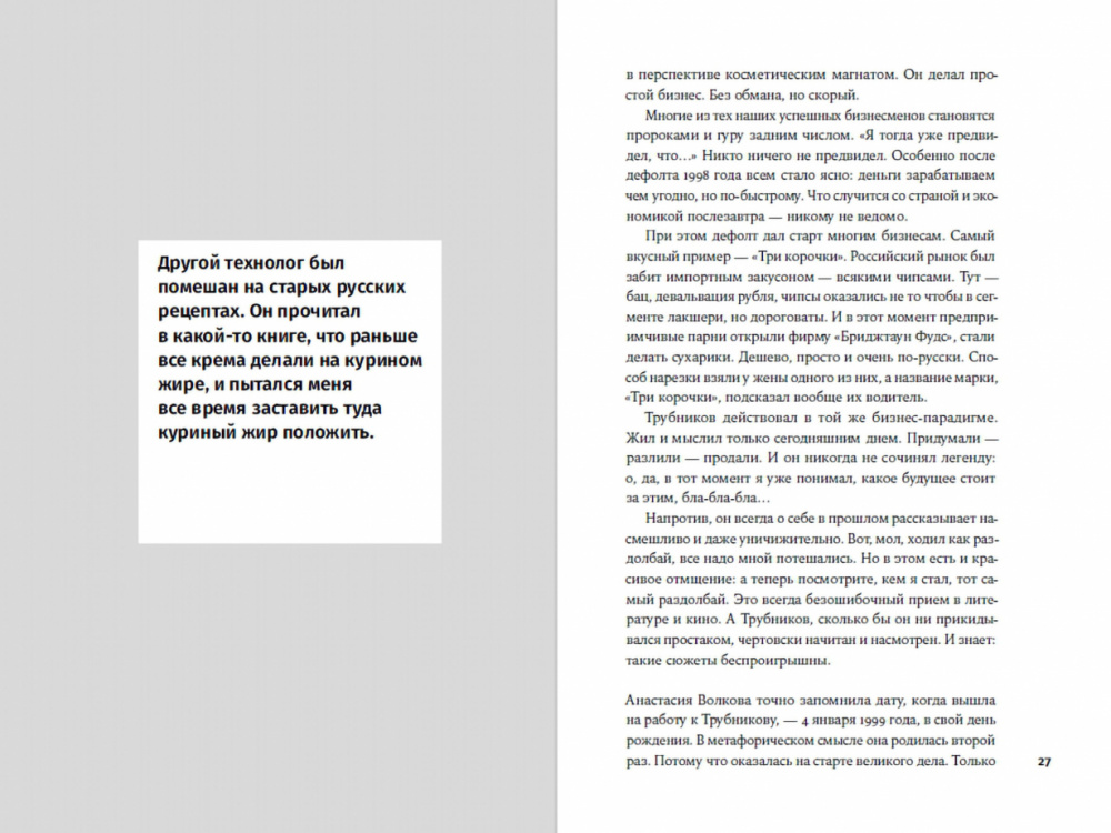 - Автор показывает «внутреннюю кухню» работы компании, раскрывая тайны появления на свет брендов, любимых миллионами россиян. Алексей Беляков честно и с юмором описывает формирование команды, различные ухищрения, на которые приходилось идти Андрею Трубникову ради продвижения своей продукции.