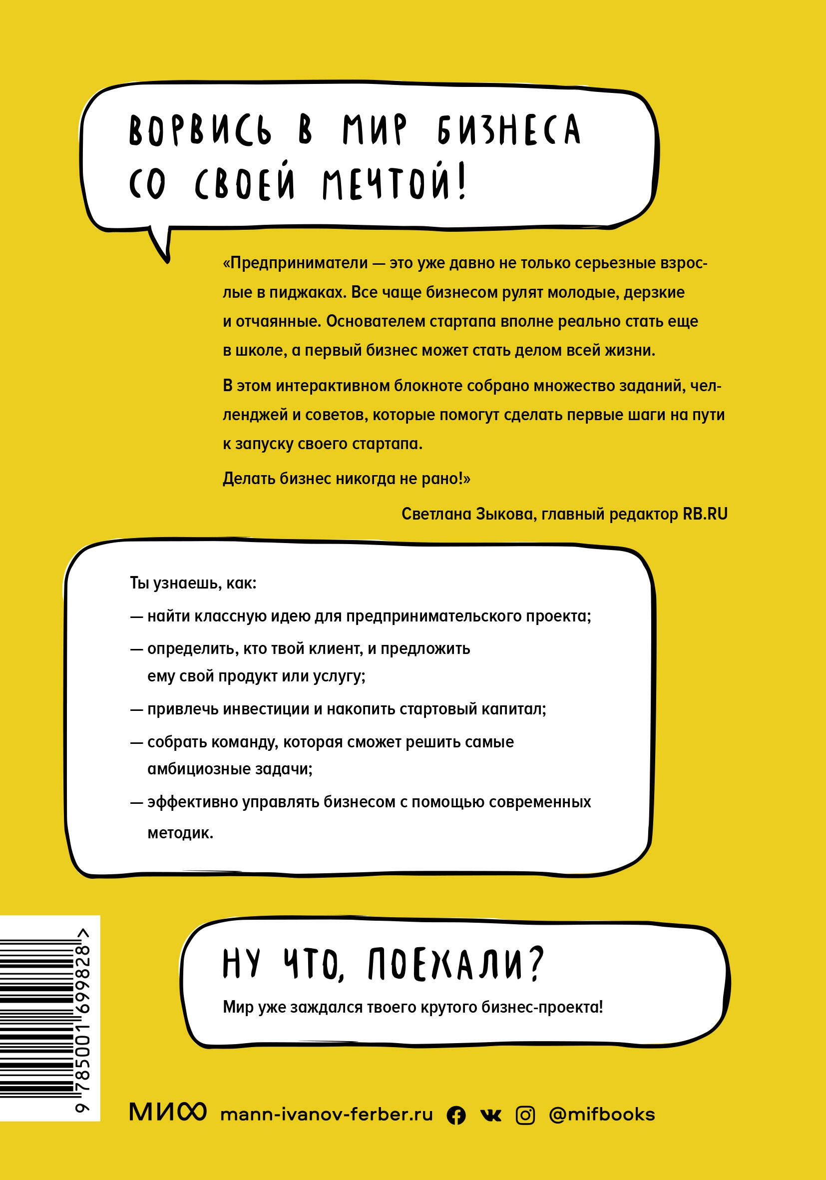 Этот интерактивный блокнот с упражнениями и лайфхаками поможет подростку понять, что такое предпринимательство, как оно работает и какими навыками должен обладать современный бизнесмен. Читатель пройдет путь от поиска идеи до создания бизнес-плана и сделает первые шаги к воплощению мечты - запуску собственного стартапа. Конкретные рекомендации (как провести SWOT-анализ, определить рыночную цену продукта, подготовить презентацию для инвесторов) представлены в виде заданий и челленджей. Поэтому подростков ждет не только теория, но и возможность опробовать знания на практике. А результатом работы станет бизнес-идея, которую можно воплотить в жизнь. Для кого эта книга: Для подростков от 12 лет, которые мечтают зарабатывать на собственном бизнесе. Для родителей и педагогов, которые хотят научить ребенка основам предпринимательства, дать знания для открытия и раскрутки проекта. Для всех, кто мечтает запустить свое дело и хочет научиться прорабатывать бизнес-идею.| Издательство | МАНН, ИВАНОВ И ФЕРБЕР ООО |