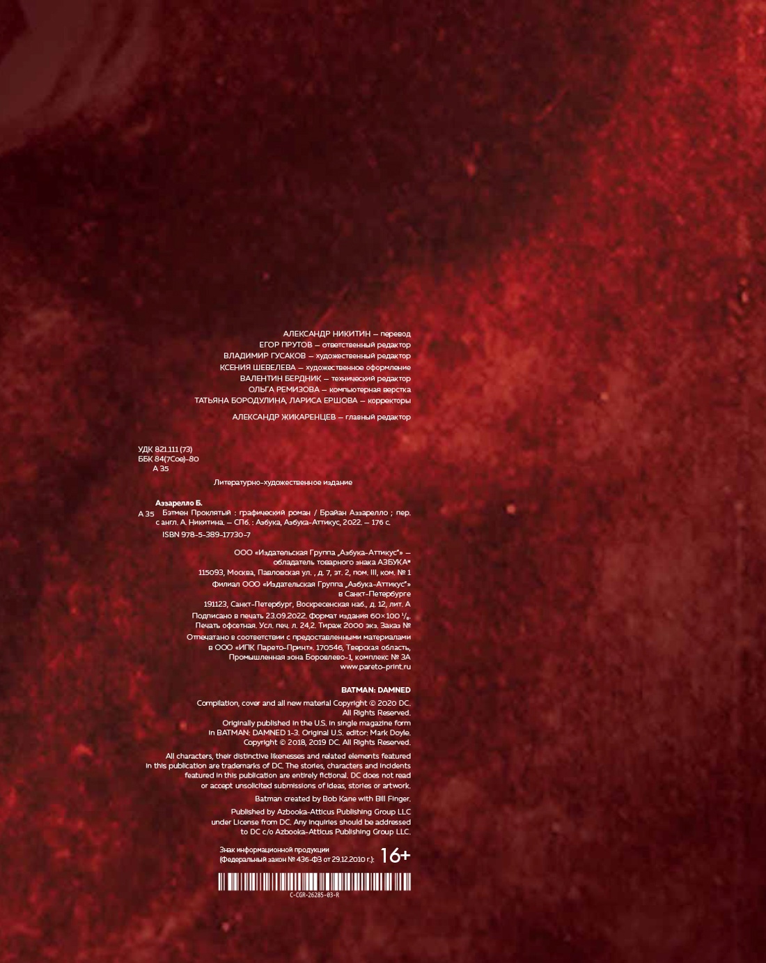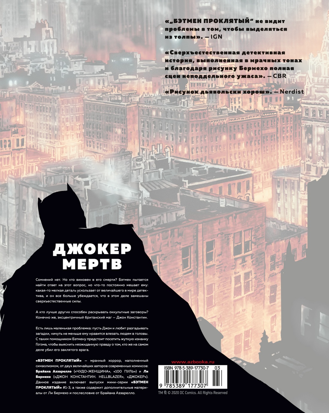 ДЖОКЕР МЕРТВ. Сомнений нет. Но кто виновен в его смерти? Бэтмен пытается найти ответ на этот вопрос, но что-то постоянно мешает ему: какая-то мелкая деталь ускользает от величайшего в мире детектива, и он все больше убеждается, что в этом деле замешаны сверхъестественные силы. А кто лучше других способен раскрывать оккультные заговоры? Конечно же, эксцентричный британский маг - Джон Константин. Есть лишь маленькая проблемка: пусть Джон и любит разгадывать загадки, ничуть не меньше ему нравится влезать людям в головы. С таким помощником Бэтмену предстоит посетить жуткую изнанку Готэма, чтобы выяснить неожиданную правду о том, кто же на самом деле убил его заклятого врага. Издание включает выпуски мини-серии «БЭТМЕН ПРОКЛЯТЫЙ» №1-3, а также содержит дополнительные материалы от Ли Бермехо и послесловие от Брайана Аззарелло.| Издательство | Азбука |