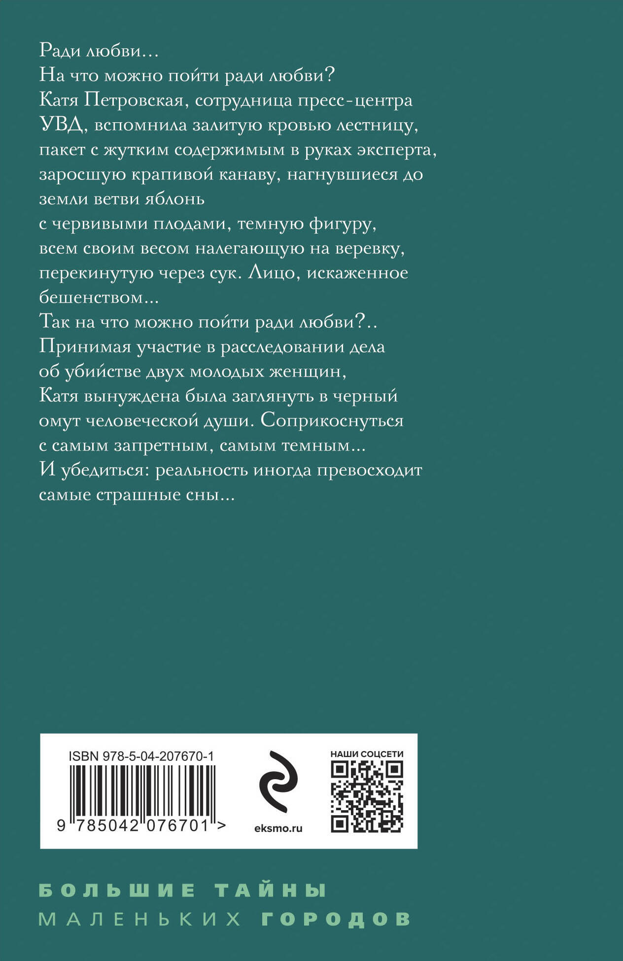 Ради любви... На что можно пойти ради любви? Катя Петровская, сотрудница Пресс-центра УВД, вспомнила залитую кровью лестницу, пакет с его жутким содержимым в руках эксперта, заросшую крапивой канаву, нагнувшиеся до земли ветви яблонь с червивыми плодами, темную фигуру, всем своим весом налегающую на веревку, перекинутую через сук. Лицо, искаженное бешенством… Так, на что можно пойти ради любви?.. Принимая участие в расследовании дела об убийстве двух молодых женщин, Кате пришлось заглянуть в черный омут человеческой души. Соприкоснуться с самым запретным, самым темным… И убедиться - реальность иногда превосходит самые страшные сны… Достоверность, психологизм и напряжение - три главных принципа, на которых строит свои детективы подполковник полиции Татьяна Степанова. Преступник хитер и неуловим, одна версия сменяет другую, эмоции - на пределе. А разгадка - всегда неожиданна. Романы Татьяны Степановой пугают и завораживают, интригуют и очаровывают. Неповторимый сюжет, эксклюзивный материал и глубокий психологизм неожиданно и органично переплетаются с элементами мистики и триллера.| Издательство | ООО "Издательство "Эксмо" |